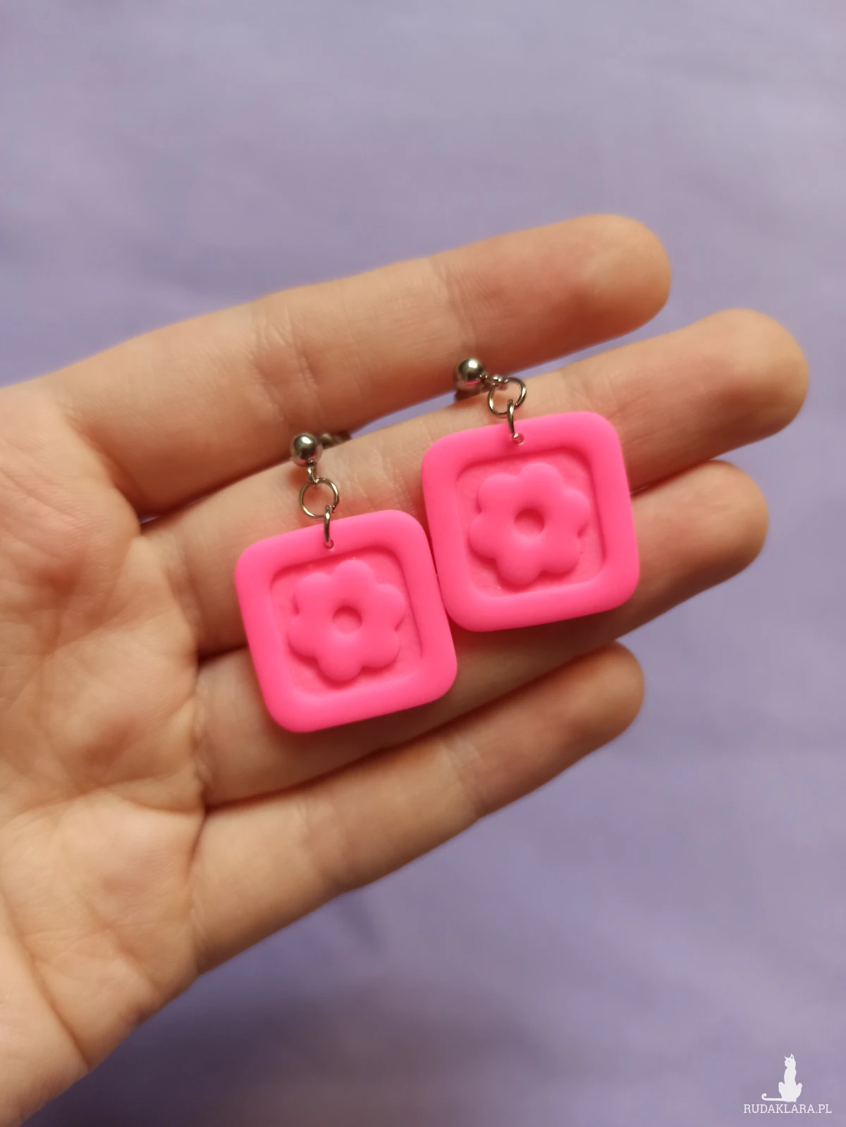 Kolczyki wiszące w kształcie kwadratów z kwiatkami w środku. W neonowym odcieniu różowego.