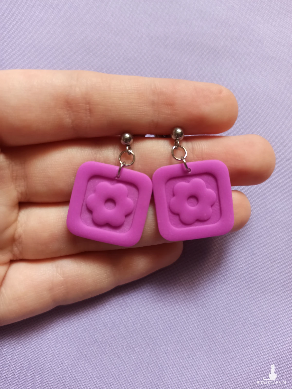 Kolczyki wiszące w kształcie kwadratów z kwiatkami w środku. W neonowym odcieniu fioletowego.