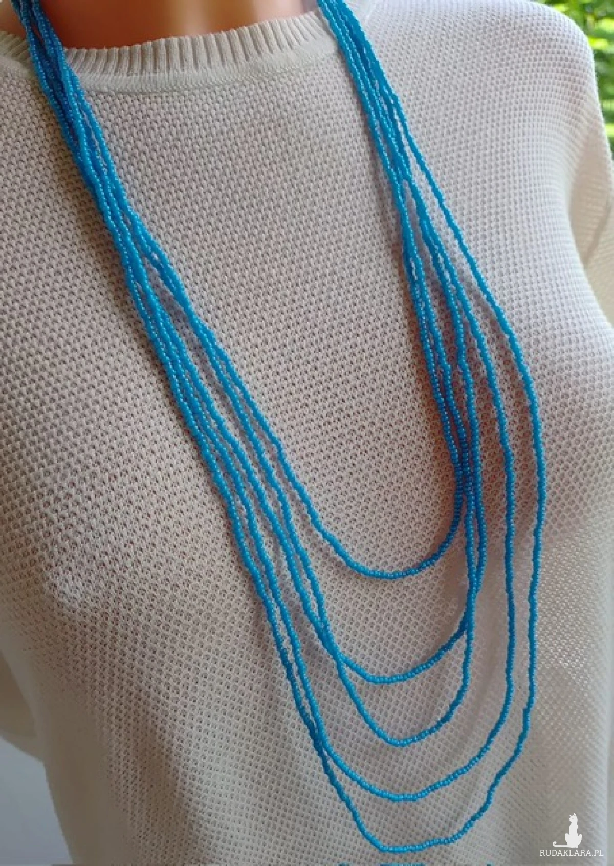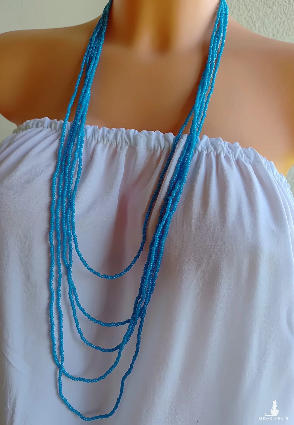 Naszyjnik długi kaskadowy z niebieskich koralików, długość najdłuższego sznura 47 cm, bez zapięcia, zakładany przez głowę, szkło,nici bawełniane,