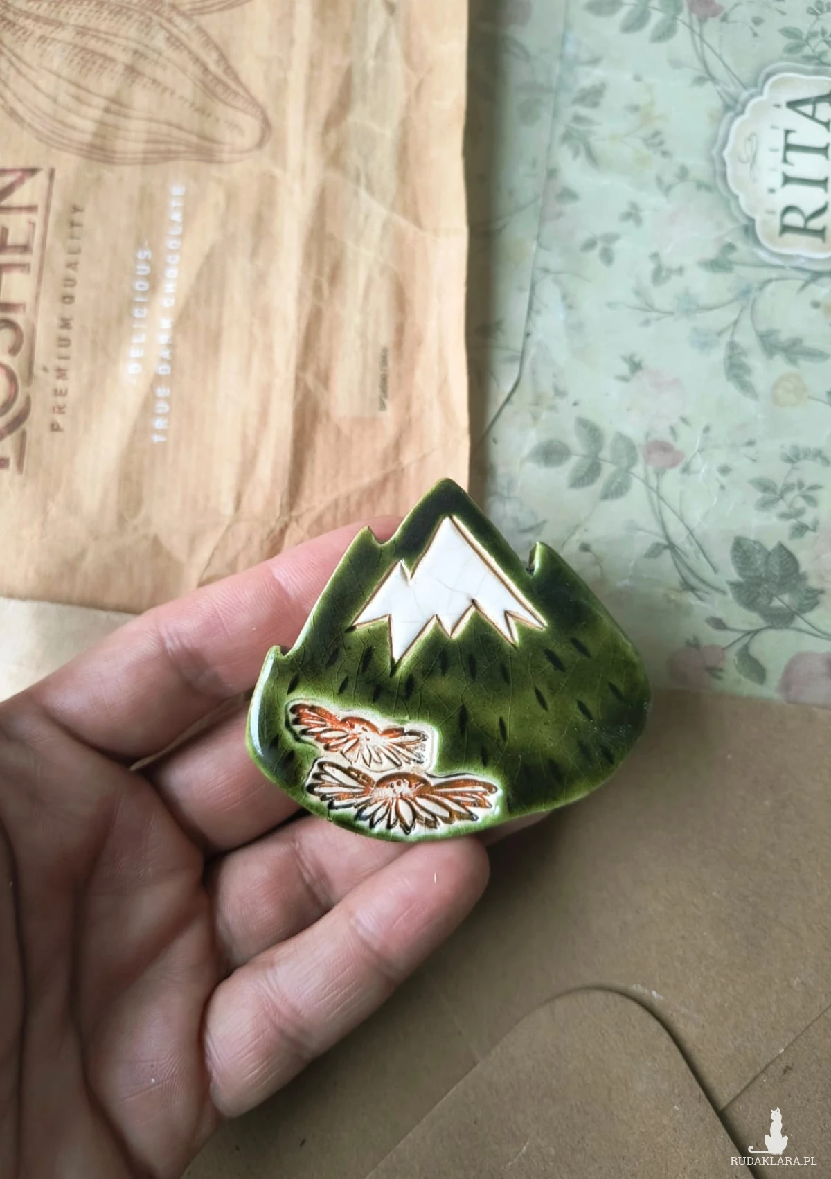 Przypinka w postaci szczytów dla miłośników górskich wędrówek. Wymiary ok 5 cm x 6,5 cm. Polecam serdecznie. Możliwość zamiany zapięcia na magnes.