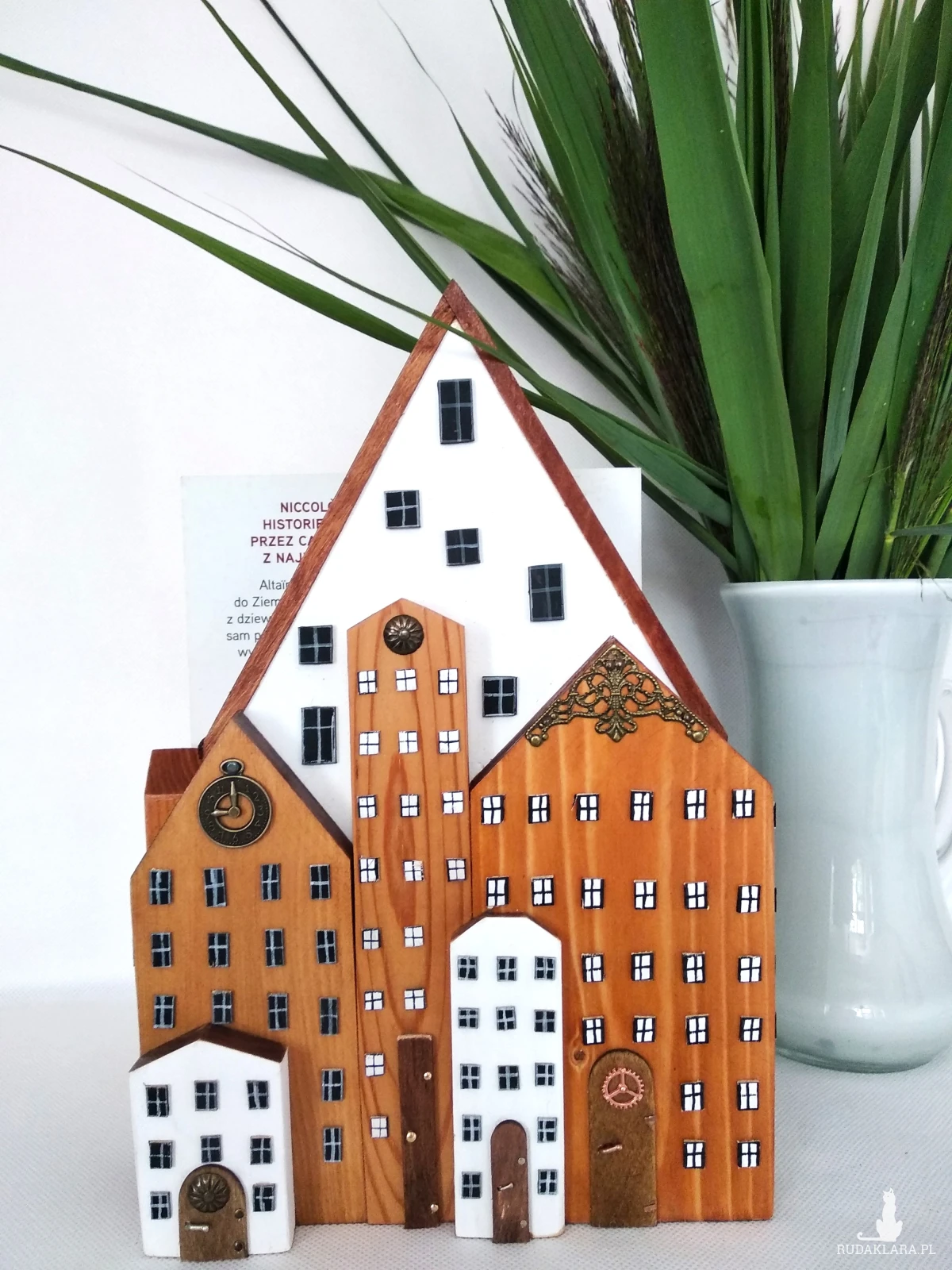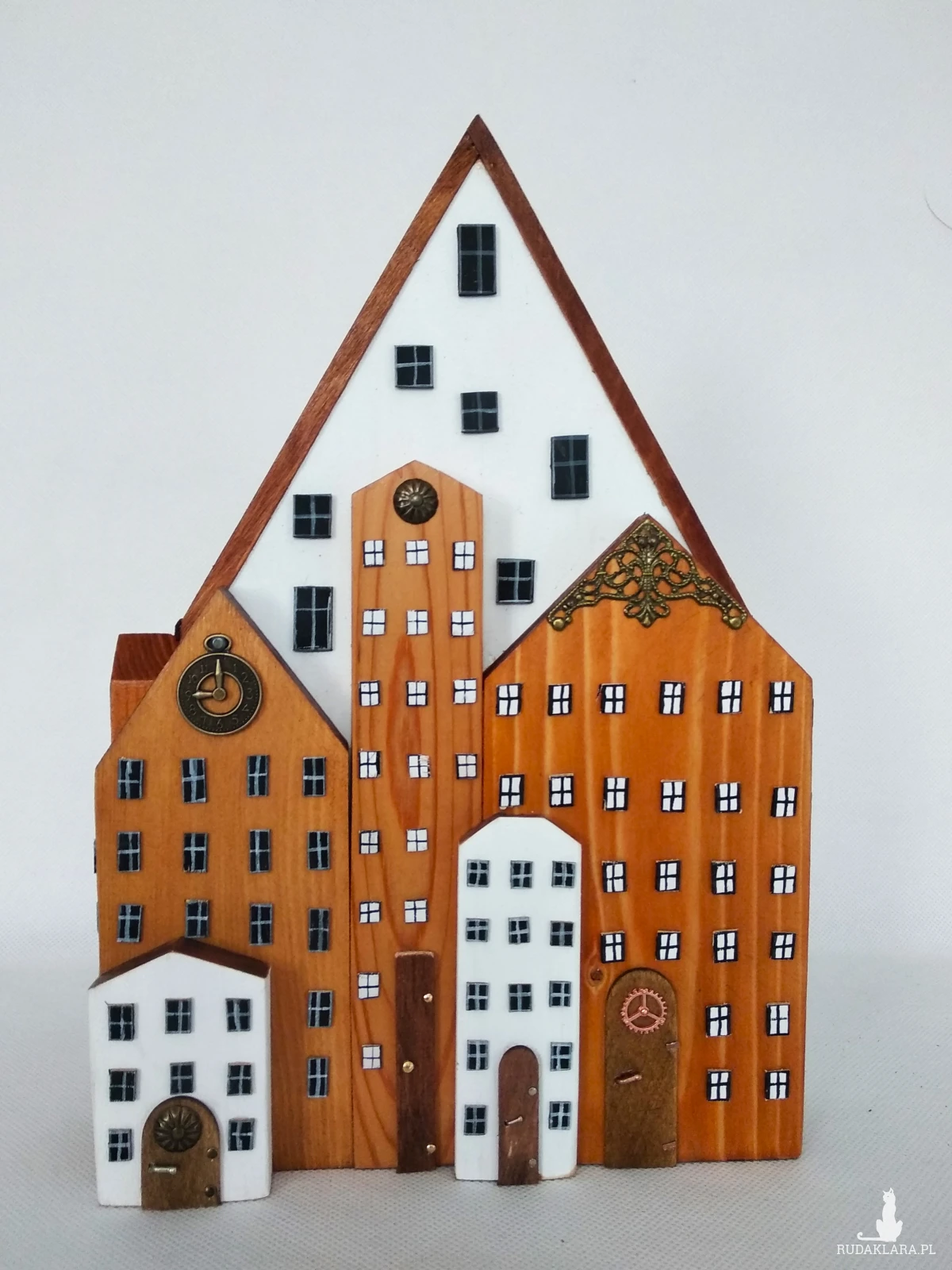 Wykonana została z różnego rodzaju drewna, w kształcie malowniczego miasteczka, dodając ciepła i charakteru każdemu wnętrzu. Każdy domek jest starannie wykończony, a ciepłe kolory nadają całości wyjątkowego uroku. Część domków pozostała w naturalnej barwie drewna, inne delikatnie zabarwione bejcą wodną, nie tracąc przy tym naturalnego wzoru drewna. Podstawa i dwa małe domki pomalowane zostały akrylową białą farbą. Cała podpórka pokryta jest akrylowym lakierem bezbarwnym dla zabezpieczenia drewna i jego barwy