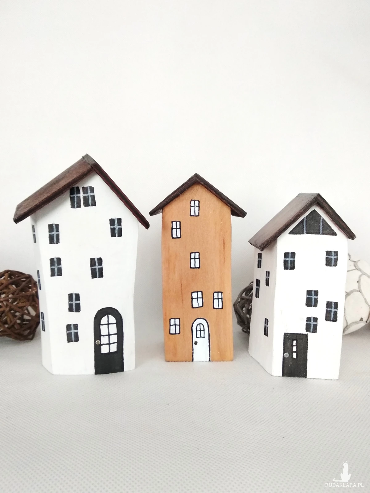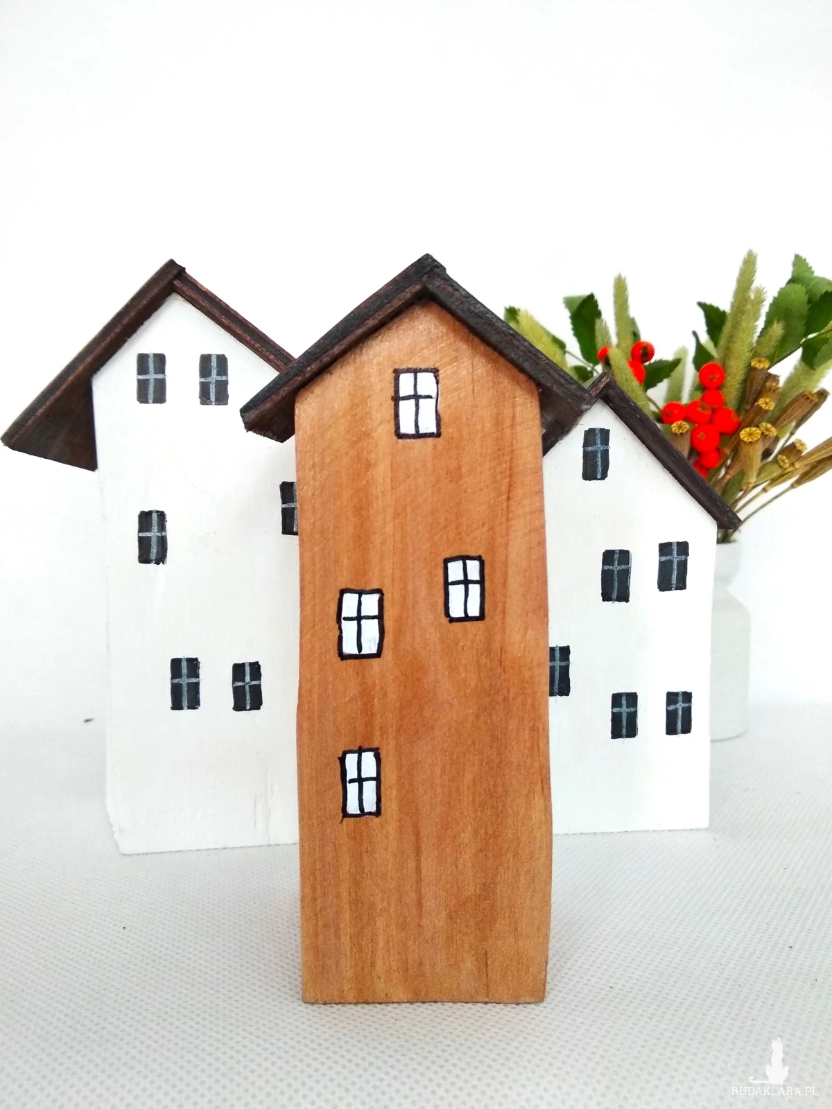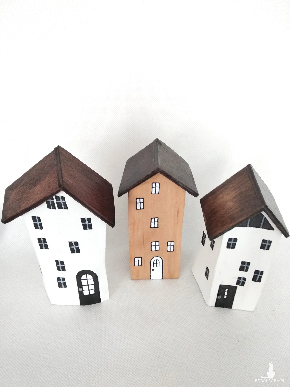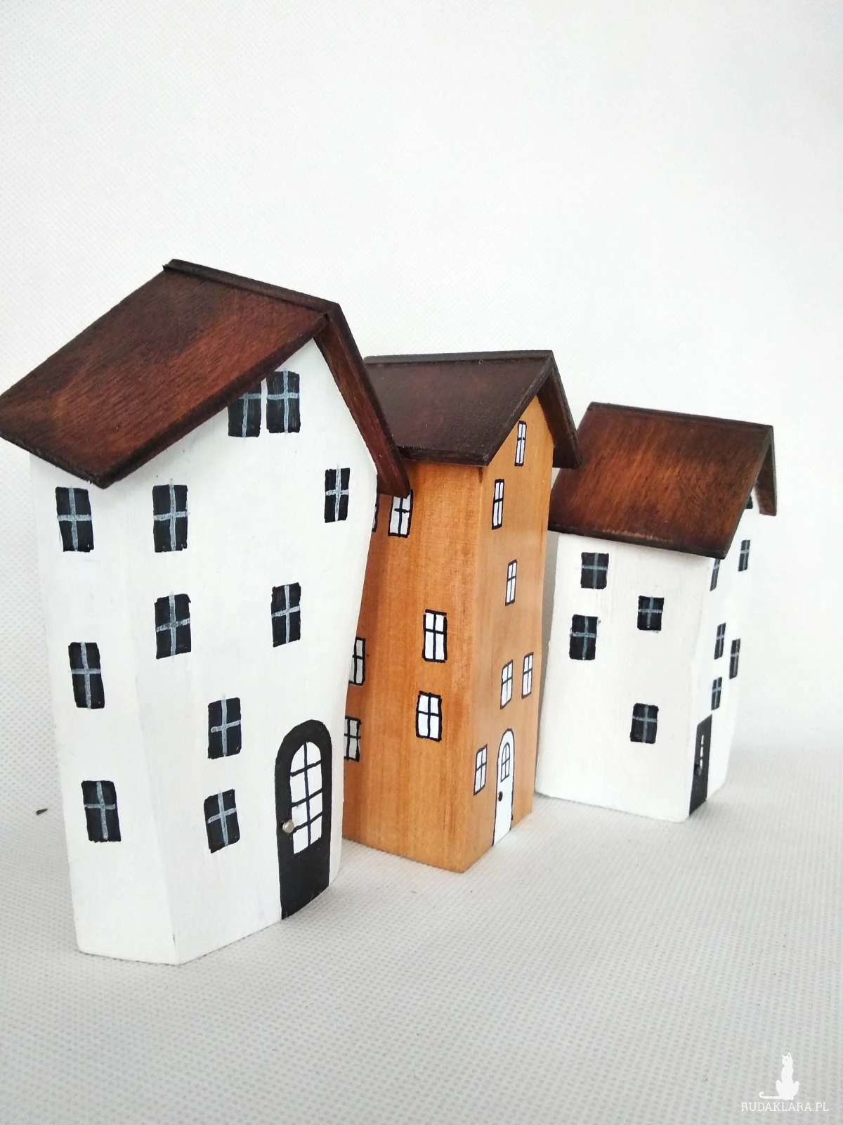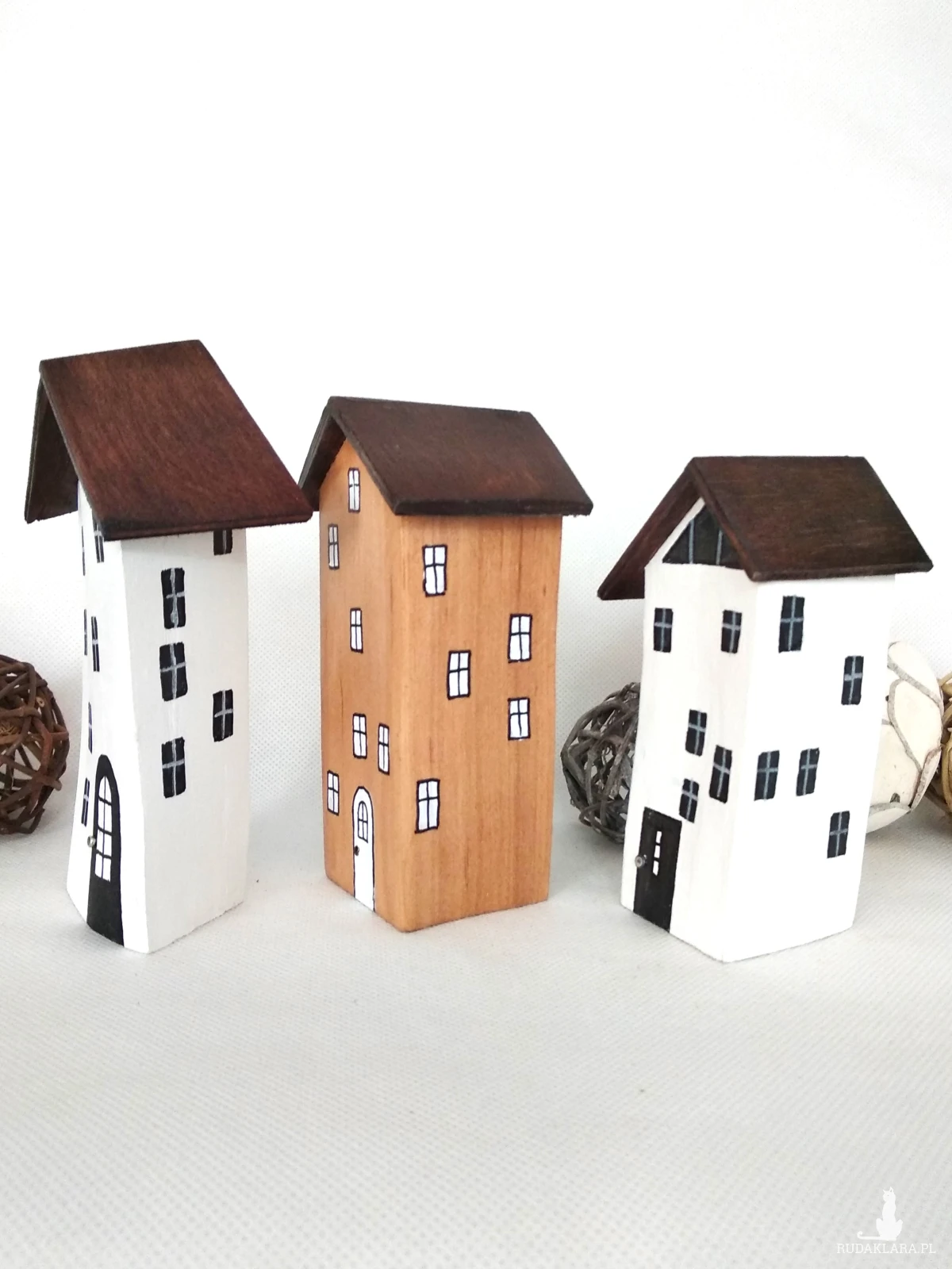 Trzy dekoracyjne domki wykonane z drewna bukowego. Dwa domki malowane są akrylową białą farbą a trzeci pozostawiony w naturalnej barwie drewna zabezpieczony akrylowym satynowym lakierem. Dachy domków barwione bejcą wodną i zabezpieczone lakierem. Domki posiadają okienka z każdej strony, dlatego można je ustawić w dowolnej konfiguracji. Nieregularny kształt domków wynikający z naturalnego ułożenia słojów, nadaje im ciekawego i niepowtarzalnego wyglądu. Domki są bardzo oryginalną ozdobą każdego wnętrza. Bardzo ładnie prezentują się na parapecie okna, komodzie, półce i w każdym innym miejscu.
