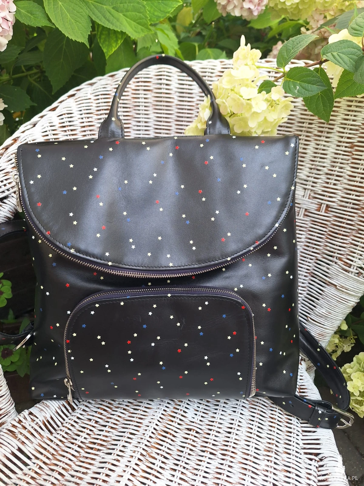 UNIKATOWY TORBO - PLECAK z czarnej skóry bydlęcej w malutkie czerwone, niebieskie i białe gwiazdeczki.