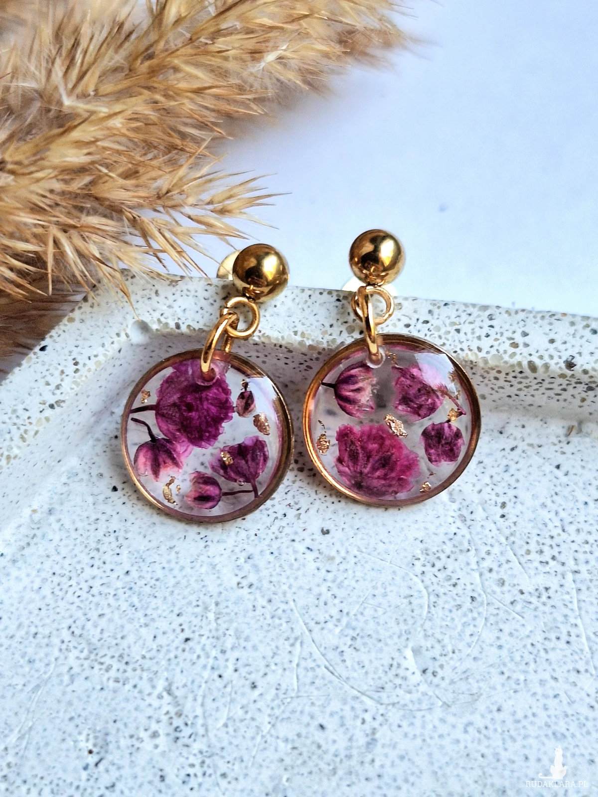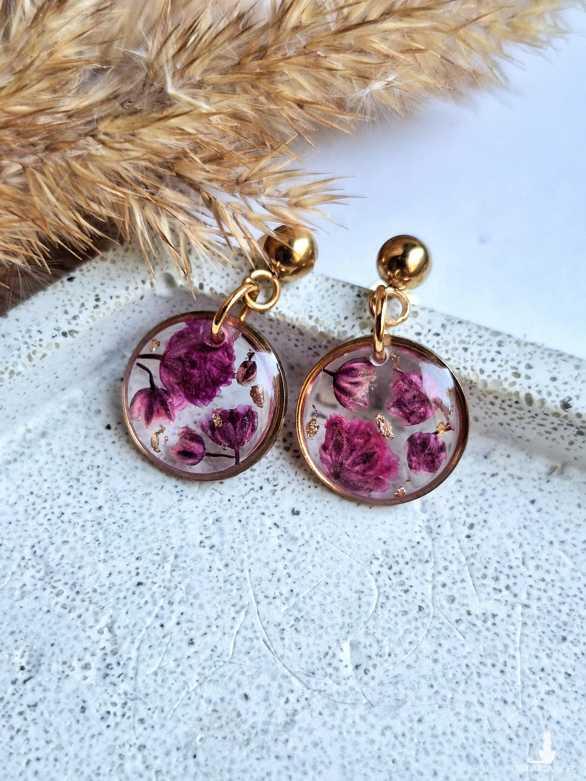 Urocze kolczyki z zatopionymi kwiatami fioletowej gipsówki i płatkami złota. Wykonane z wysokiej klasy żywicy, która nie zmienia koloru pod wpływem promieniowania UV oraz wysokiej jakości stali chirurgicznej.