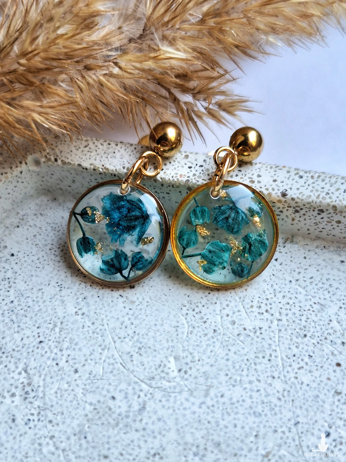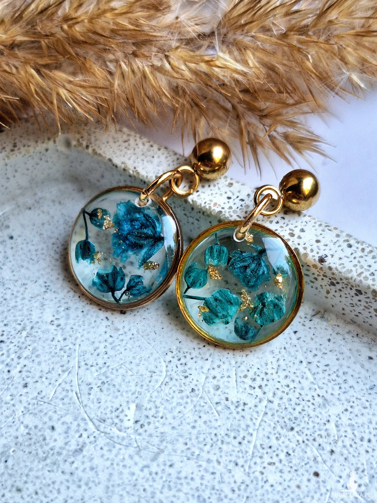 Urocze kolczyki z zatopionymi kwiatami gipsówki w morskim kolorze i płatkami złota. Wykonane z wysokiej klasy żywicy, która nie zmienia koloru pod wpływem promieniowania UV oraz wysokiej jakości stali chirurgicznej.