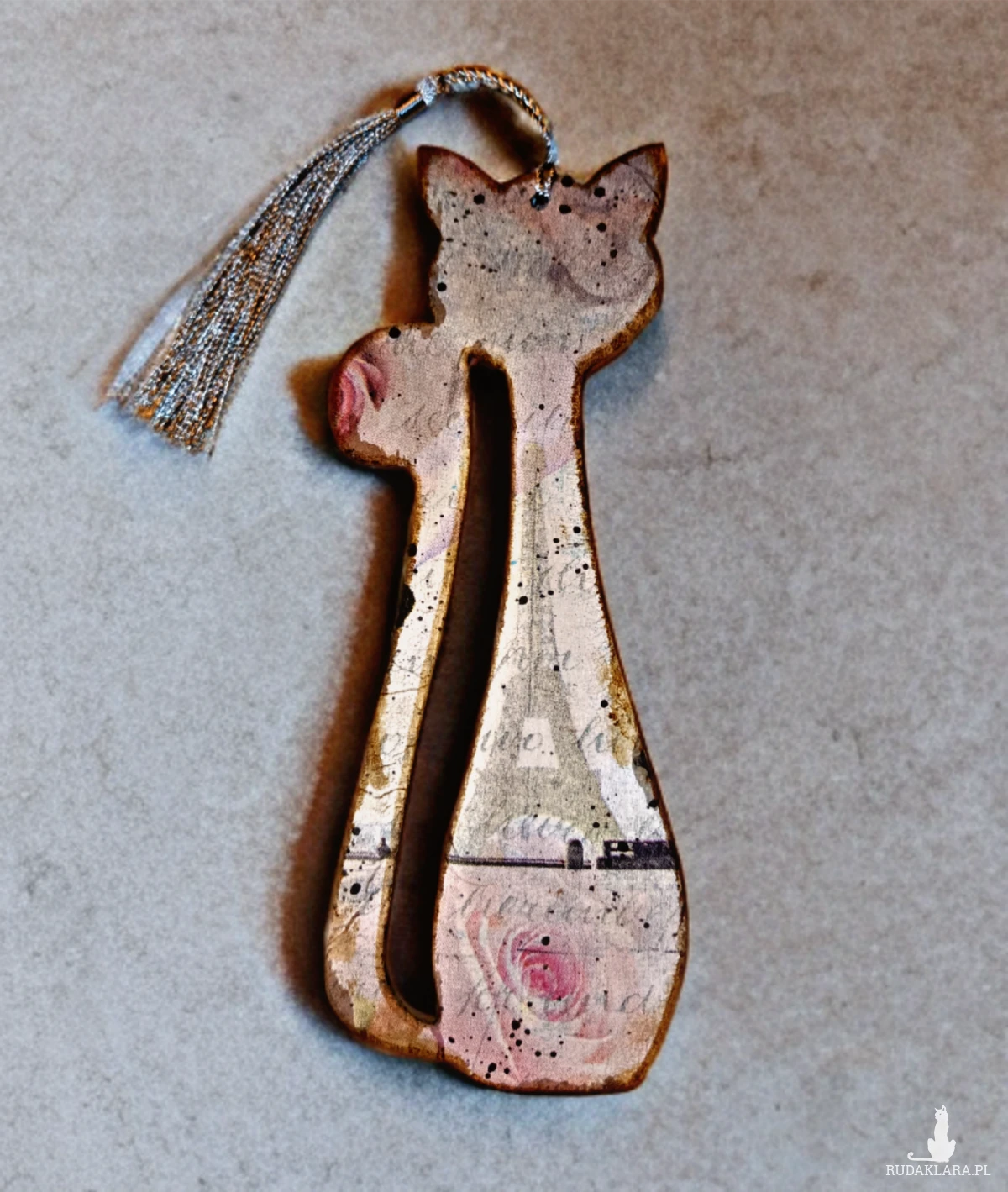 Drewniana zakładka do książki w kształcie kota, zdobiona dwustronnie techniką decoupage.