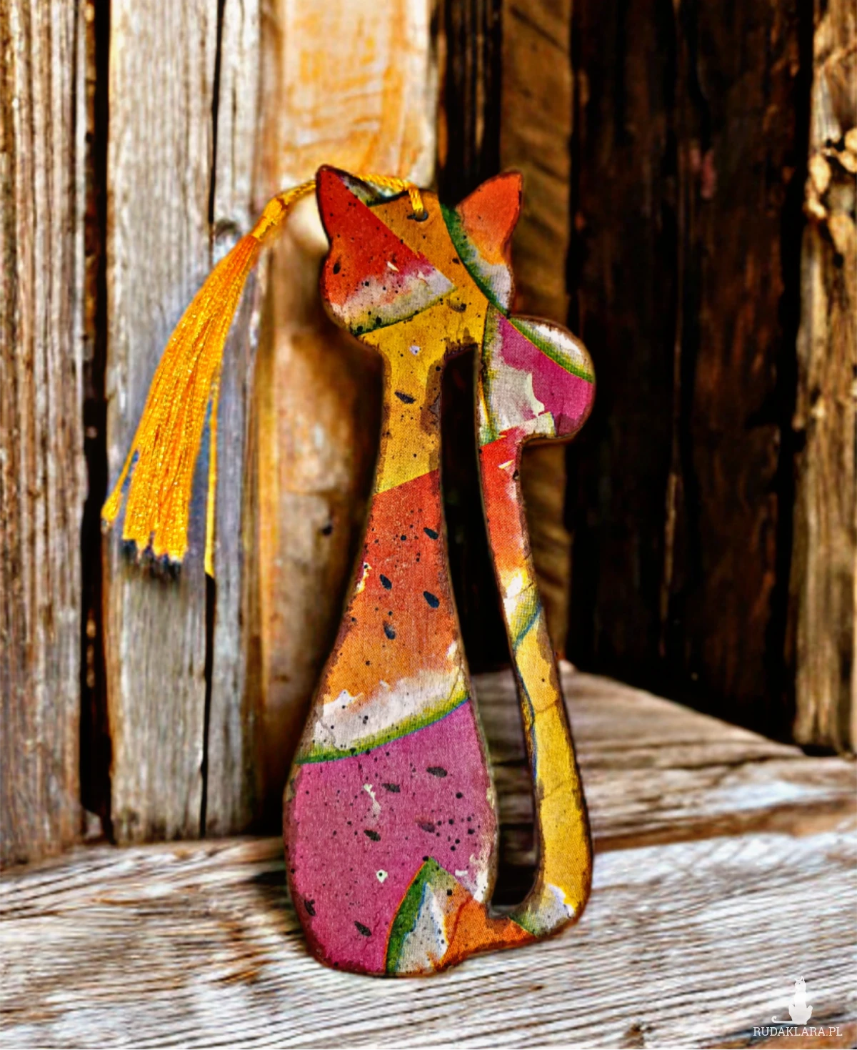 Drewniana zakładka do książki w kształcie kota, zdobiona dwustronnie techniką decoupage.