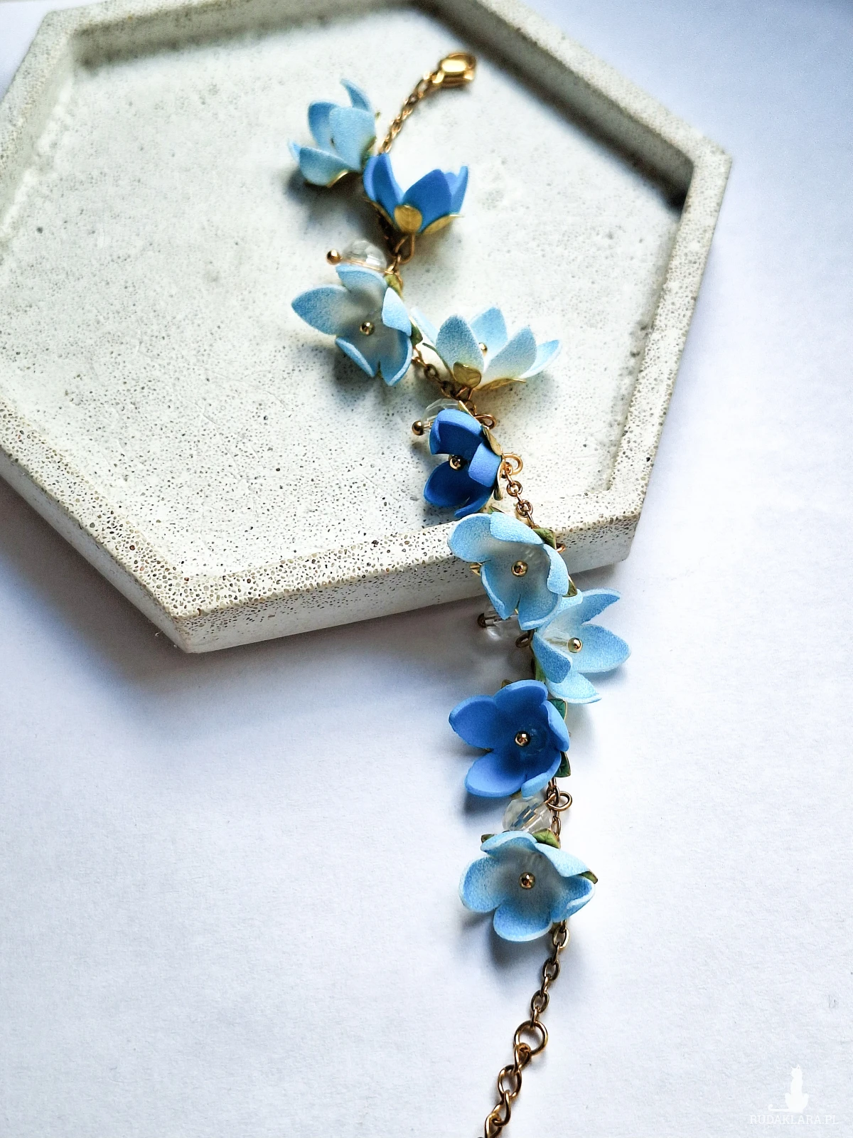 Zachwycająca bransoletka w formie kaskady kwiatów w odcieniach błękitu i błyszczących kryształków. Każdy element został starannie wykonany ręcznie.