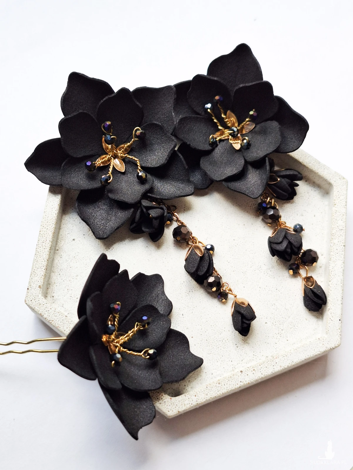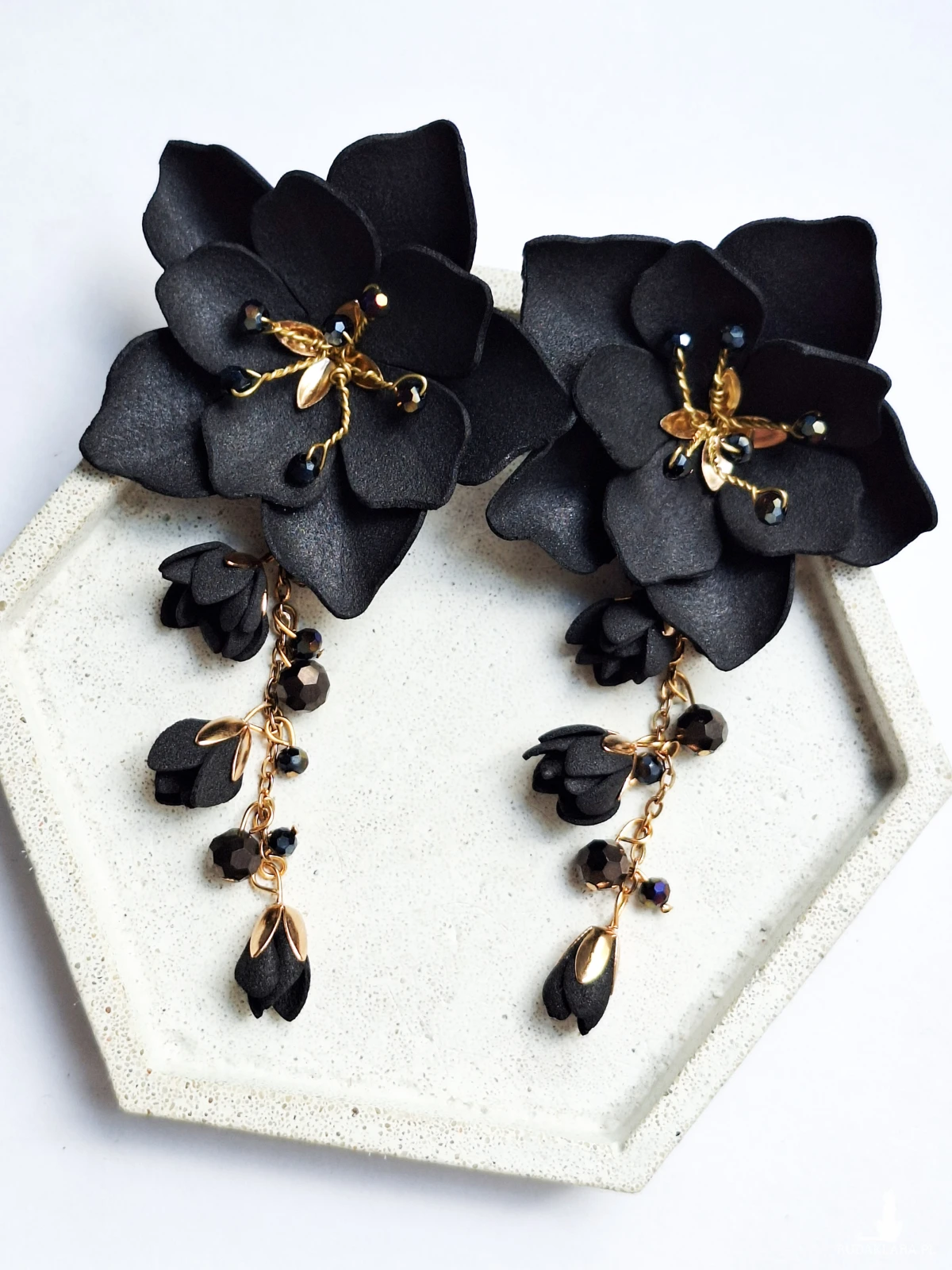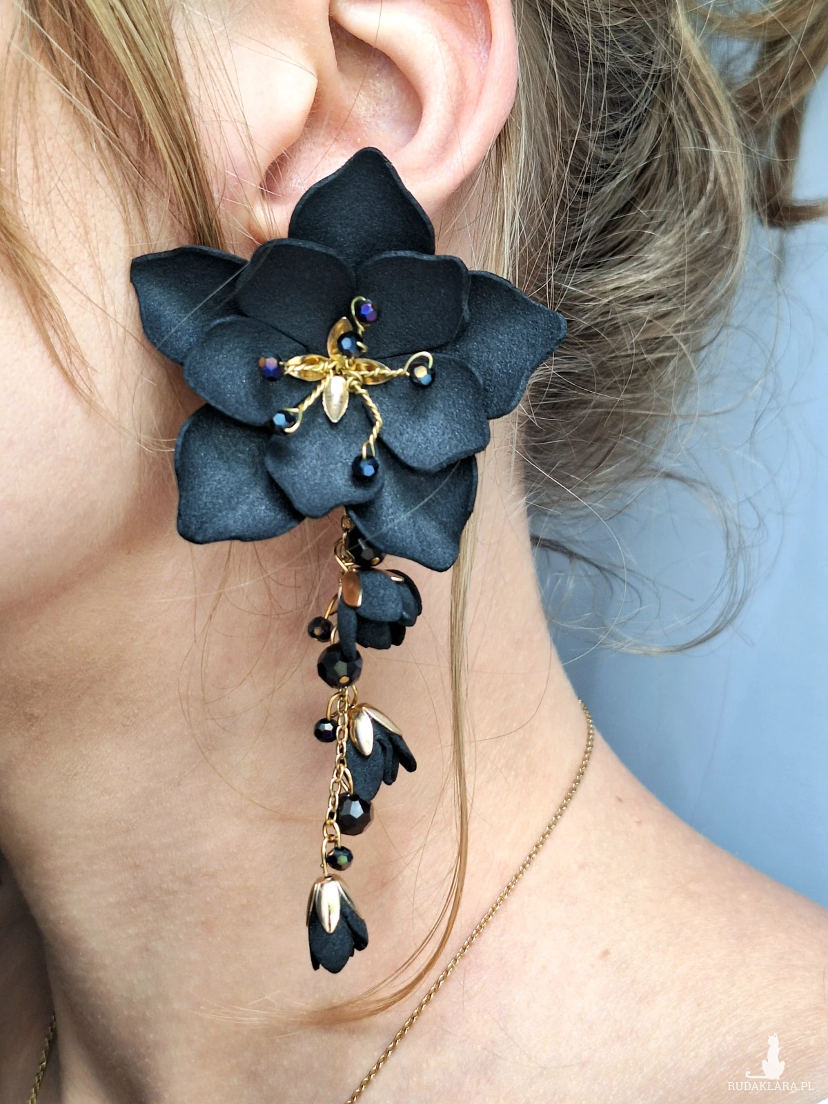Trójwymiarowe kwiaty zostały stworzone z lekkiego, aksamitnego foamiranu – dzięki temu kolczyki są nie tylko spektakularne, ale też niezwykle komfortowe w noszeniu. Kaskadowe zawieszki z drobnych koralików i złotych elementów nadają im ruch i elegancką lekkość.