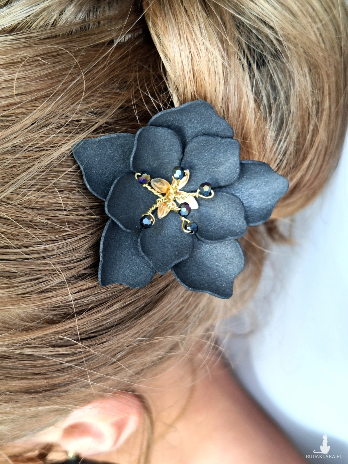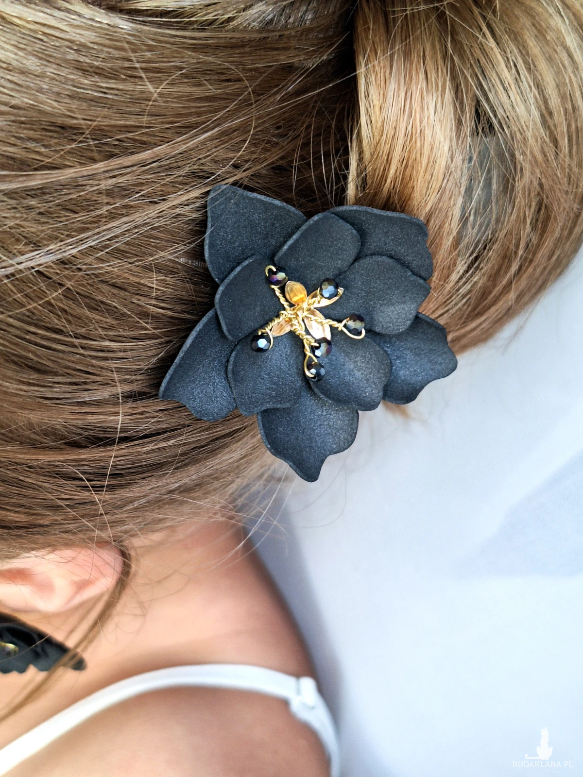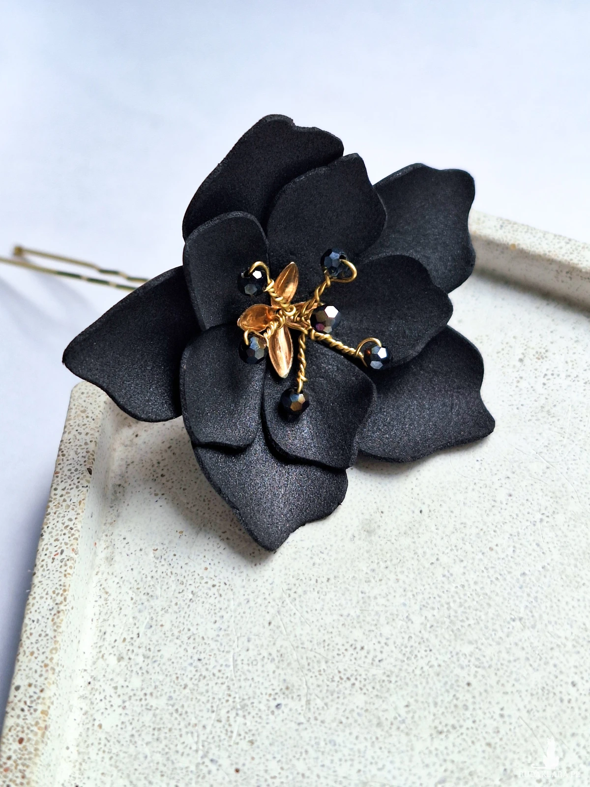 Dodaj swojej fryzurze nutę zmysłowego luksusu dzięki tej wyjątkowej, ręcznie robionej spince. Czarne, matowe płatki tworzą efektowny, trójwymiarowy kwiat, który olśniewa elegancją i starannym wykonaniem. Złote detale i połyskujące, czarne kryształki dodają jej blasku, przyciągając spojrzenia przy każdym ruchu.