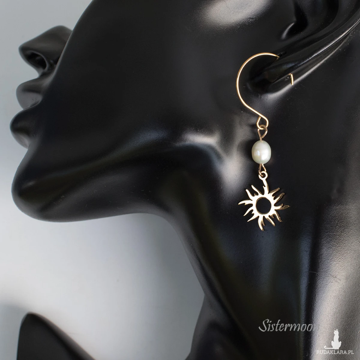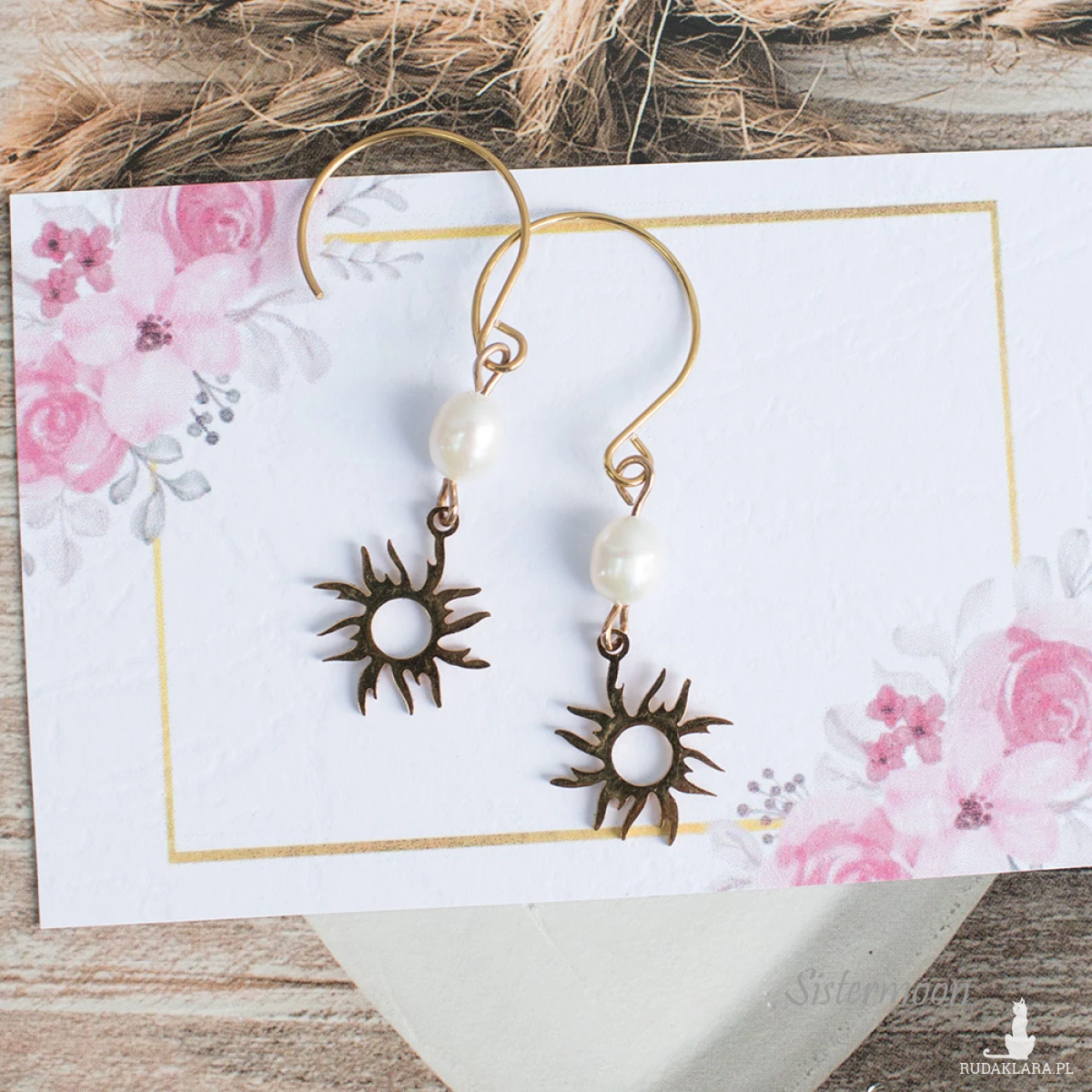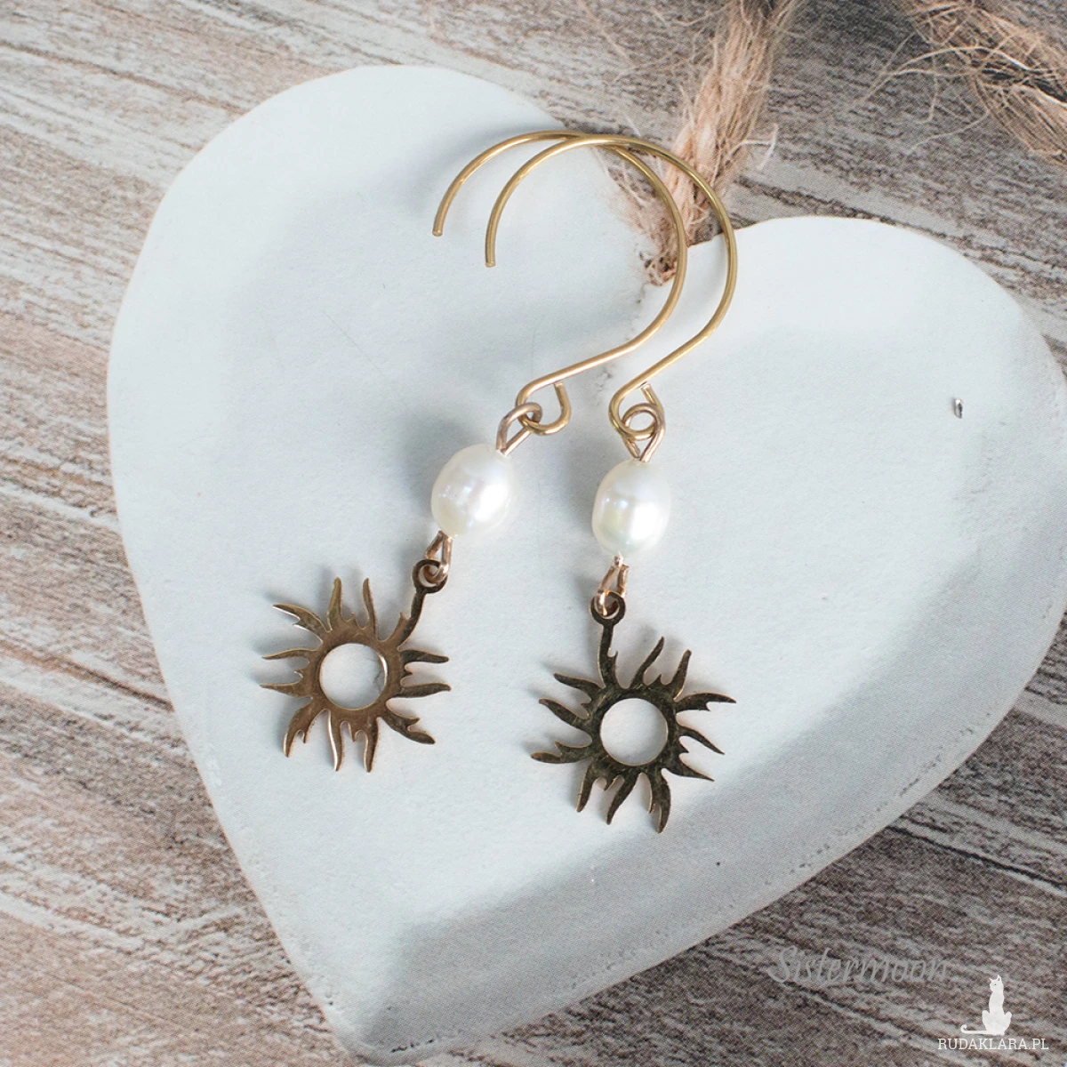 Komplet bransoletka i kolczyki Słońce, supermodny element roku 2025. Kolczyki lekkie i delikatne, z perełkami rzecznymi, hematytami i granatami, na bazie stali szlachetnej. Bransoletka na bazie złotego metalicznego sznureczka, z przesuwnymi zapięciami makramowymi (węzeł przesuwny):