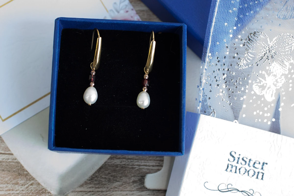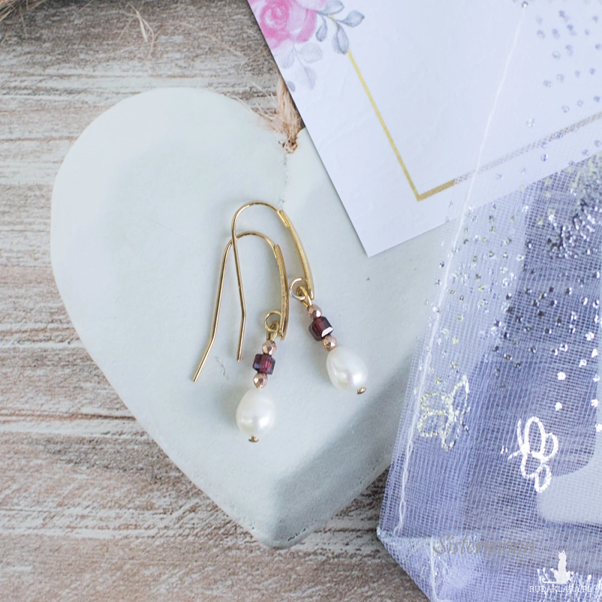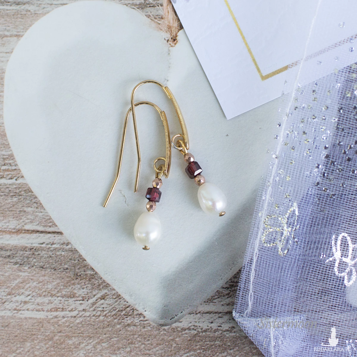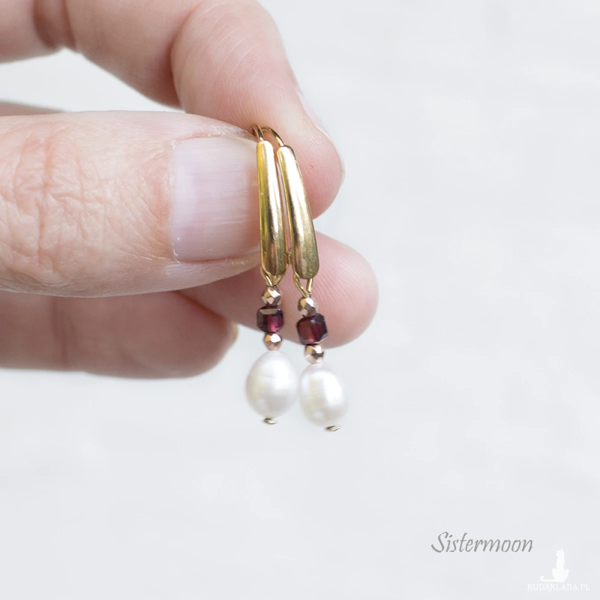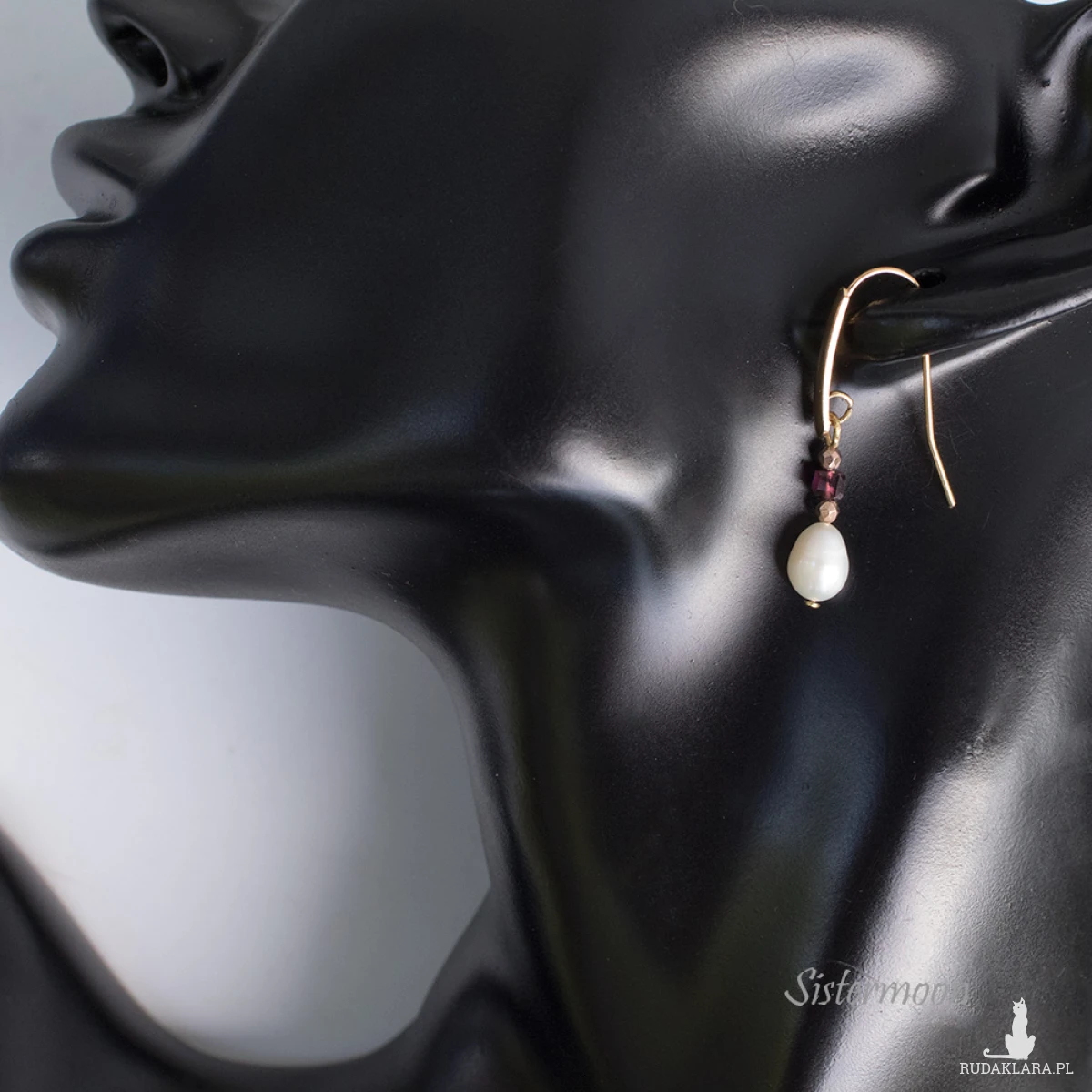 Kolczyki Perły i Granaty. Kolczyki nieduże, lekkie i delikatne, eleganckie, z perełkami rzecznymi, hematytami i granatami, wykonane na bazie stali szlachetnej. Bigle otwarte.