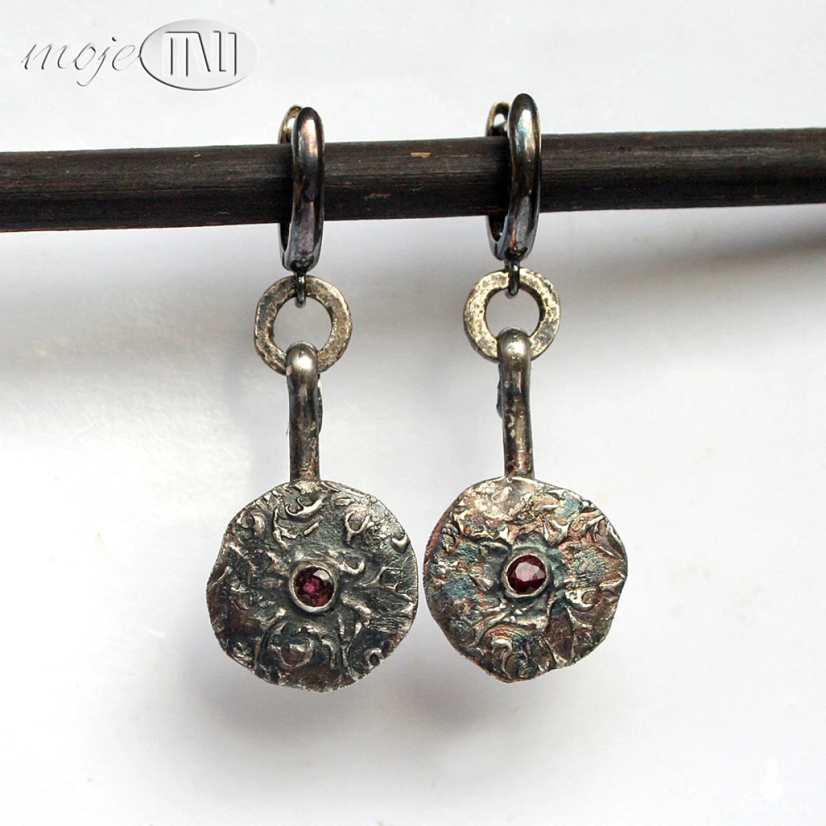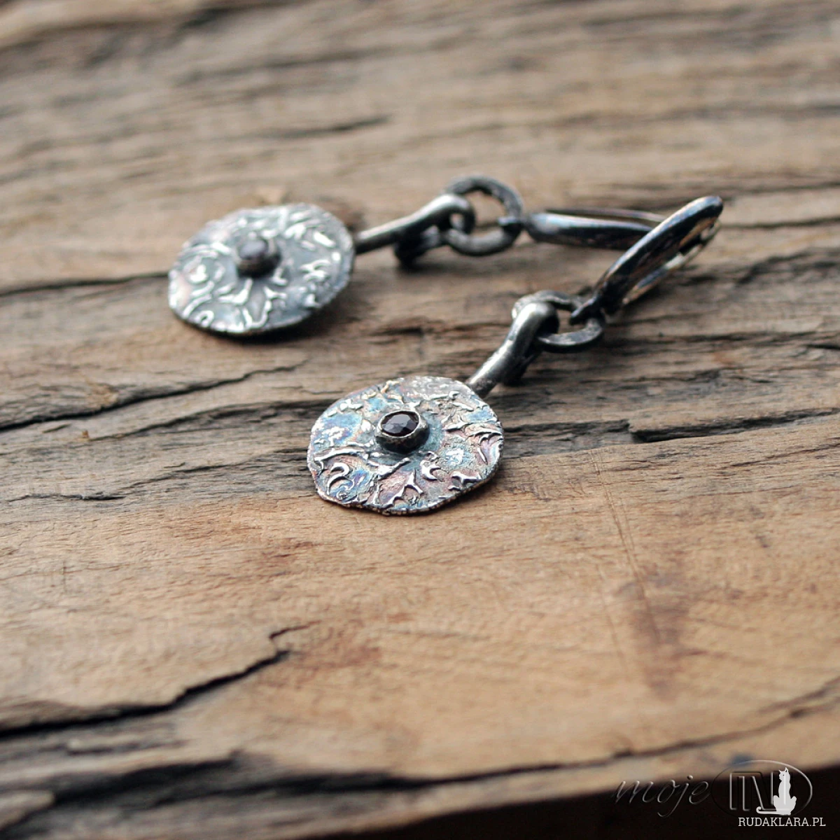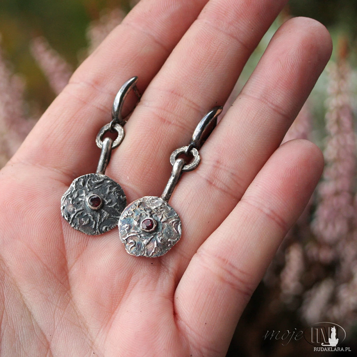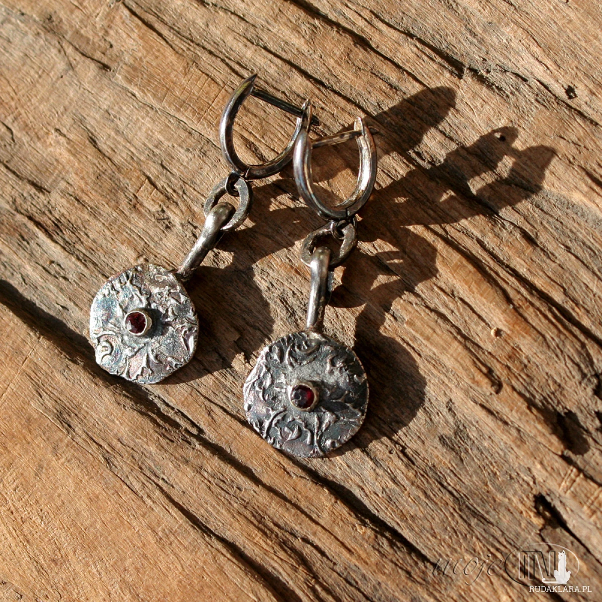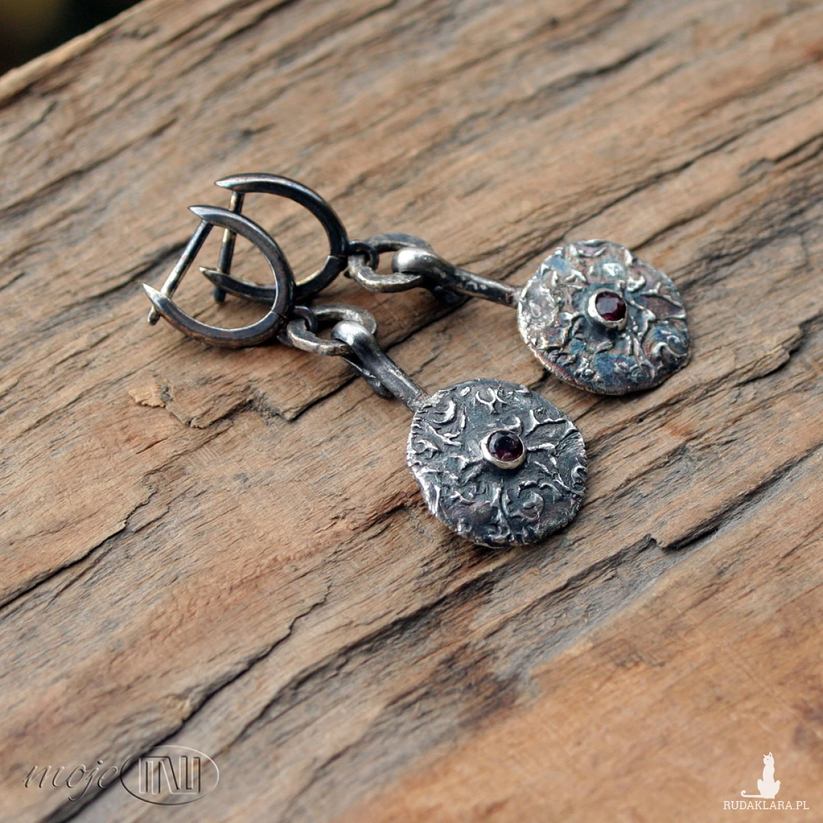 Kolczyki ze srebra wysokiej próby i fasetowanych granatów. Srebro jest oksydowane i przecierane dla wydobycia faktury. Zawieszone na zapinanych biglach-kajdankach ze srebra 925.