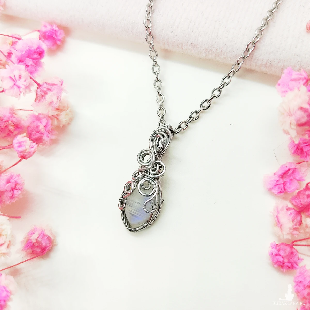 Naszyjnik Kamień Księżycowy ręcznie robiony. Wykonany techniką wire wrapping z drutów ze stali chirurgicznej.