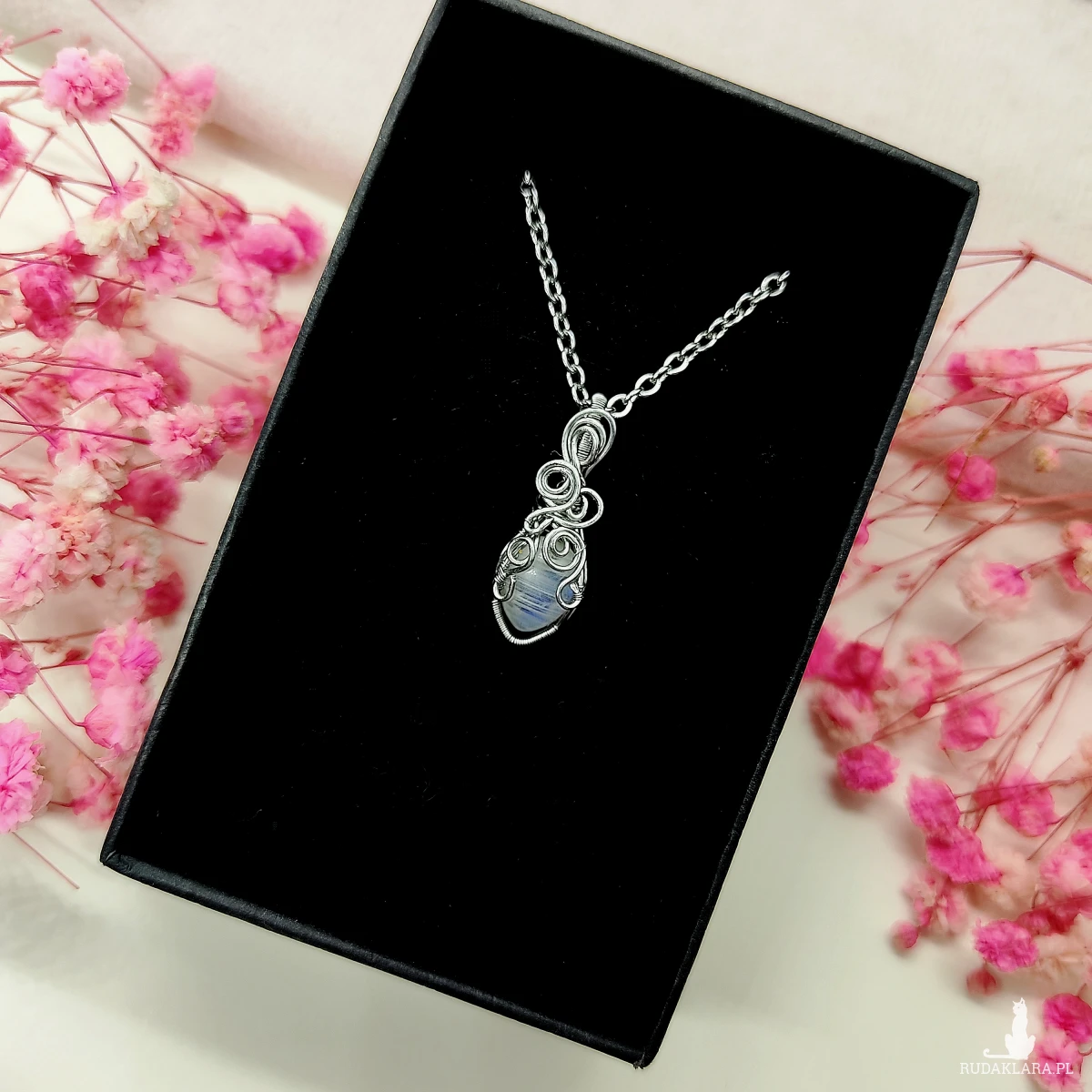 Naszyjnik został wykonany ręcznie z wysokiej jakości stali chirurgicznej, która zapewnia jego trwałość oraz odporność na korozję. Dzięki temu jest odpowiedni nawet dla osób z wrażliwą skórą. Stal chirurgiczna nie ciemnieje i nie uczula, co sprawia, że biżuteria zachowuje swój blask na długi czas. Technika wire wrapping pozwala na precyzyjne oplecenie kamienia misternymi splotami drutu, dzięki czemu nadaje całości wyjątkowy, artystyczny charakter.