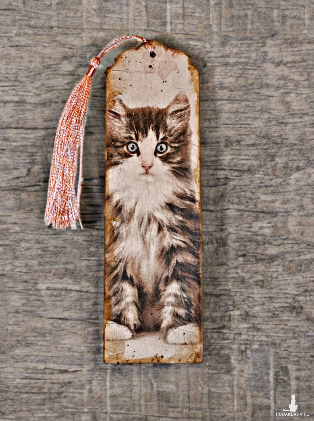 Drewniana zakładka do książki, zdobiona dwustronnie techniką decoupage.