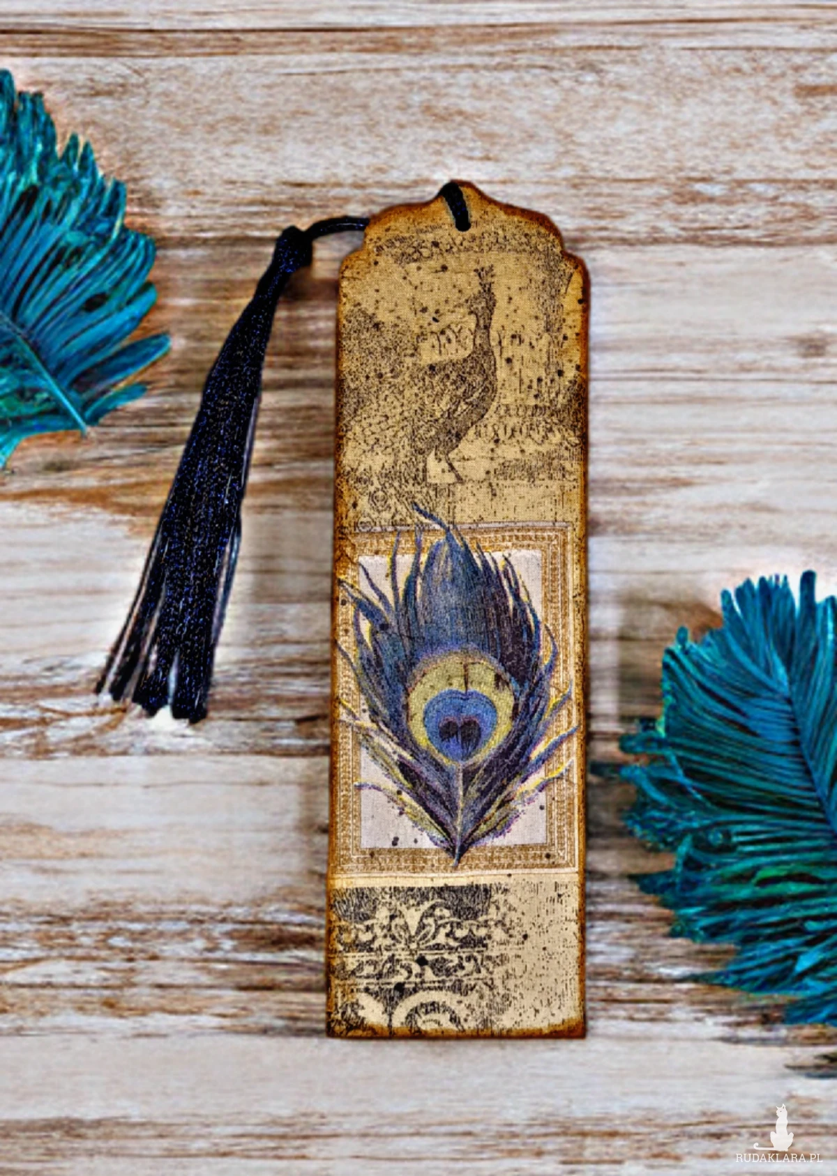 Drewniana zakładka do książki, zdobiona dwustronnie techniką decoupage.