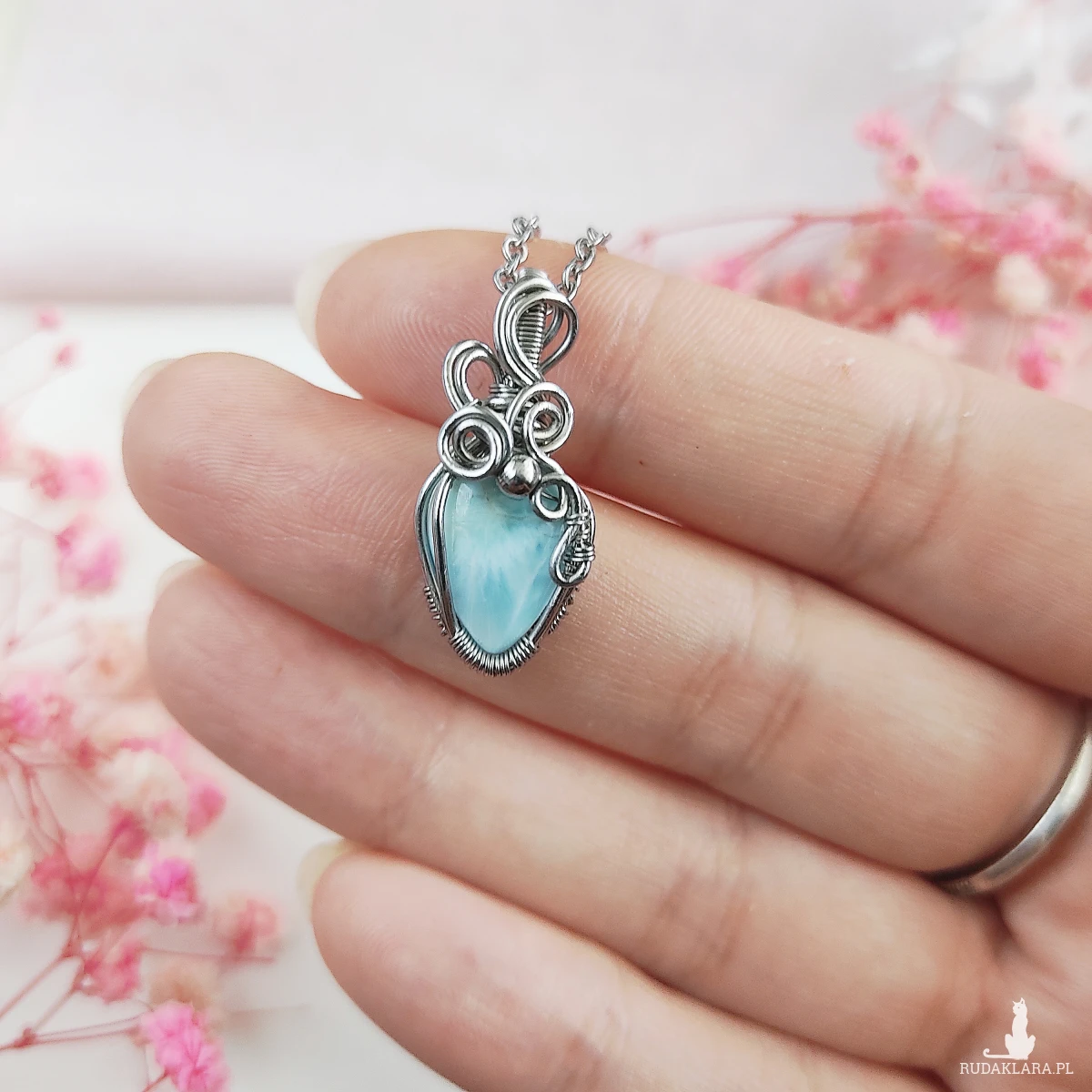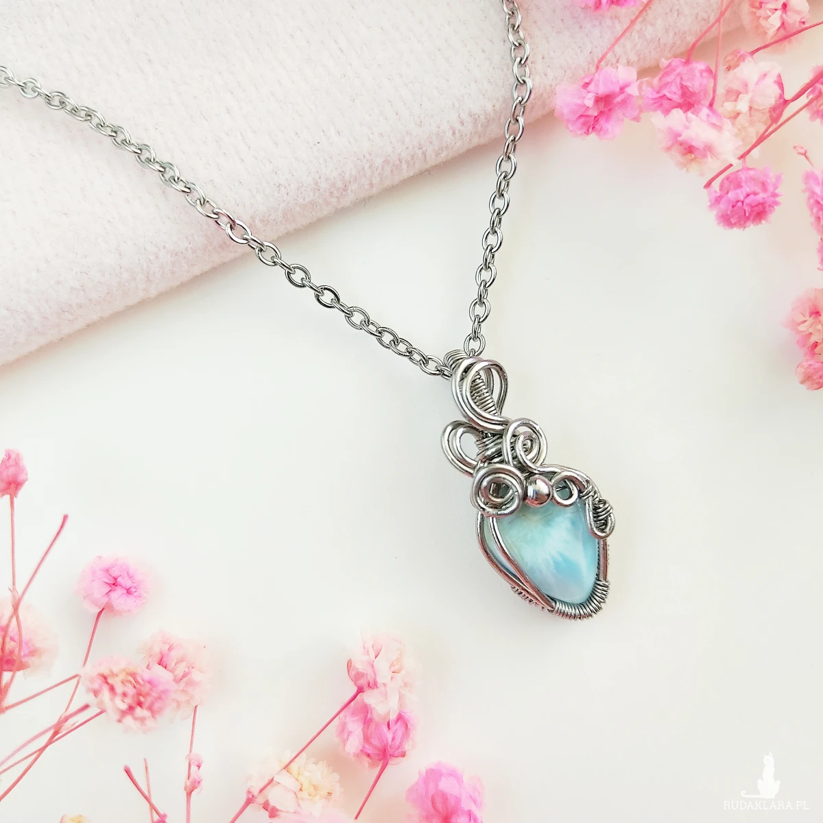 Naszyjnik Larimar ręcznie robiony. Wykonany techniką wire wrapping z drutów ze stali chirurgicznej.
