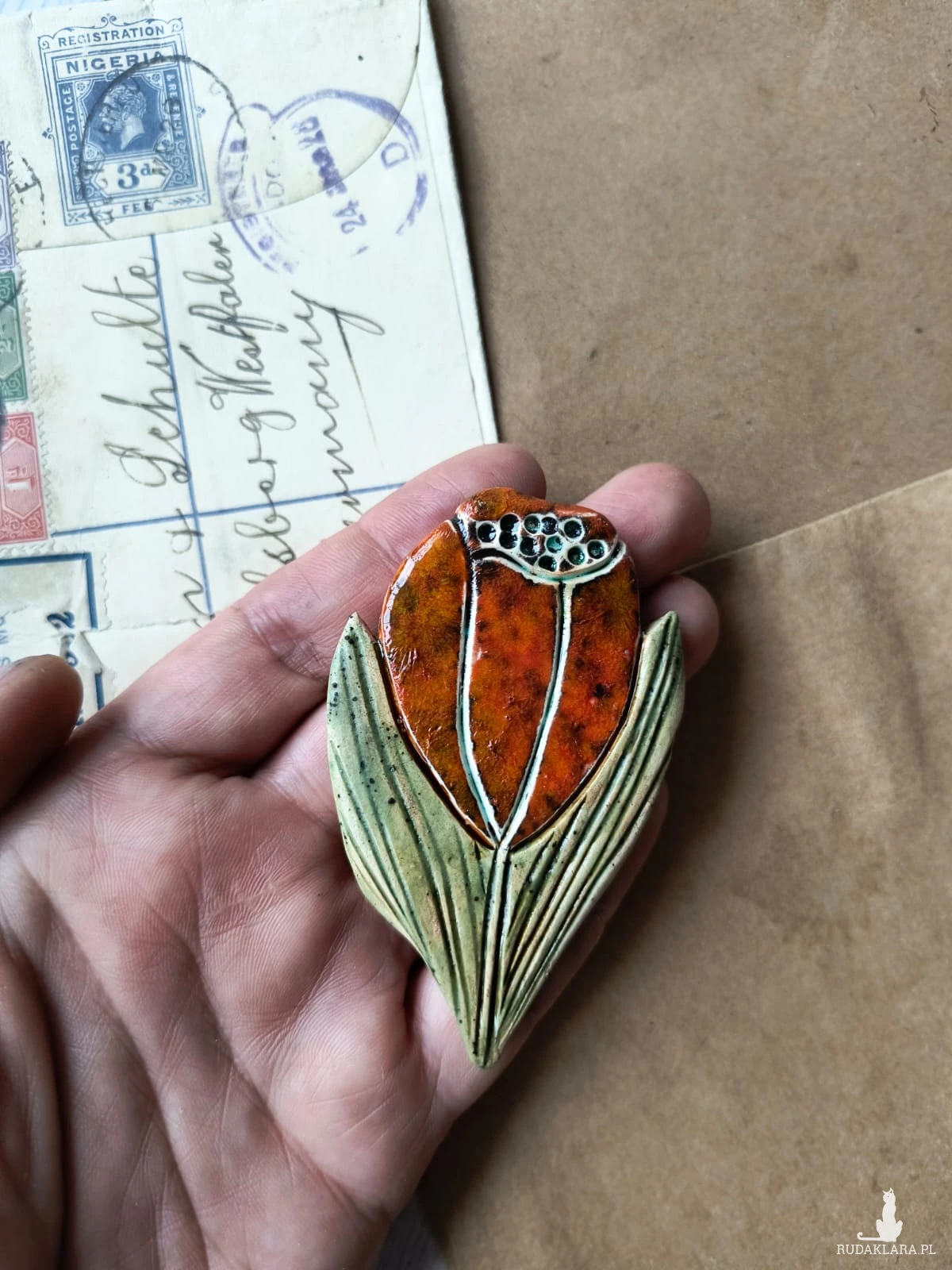 Broszka ceramiczna w postaci tulipana o wymiarach ok 5 cm x 6,5 cm, wykonana z gliny szamotowej wypalona na biskwit, a następnie szkliwiona w temp ok 1260 stopni C. polecam serdecznie.