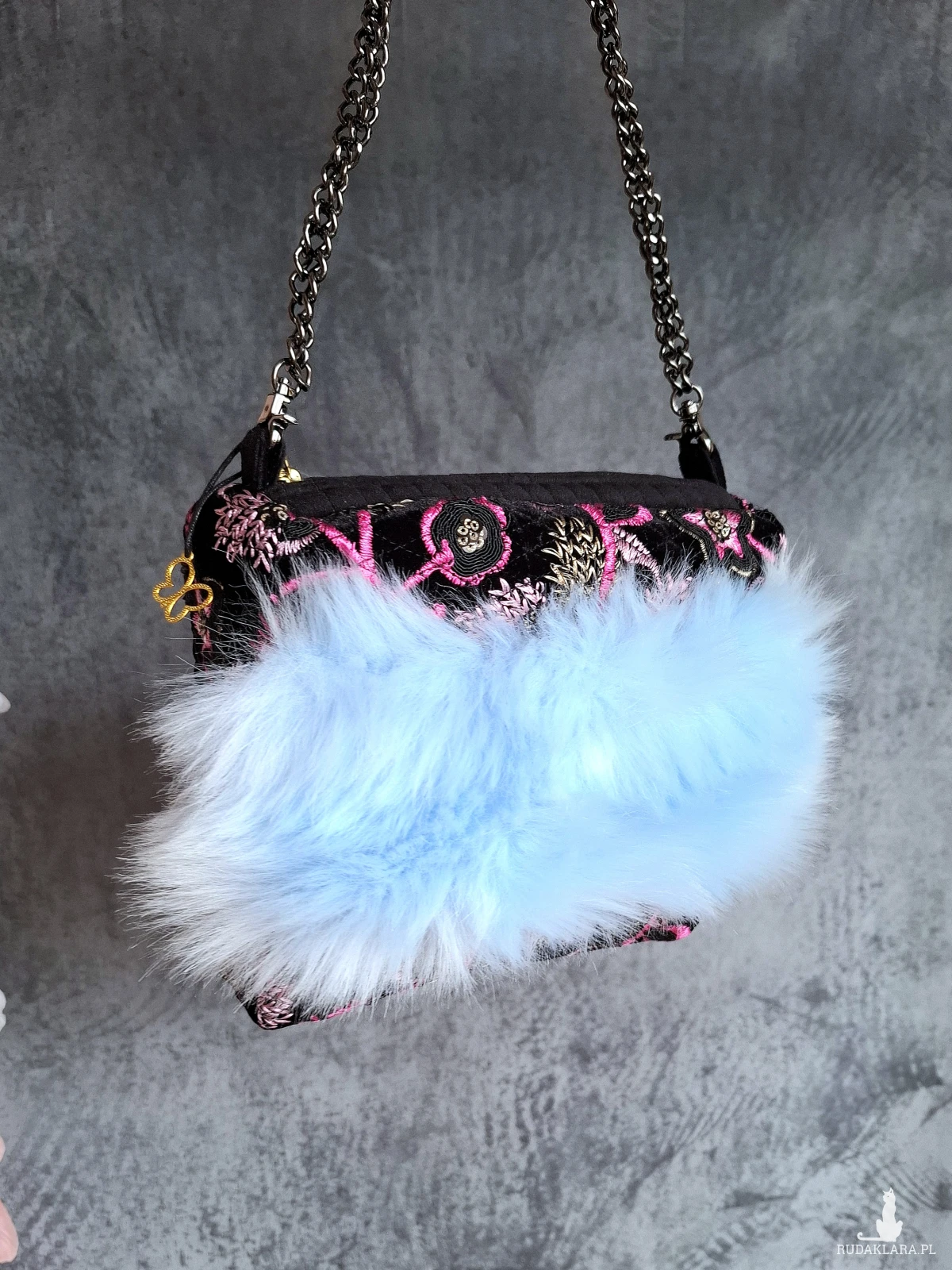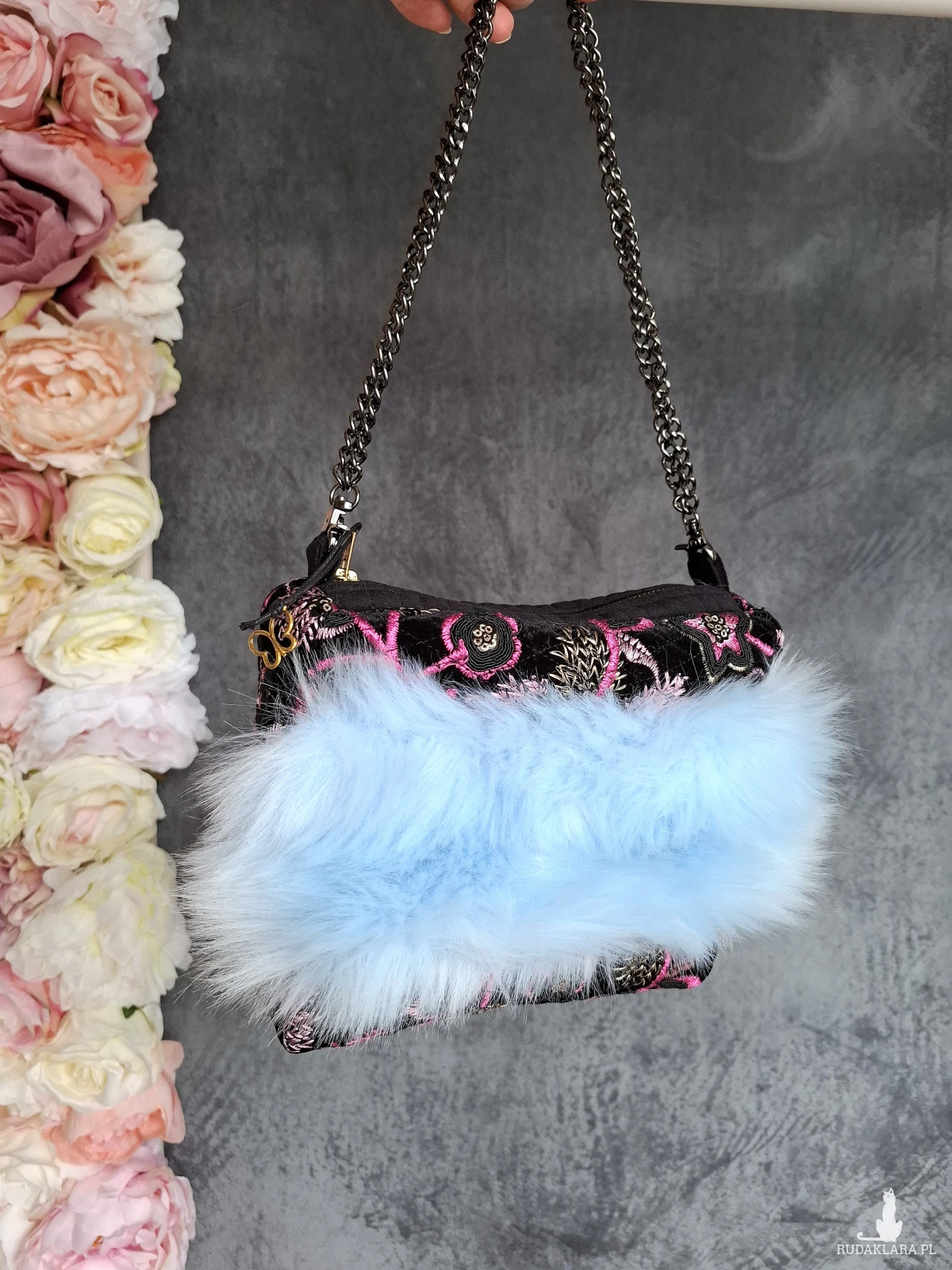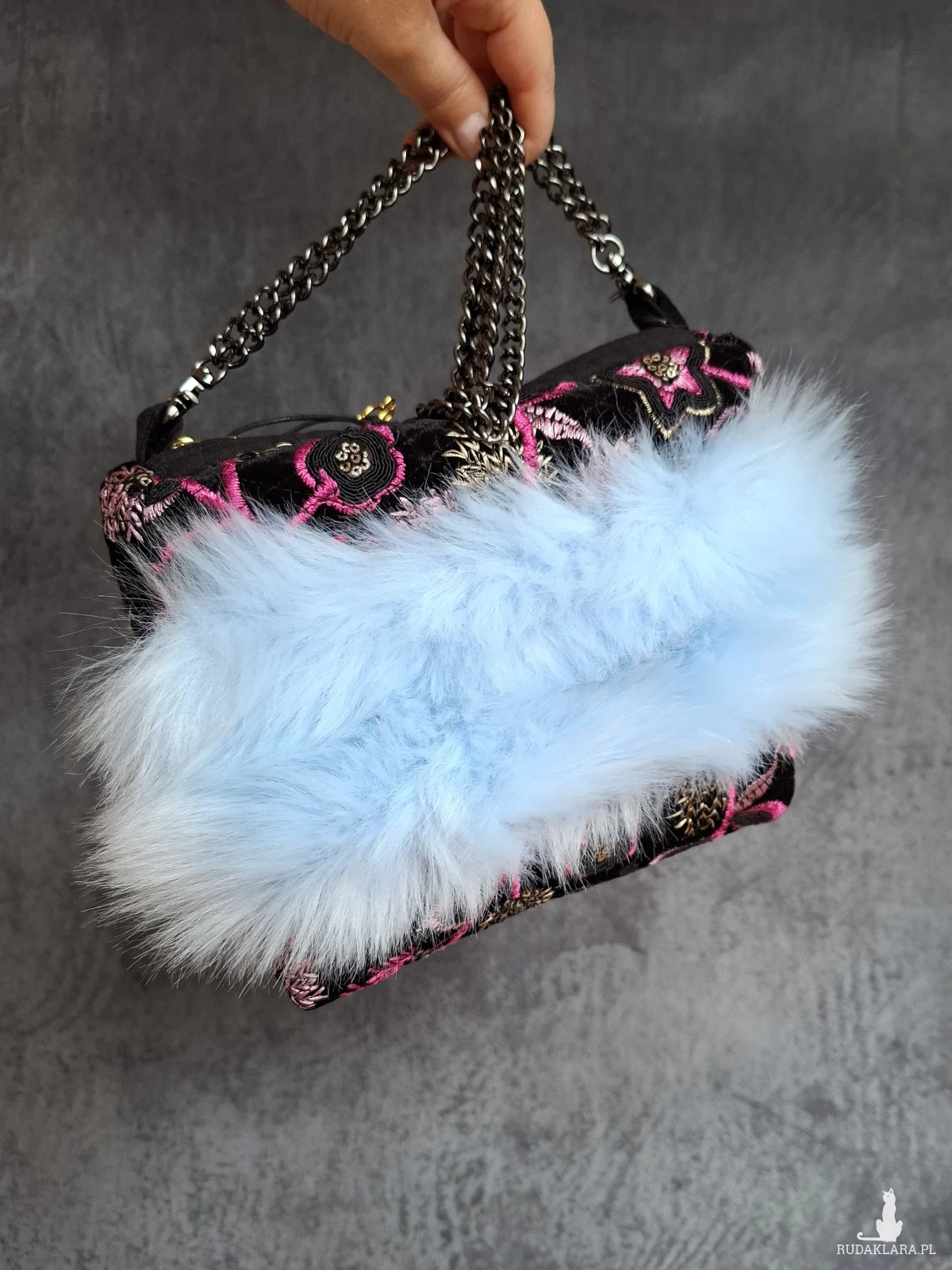 Mała wizytowa torebka do ręki lub na nadgarstek. Torebeczka wykonana jest z czarnego, haftowanego aksamitu, oraz przemiłego w dotyku futerka w odcieniu baby blue. Wnętrze z różowej satyny. Torebka powstała w jednym, niepowtarzalnym egzemplarzu. Wymiary: 18/ 17/ 8 cm, całkowita długość łańcuszka 49 cm.