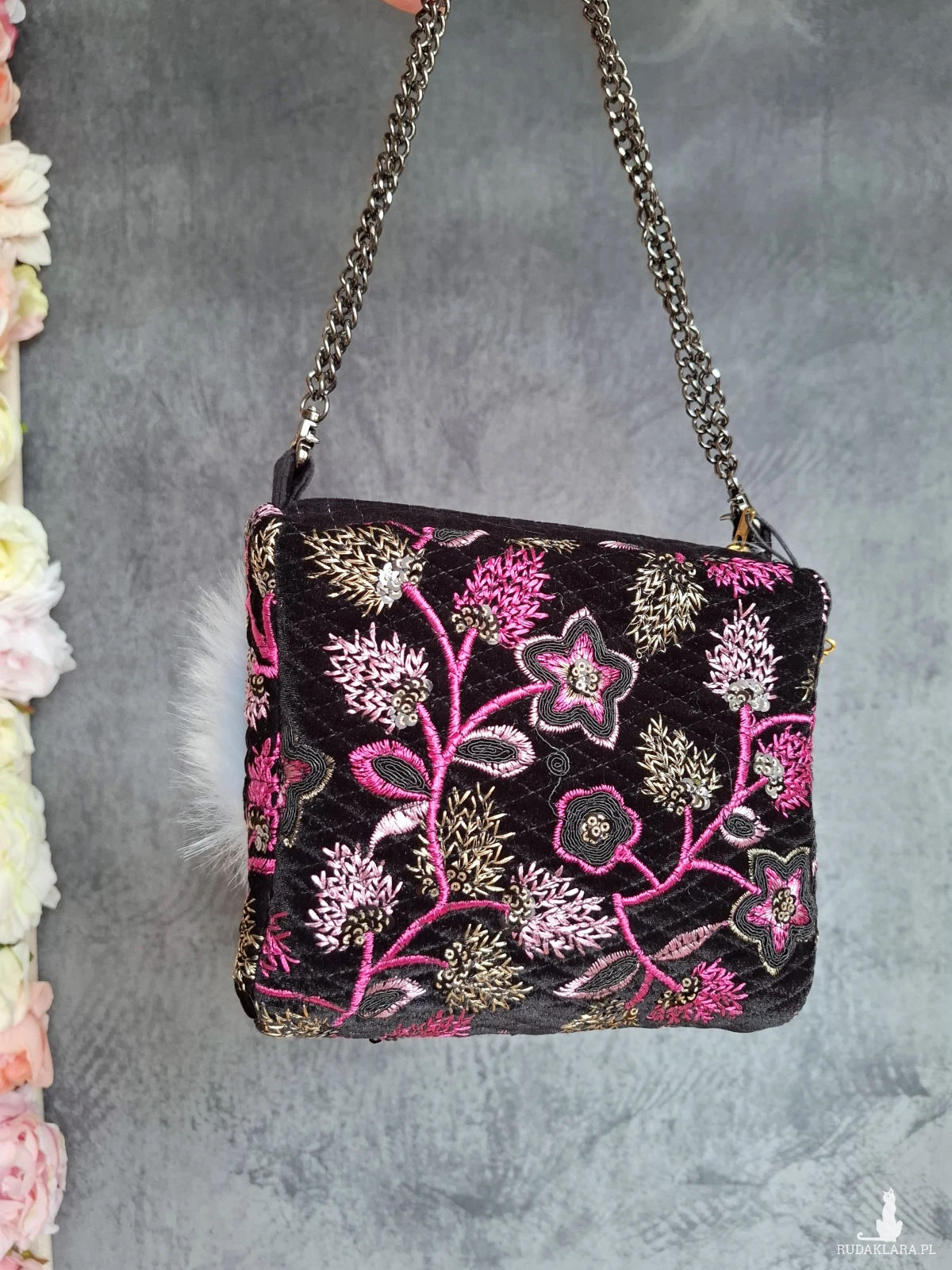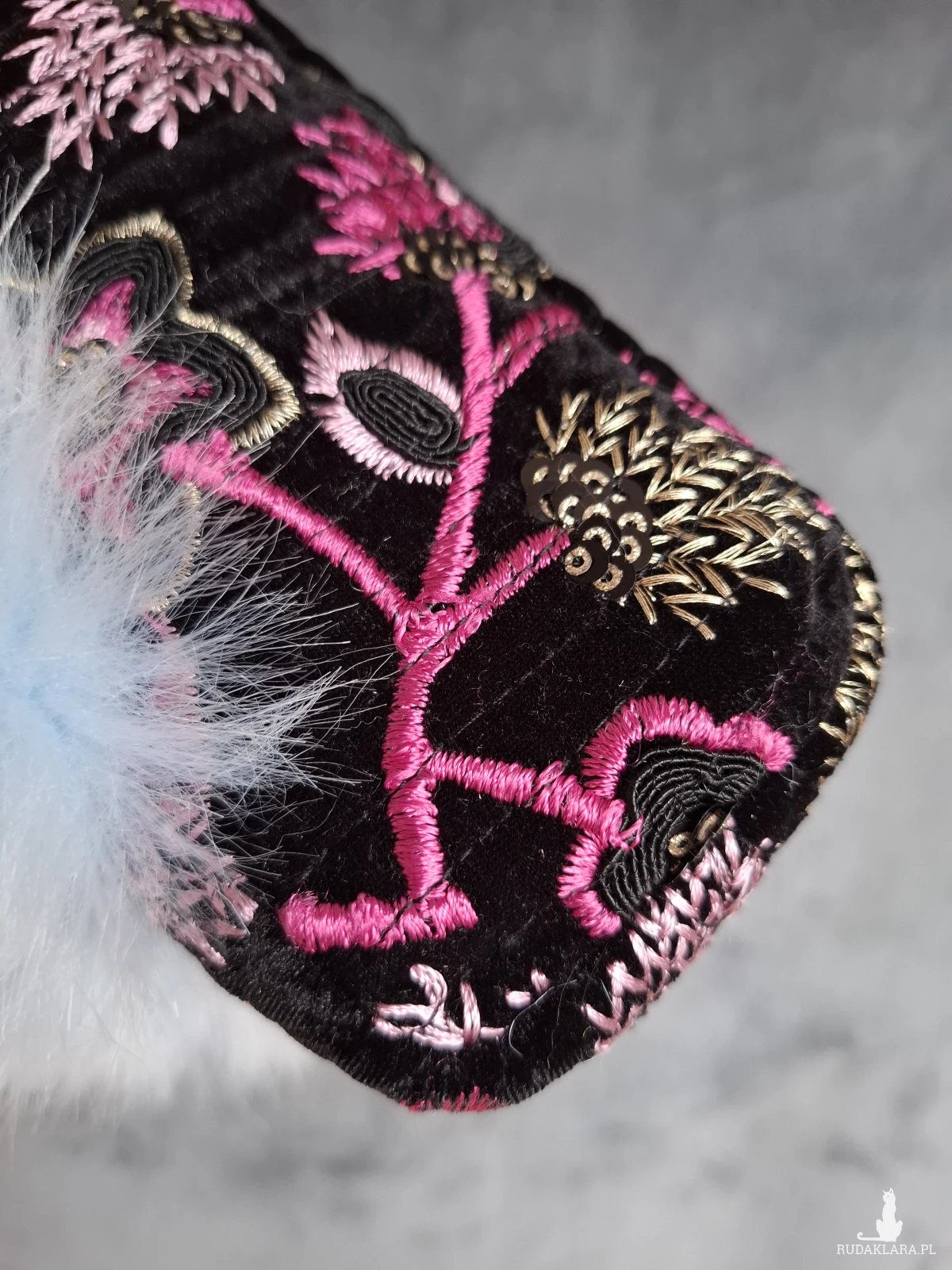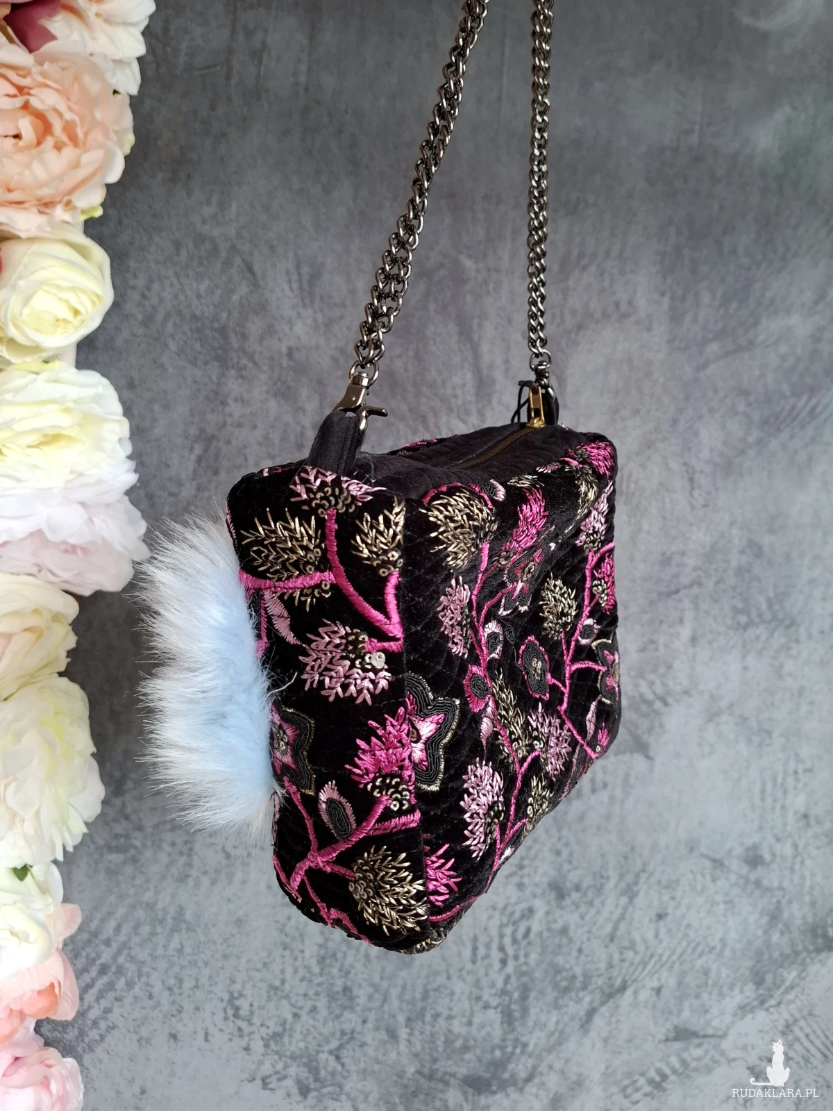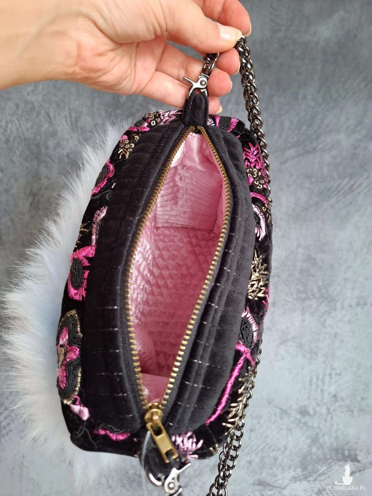 Mała wizytowa torebka do ręki lub na nadgarstek. Torebeczka wykonana jest z czarnego, haftowanego aksamitu, oraz przemiłego w dotyku futerka w odcieniu baby blue. Wnętrze z różowej satyny. Torebka powstała w jednym, niepowtarzalnym egzemplarzu. Wymiary: 18/ 17/ 8 cm, całkowita długość łańcuszka 49 cm.