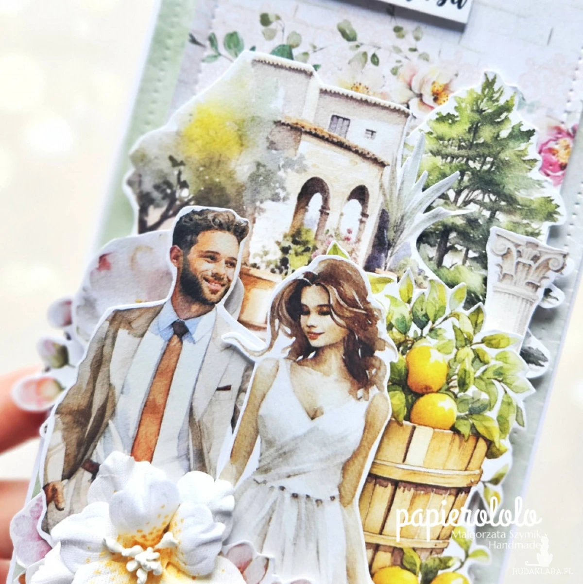 Kartka z okazji ślubu lub rocznicy ślubu. Wykonana z papieru z nadrukiem i ozdobiona kwiatami z materiału oraz papierowymi dodatkami.