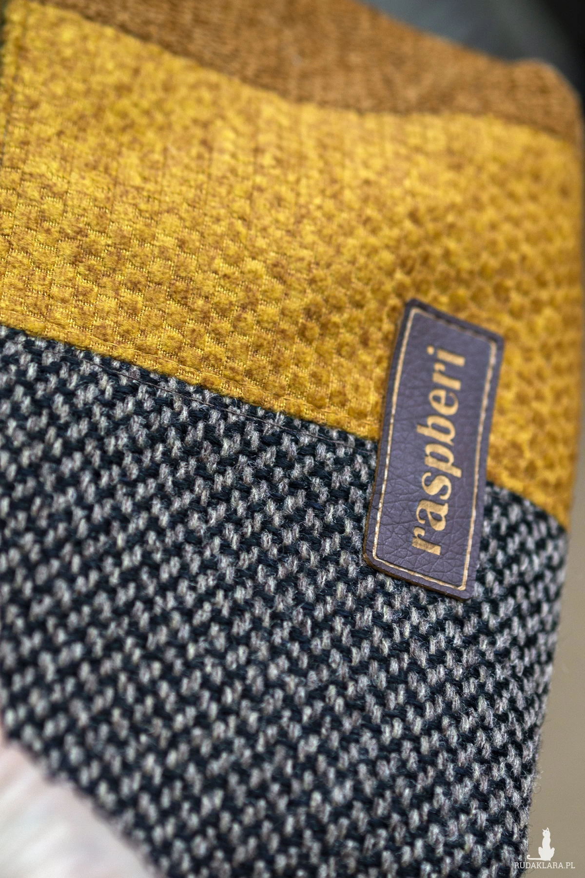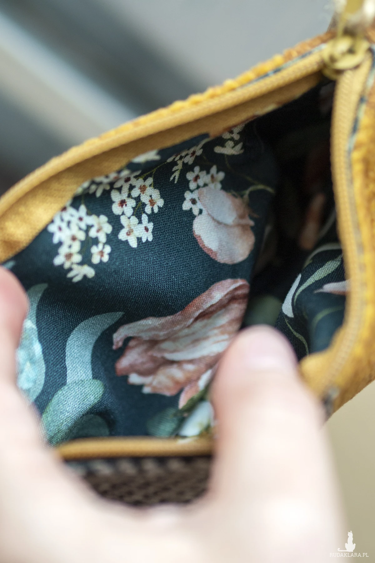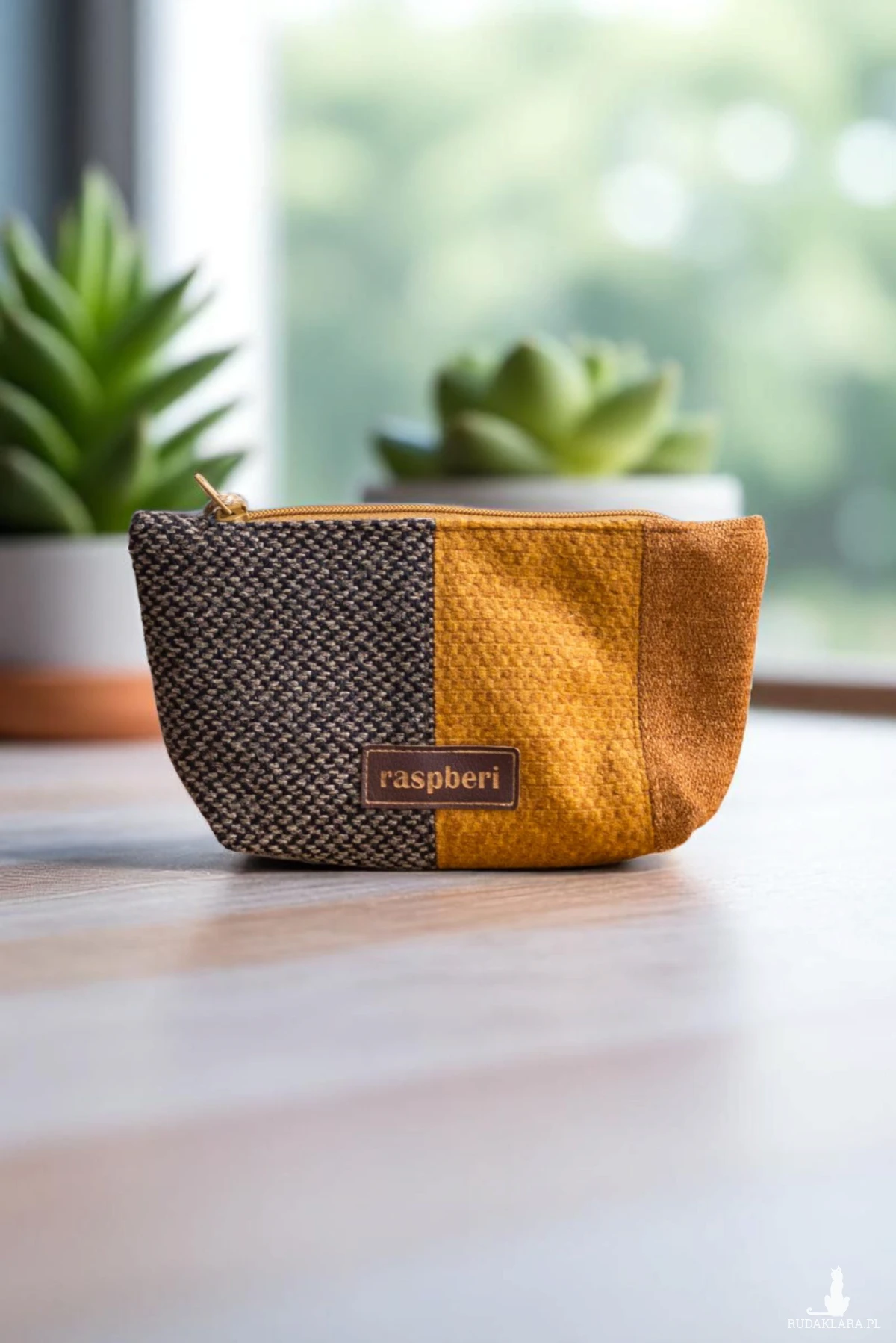 Średniej wielkości kosmetyczka wykonana z kilku rodzajów tkanin w ciepłych barwach. Stworzona w duchu no waste.