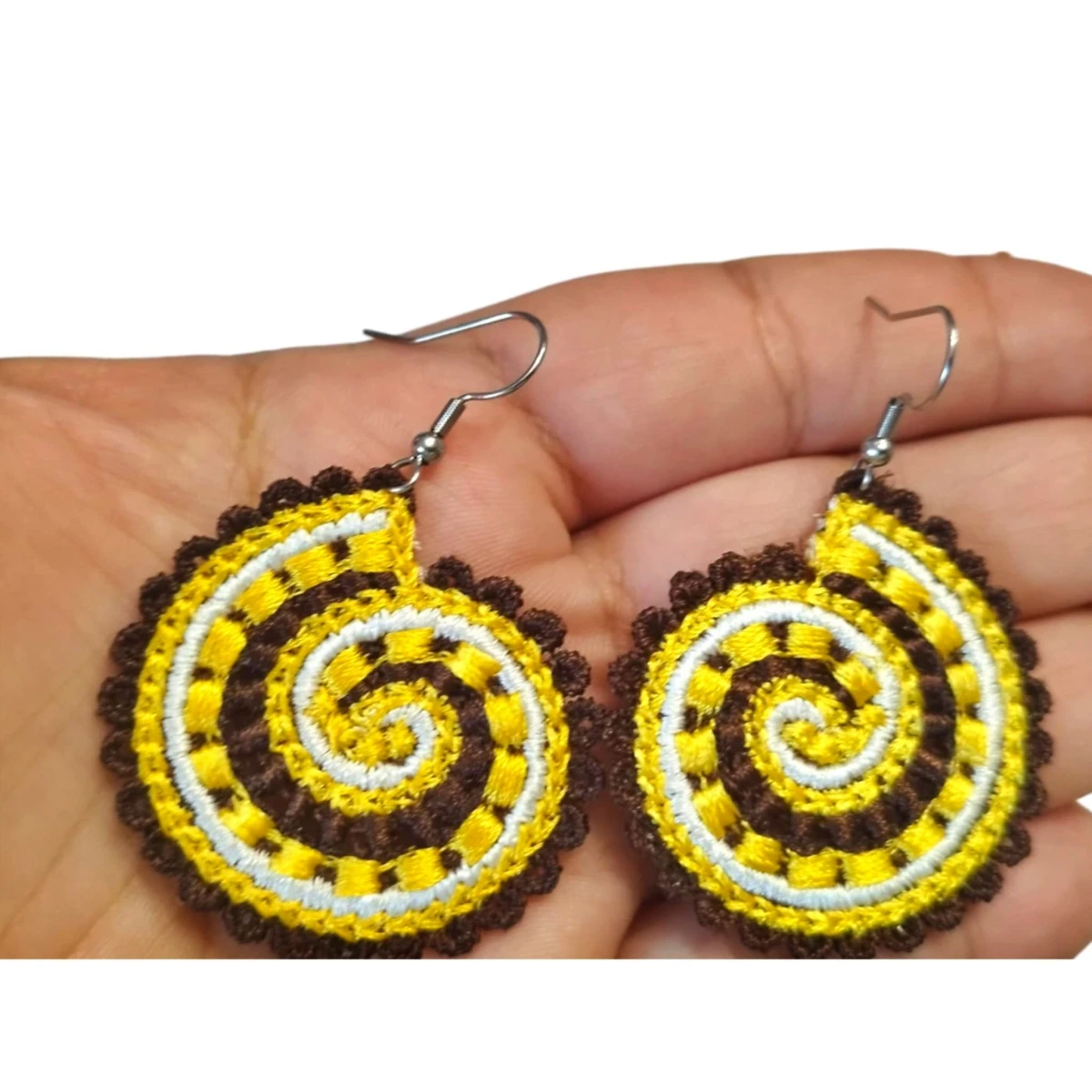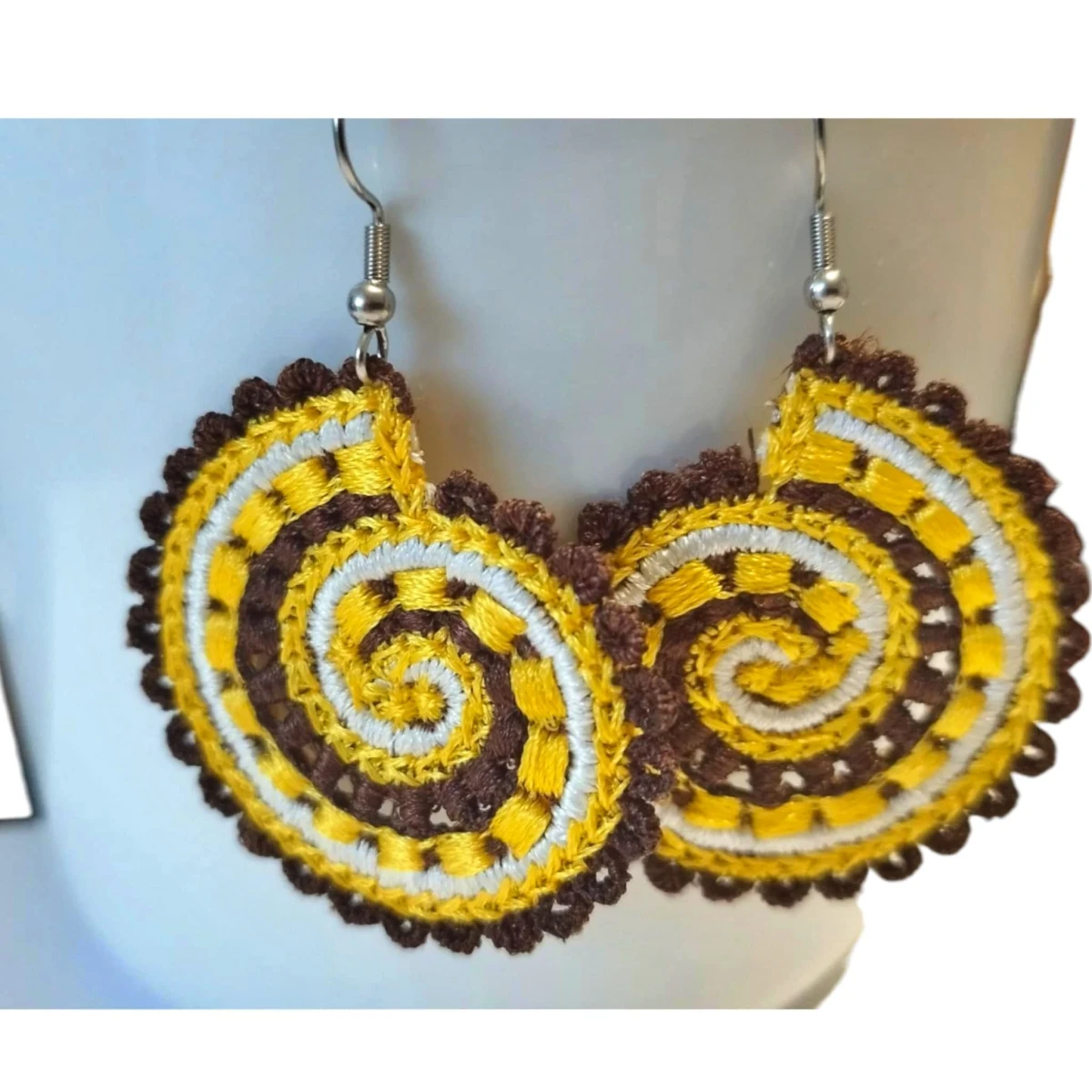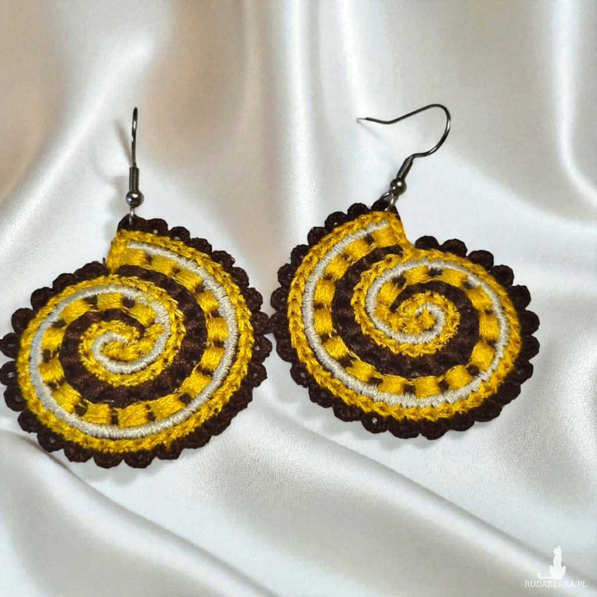 Kolczyki są haftowane (haft maszynowy). Haft jest gęsty, dobrze utrzymuje kształt i wygląd kolczyków. Haftowane kolczyki też są lekkie - to ich kolejny atut.