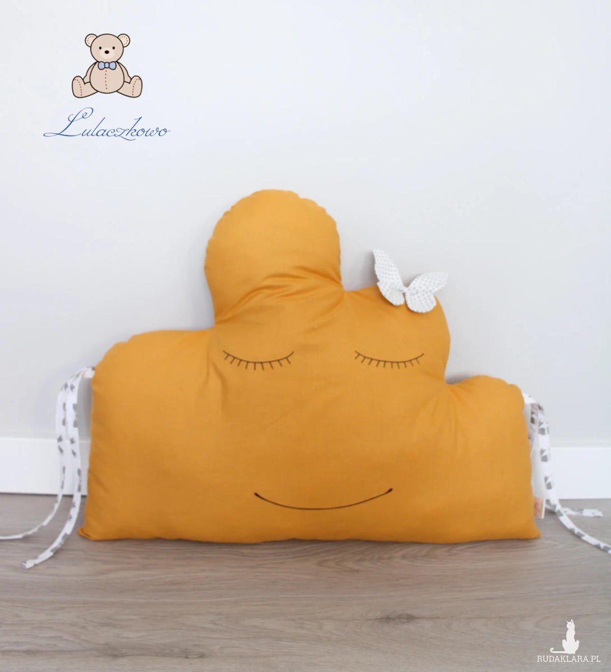 Poduszka dekoracyjna do pokoju dziecięcego w kształcie chmurki udekorowanej motylkiem, a także moduł do ochraniacza modułowego do łóżeczka dziecięcego, w kolorze gładkiej musztardy.