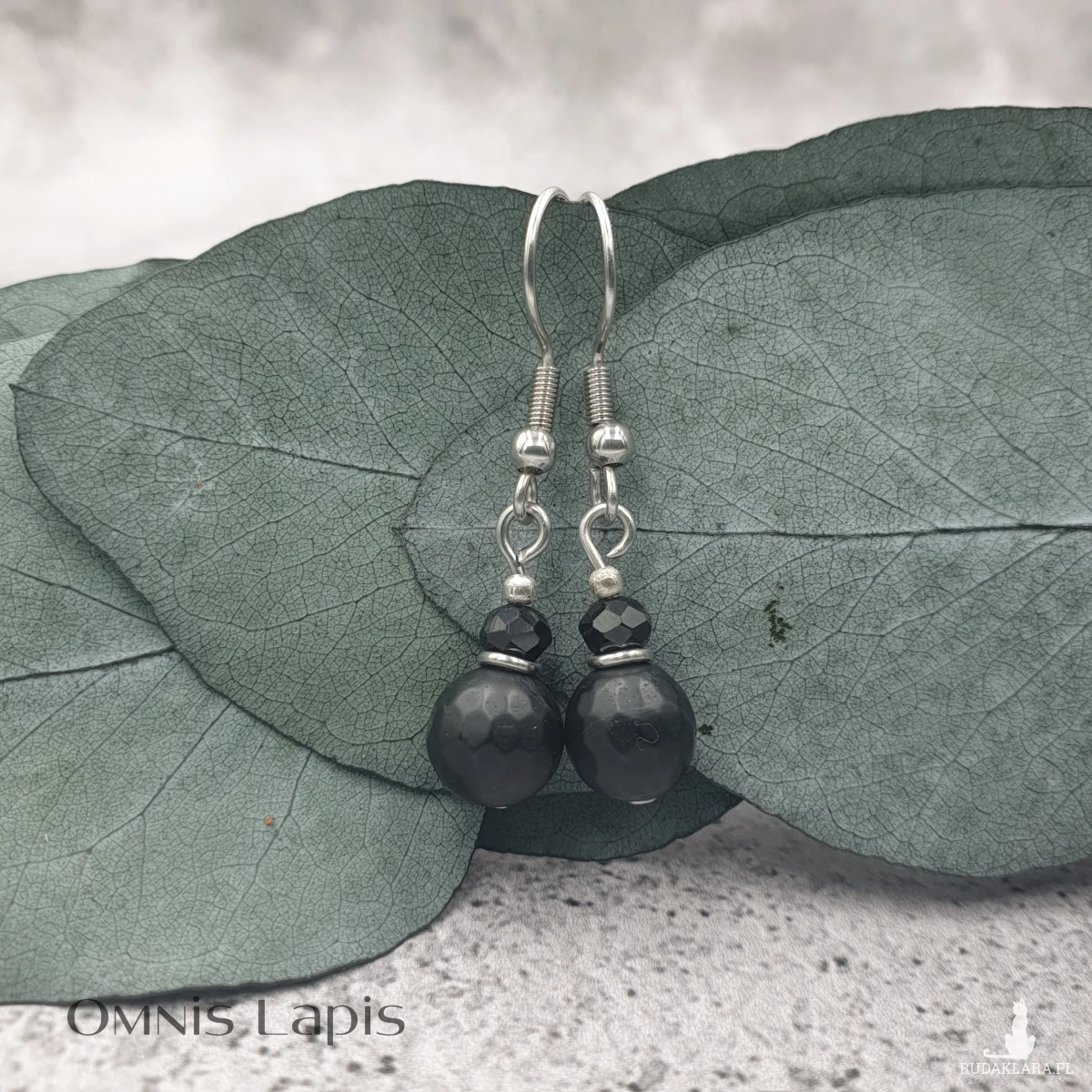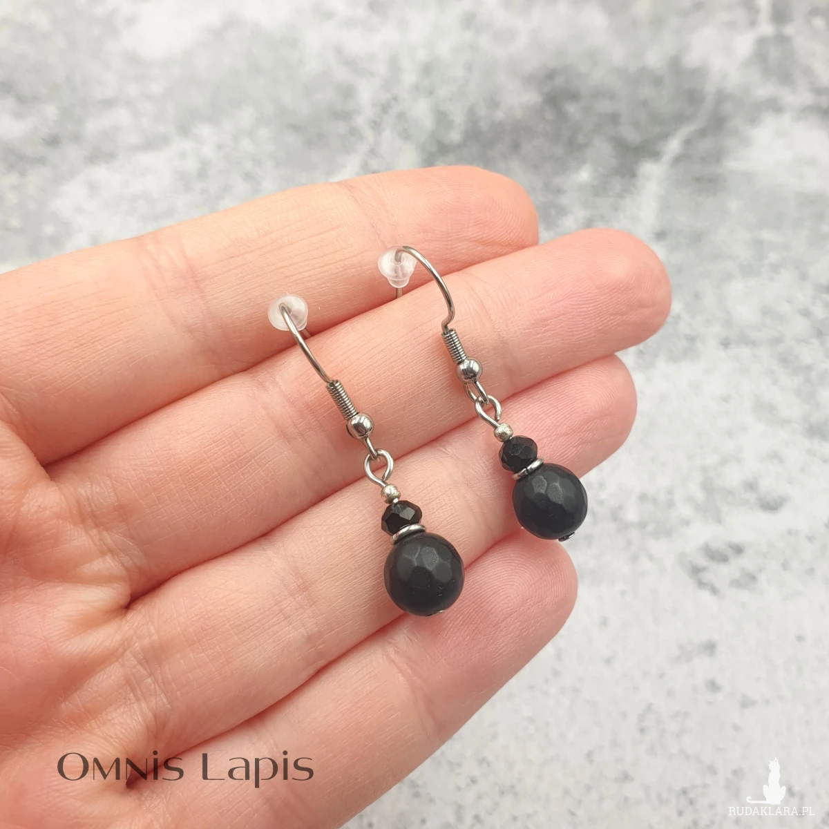 Delikatne, kobiece kolczyki w kolorze matowej czerni. Ozdobione kulami naturalnego, fasetowanego onyksu oraz kryształowymi oponkami. Wykonane ze stali szlachetnej.
