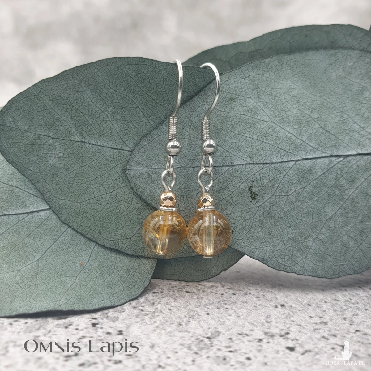 Delikatne, kobiece kolczyki w kolorze złota. Ozdobione kulami naturalnego cytrynu oraz hematytu. Wykonane ze stali szlachetnej.