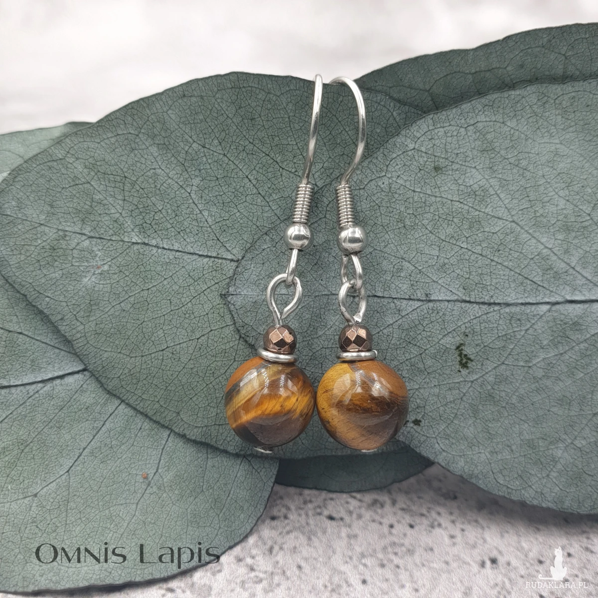 Delikatne, kobiece kolczyki w kolorze błyszczącego brązu. Ozdobione kulami naturalnego tygrysiego oka i hematytu. Wykonane ze stali szlachetnej.
