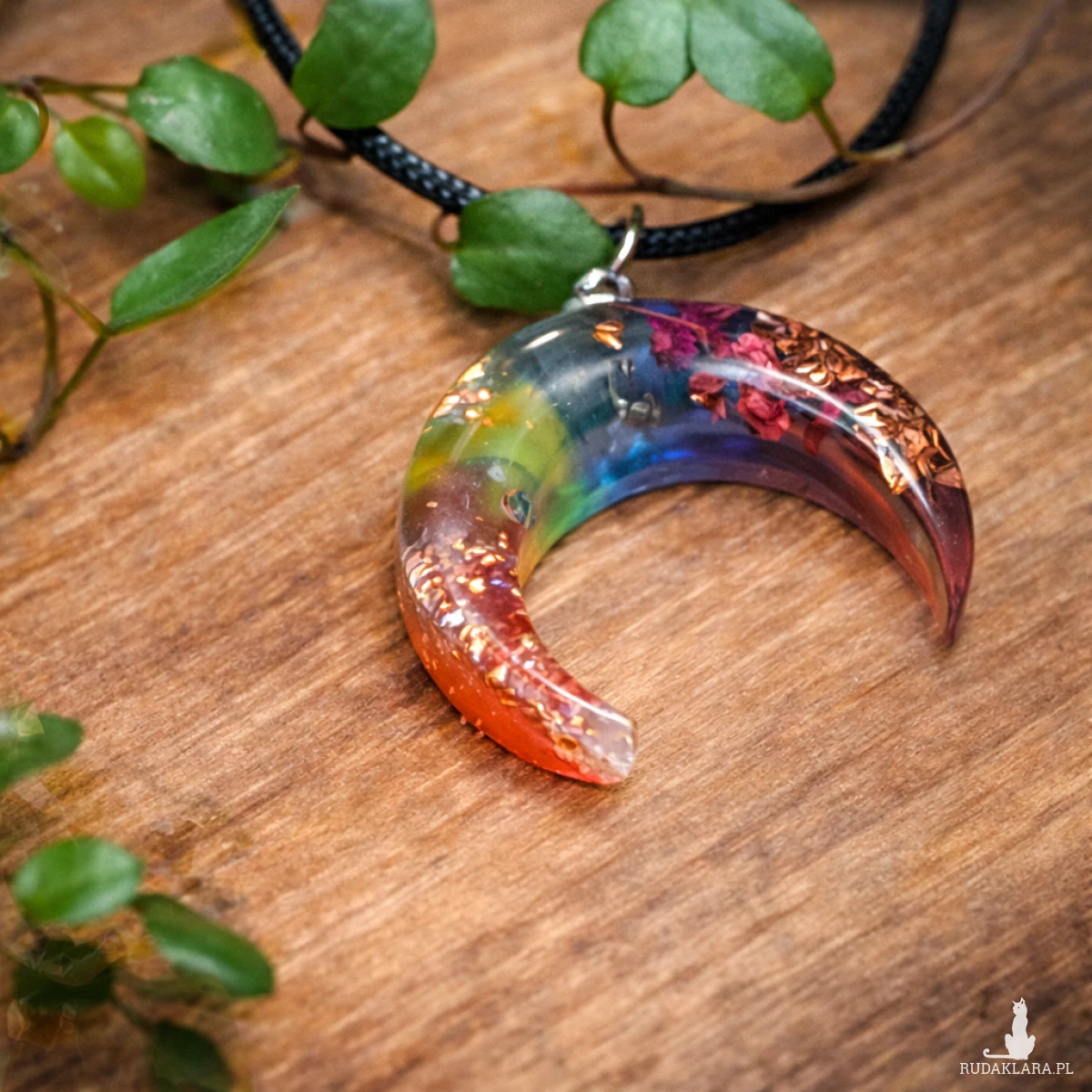 Ręcznie wykonany wisiorek lunula orgonit to współczesna interpretacja dawnego słowiańskiego amuletu ochronnego. Transparentna żywica w barwach siedmiu czakr tworzy energetyczną kompozycję z naturalnymi minerałami i roślinami.