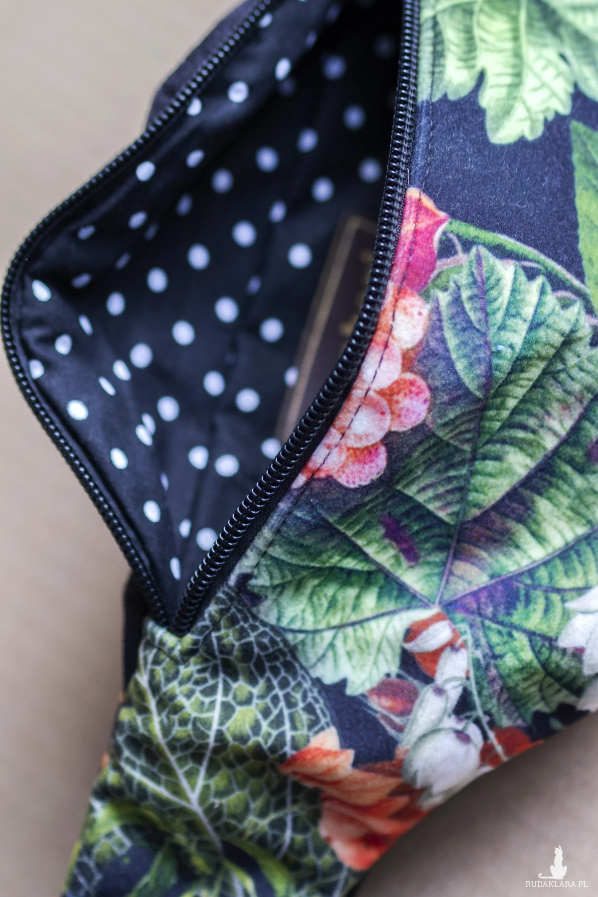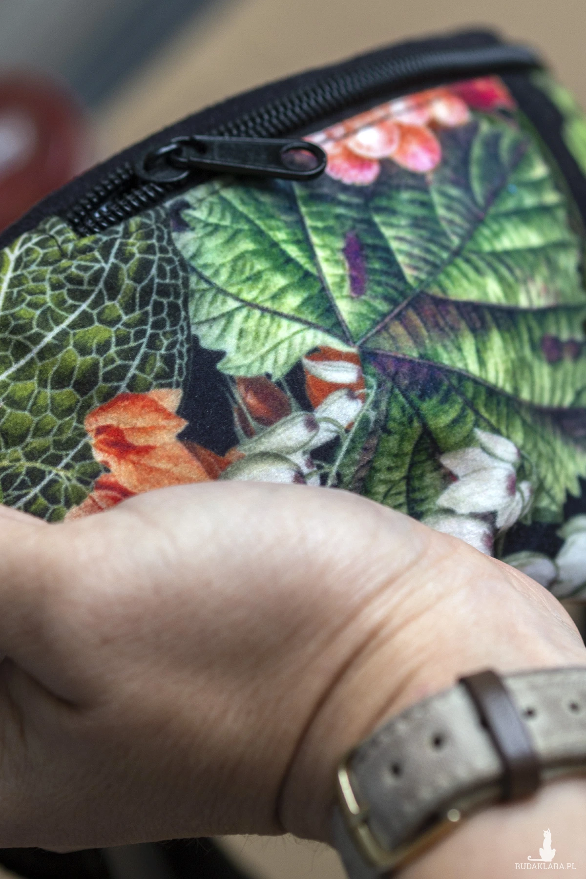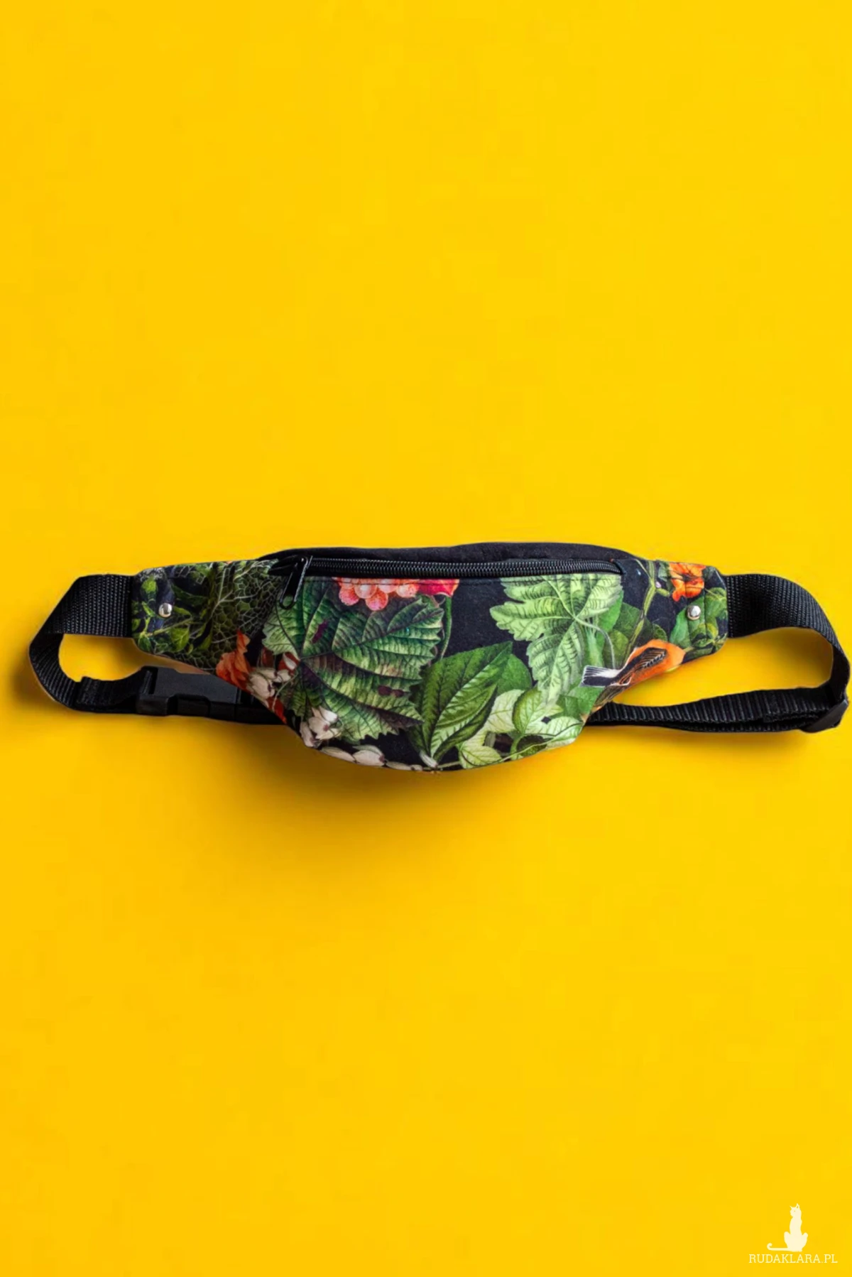 Saszetka torebka biodrowa nerka średniej wielkości wykonana z weluru z botanicznym wzorem. Czarna klapa z nubuku.