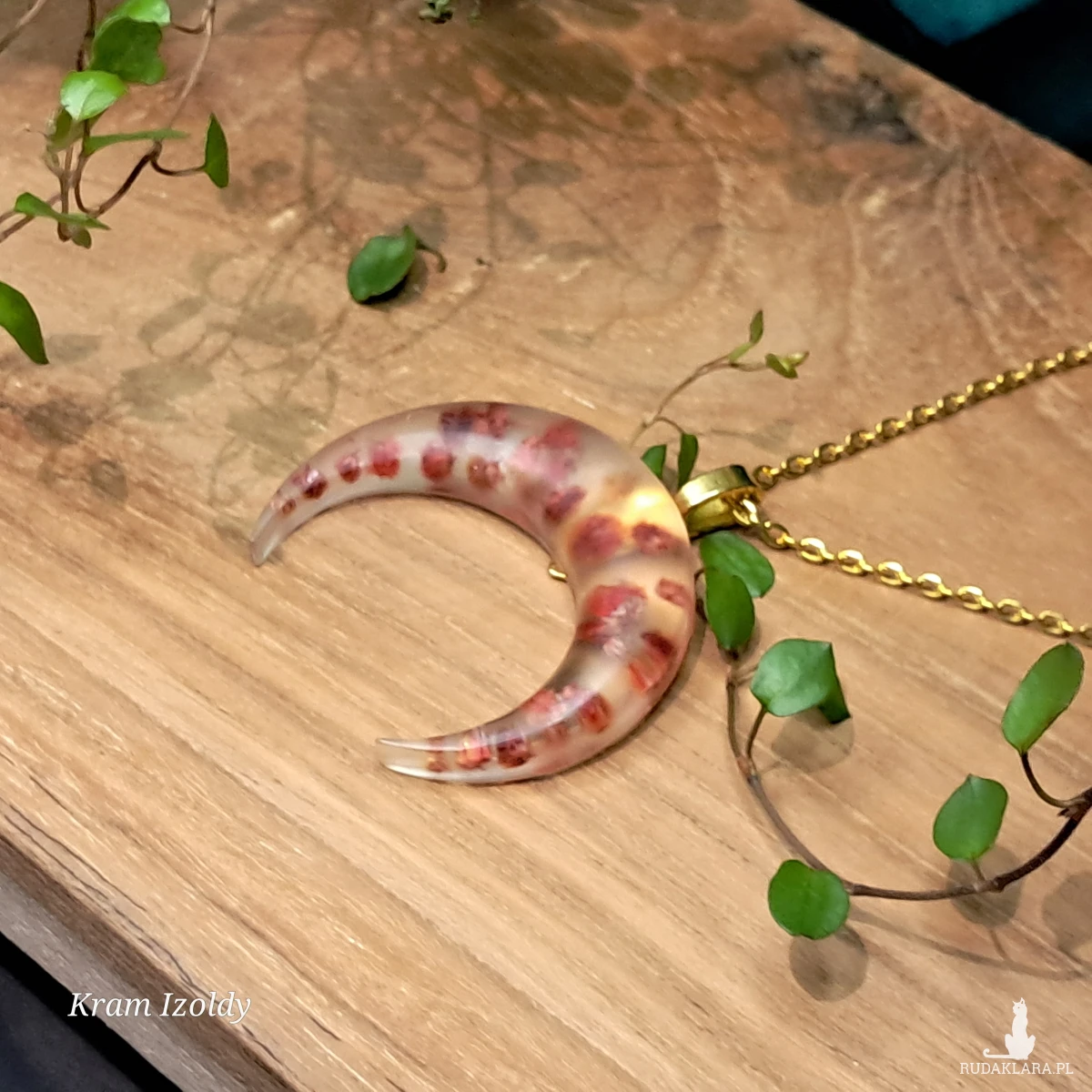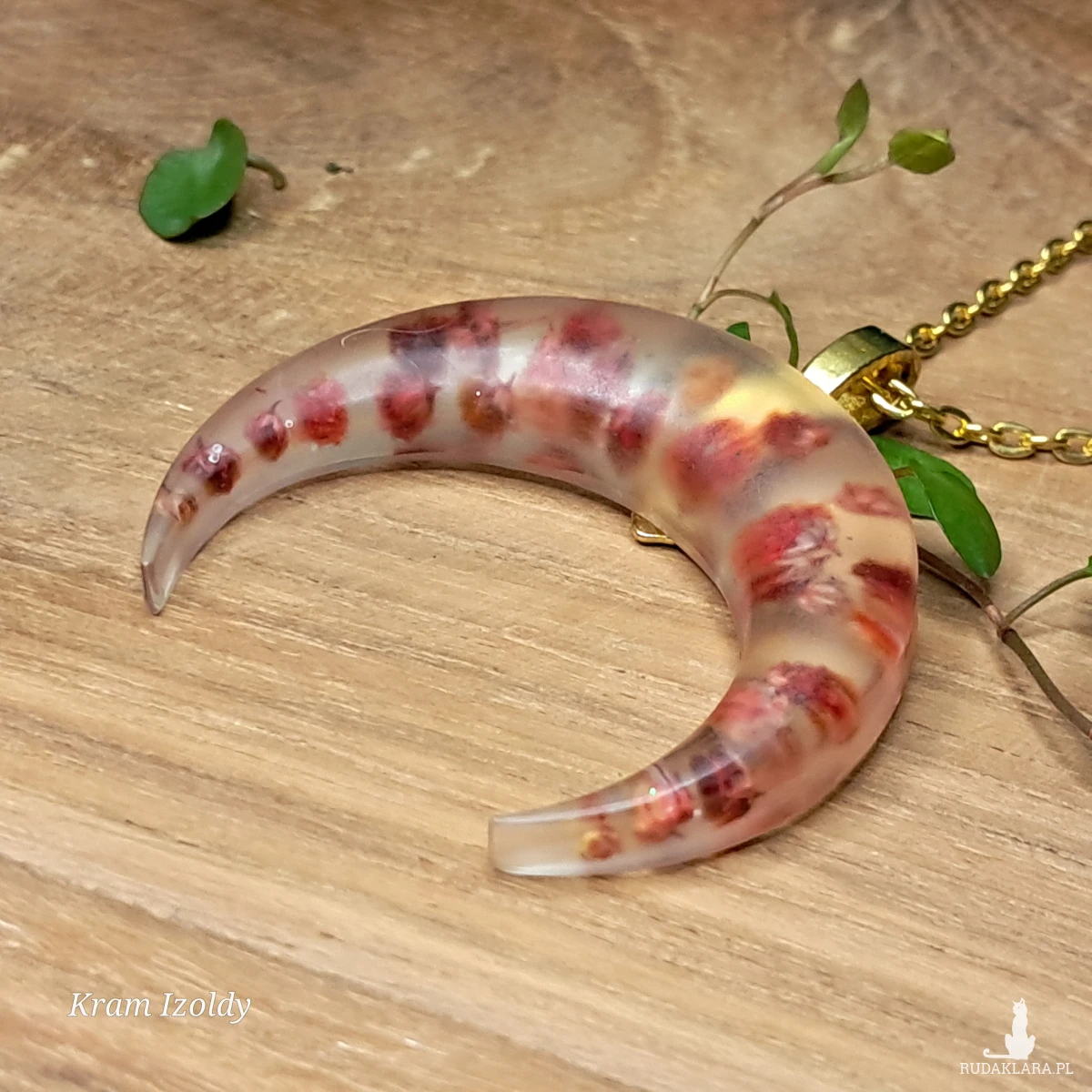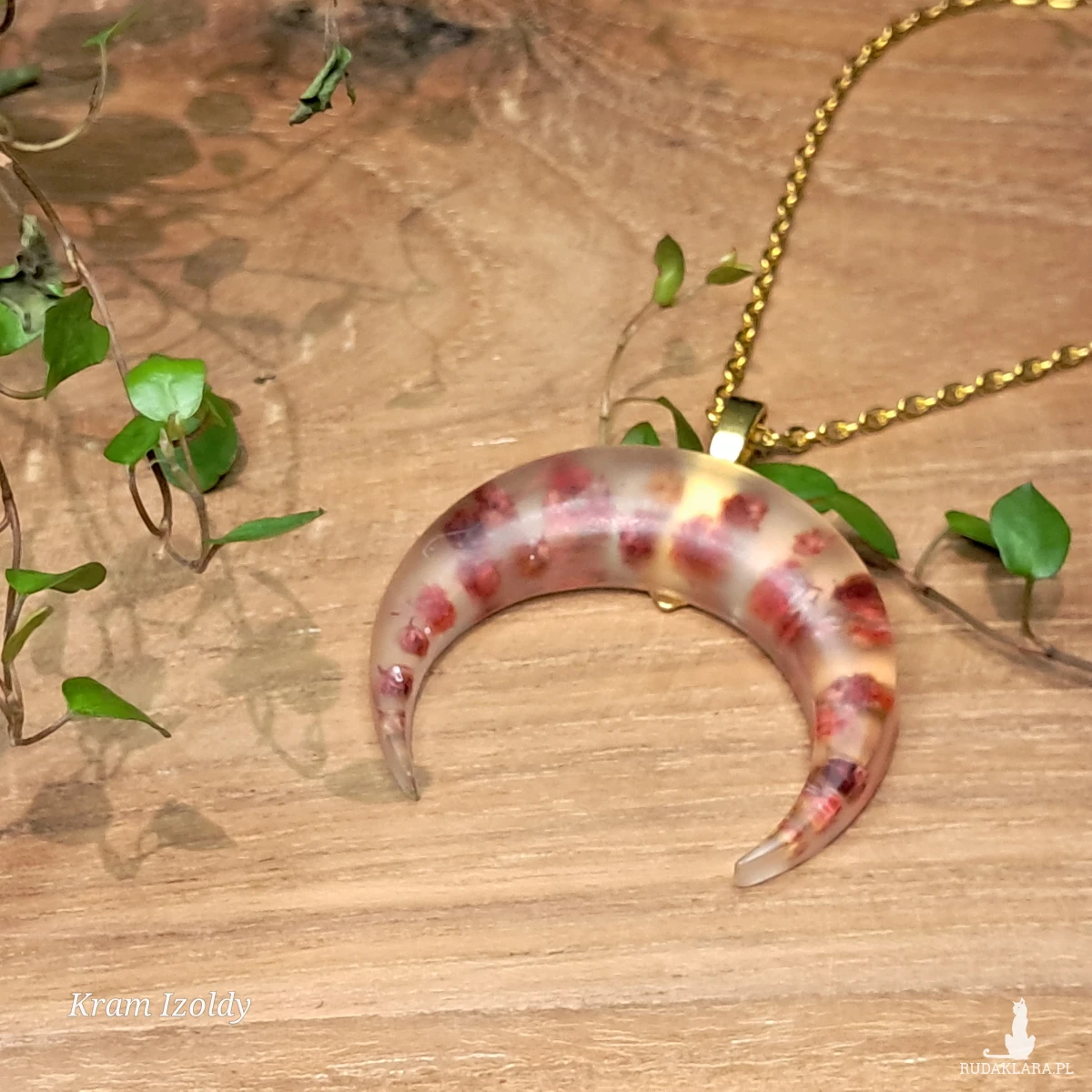 Wewnątrz półksiężyca zatopione zostały kwiaty gipsówki wytwornej – czerwone, ogniste, niosące ze sobą siłę kobiecego ognia, odwagi i miłości. Ich głęboki kolor kontrastuje z półprzezroczystą, oszronioną formą żywicy, tworząc efekt subtelnego zaklęcia zamkniętego w biżuterii.