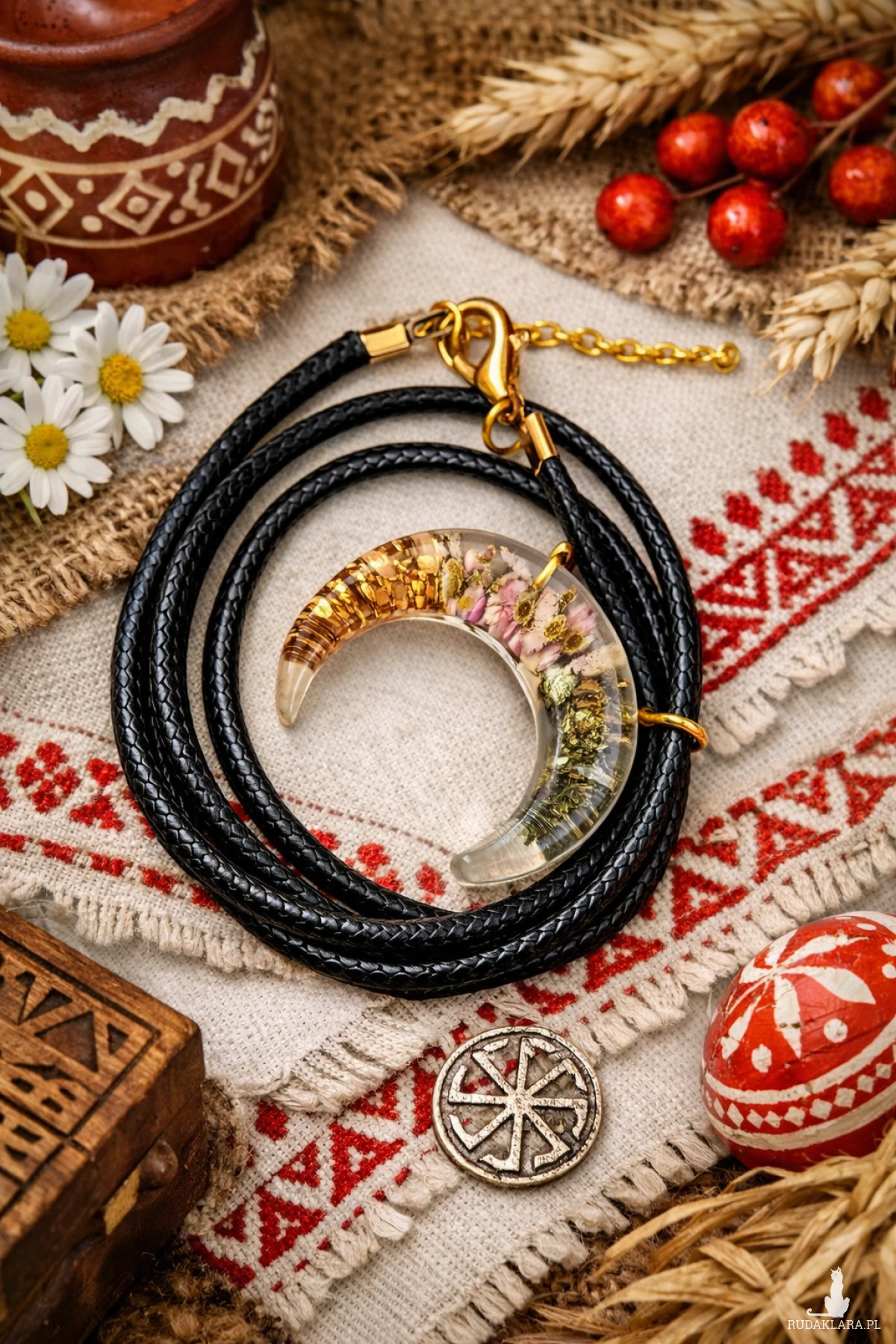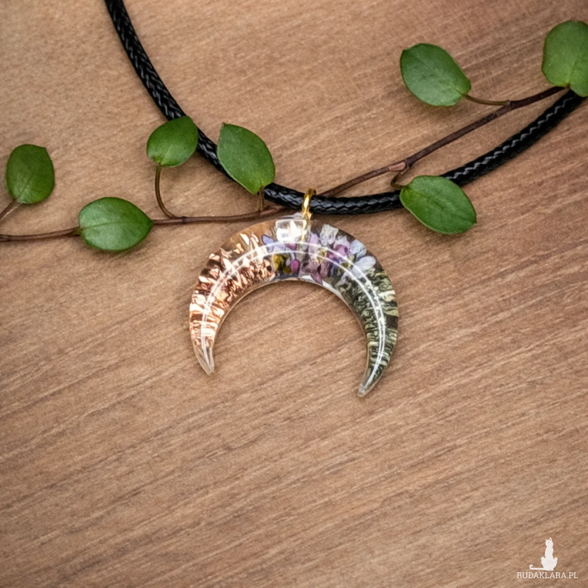 Lunula to jeden z najbardziej rozpoznawalnych symboli kobiecej energii w kulturze słowiańskiej. Ten ręcznie wykonany wisiorek w formie orgonitu łączy tradycyjną symbolikę z nowoczesnym designem. Transparentna żywica eksponuje zatopione wewnątrz elementy – bizmut, miedź, kryształ górski oraz delikatne niezapominajki.