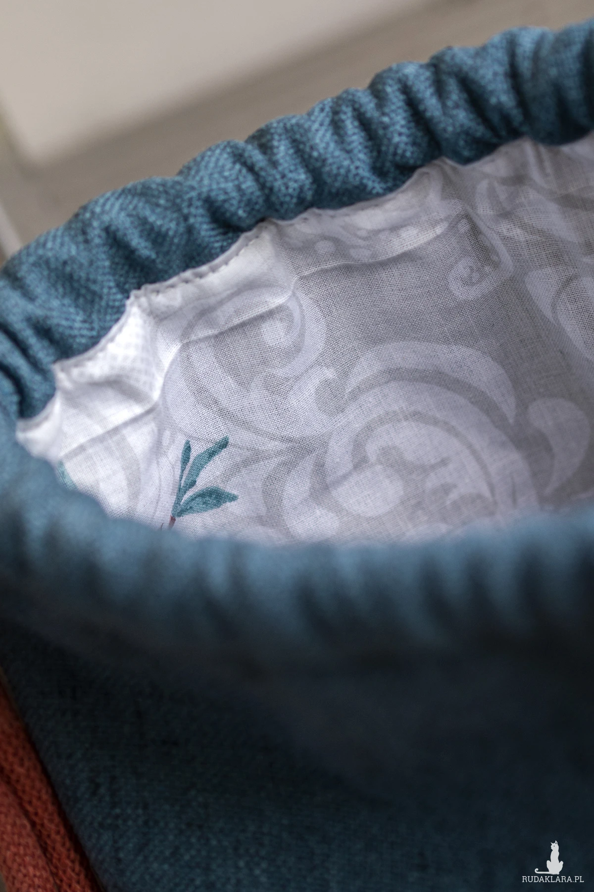 Plecak worek wykonany z plecionej tkaniny w kolorze turkusowym.