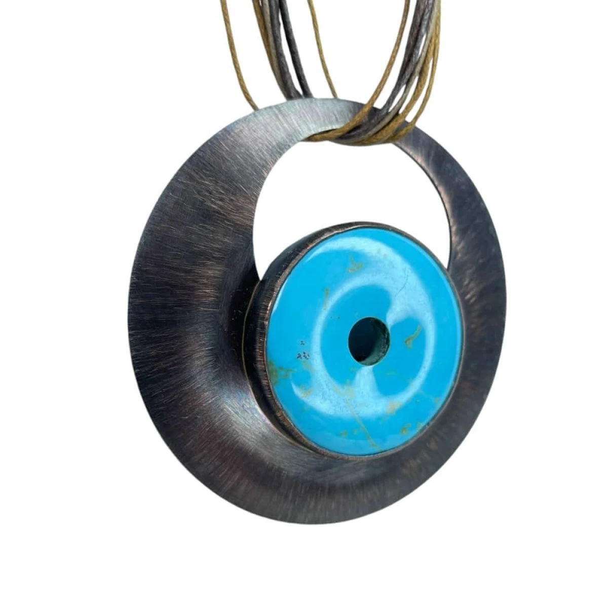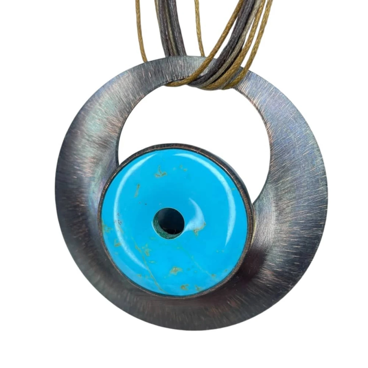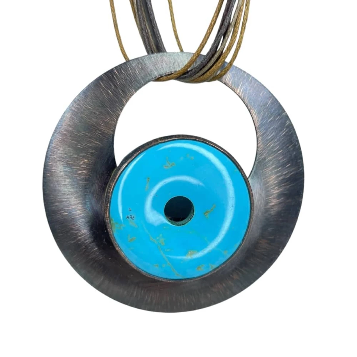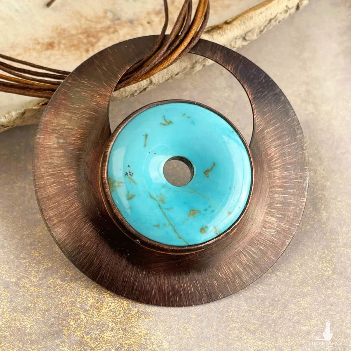Wisior został wykonany ręcznie z blachy miedzianej i okrągłego howlitu z otworem w środku. Kamień ma średnicę 35 mm i cechuje się intensywną barwą. W procesie tworzenia wisiora blacha była polerowana, matowiona, a następnie malowana oksydą i przecierana, dzięki czemu powstał niepowtarzalny efekt kolorystyczny. Blacha otaczająca agat jest lekko wypukła oraz zabezpieczona warstwą ochronną. Miedziane koło, którego centralnym elementem jest jedyny w swoim rodzaju howlit, ma średnicę ok 7 cm.