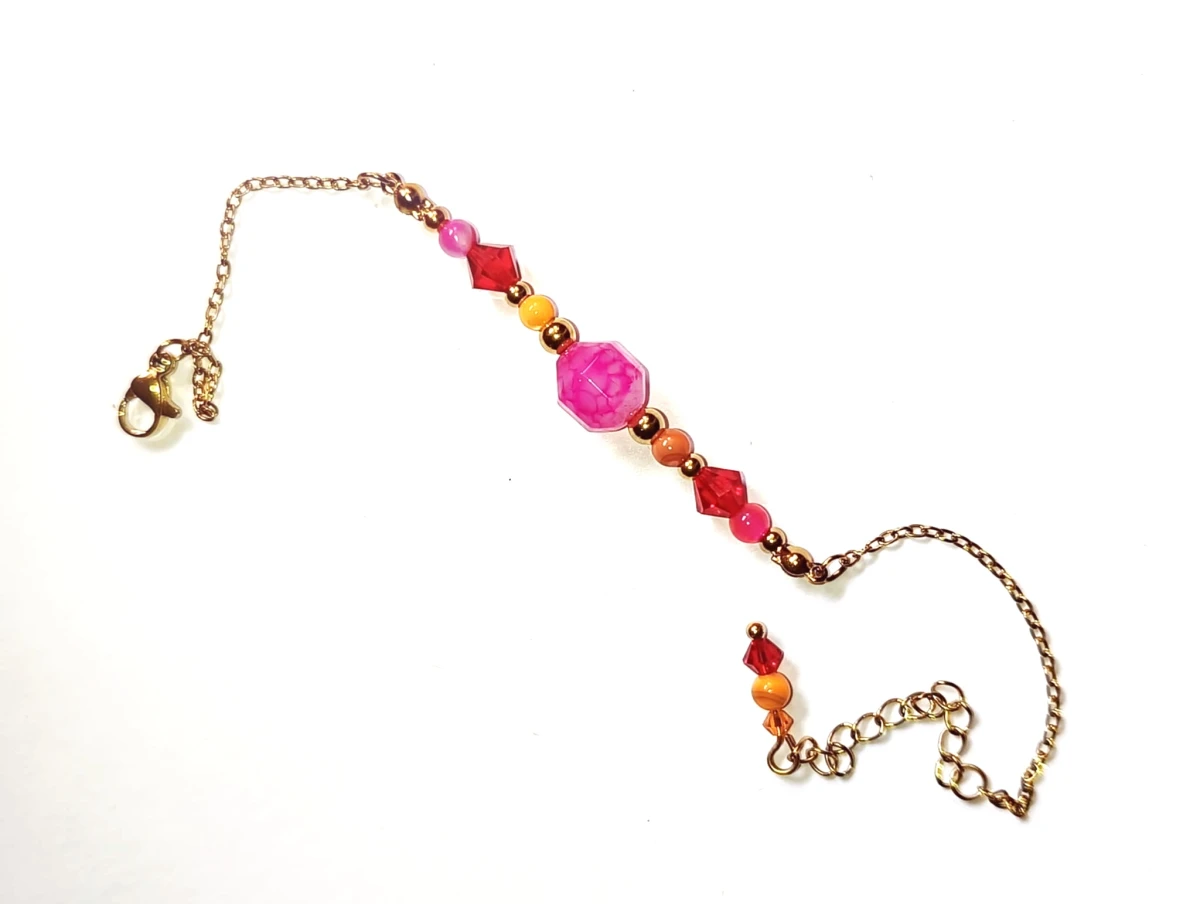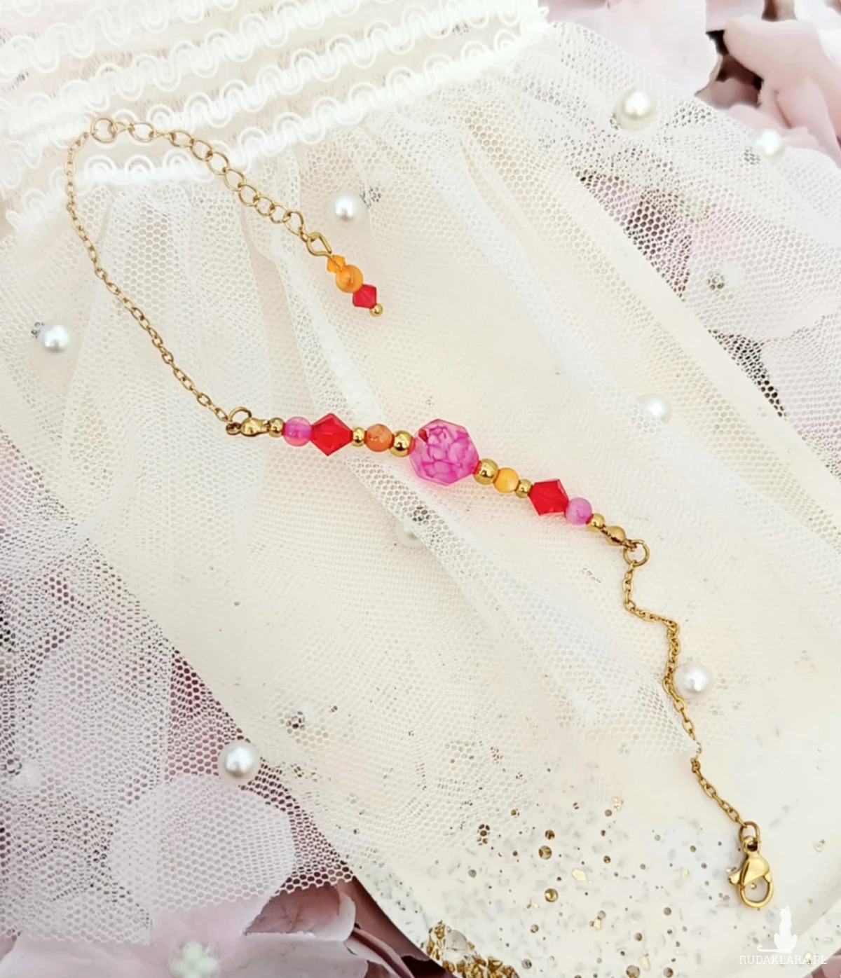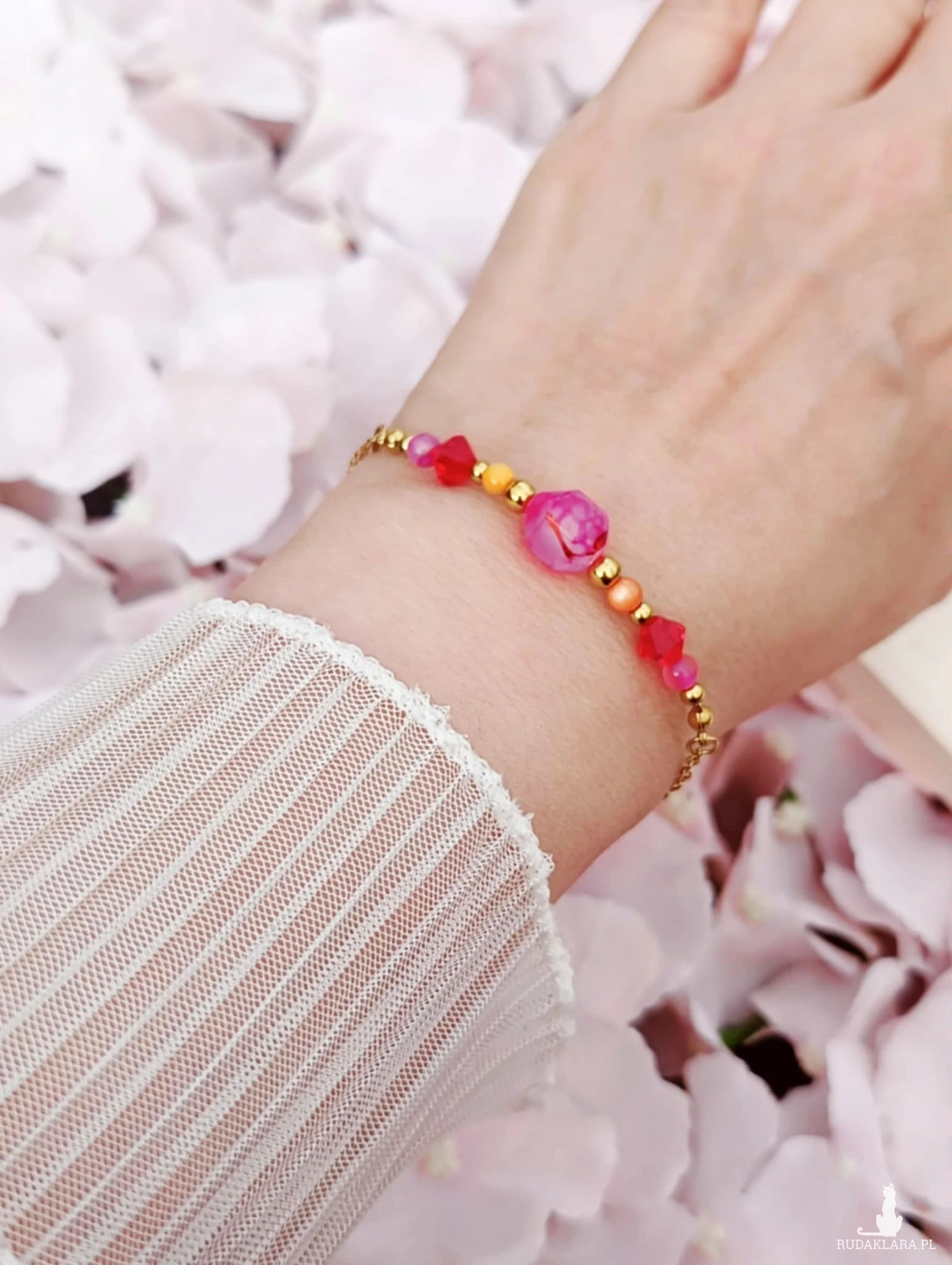 Delikatna bransoletka na łańcuszku ze stali chirurgicznej z powłoką odporną na ścieranie. Jej sercem jest duży, fasetowany agat w intensywnym odcieniu. Towarzyszą mu masa perłowa, kryształki Swarovski oraz drobny agat – wszystko w lekkiej, świeżej kompozycji.