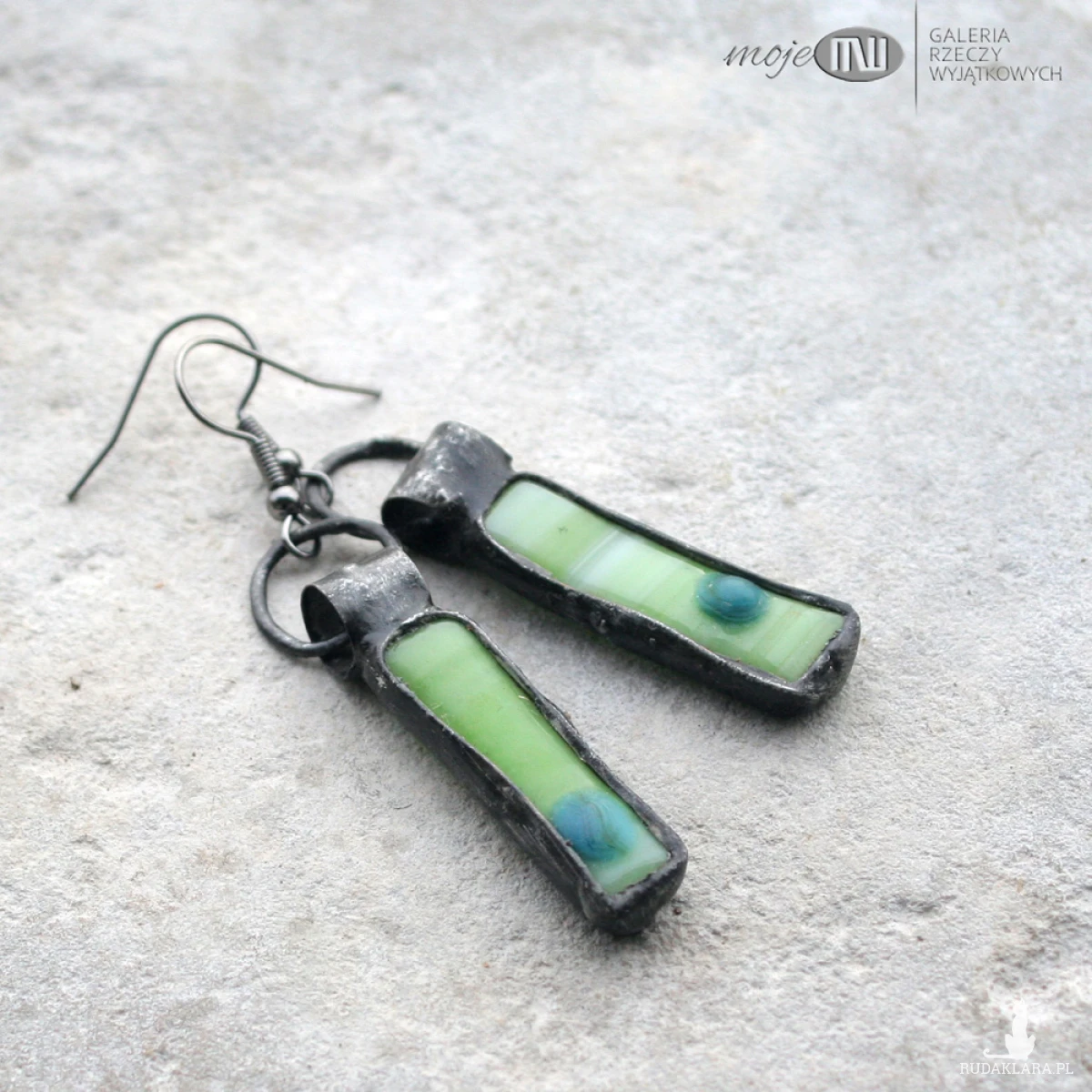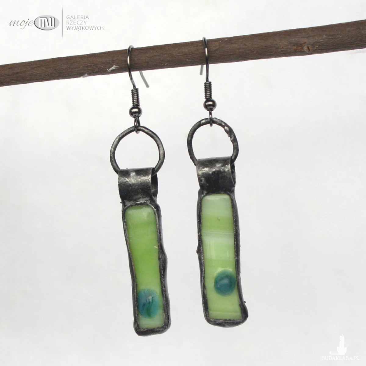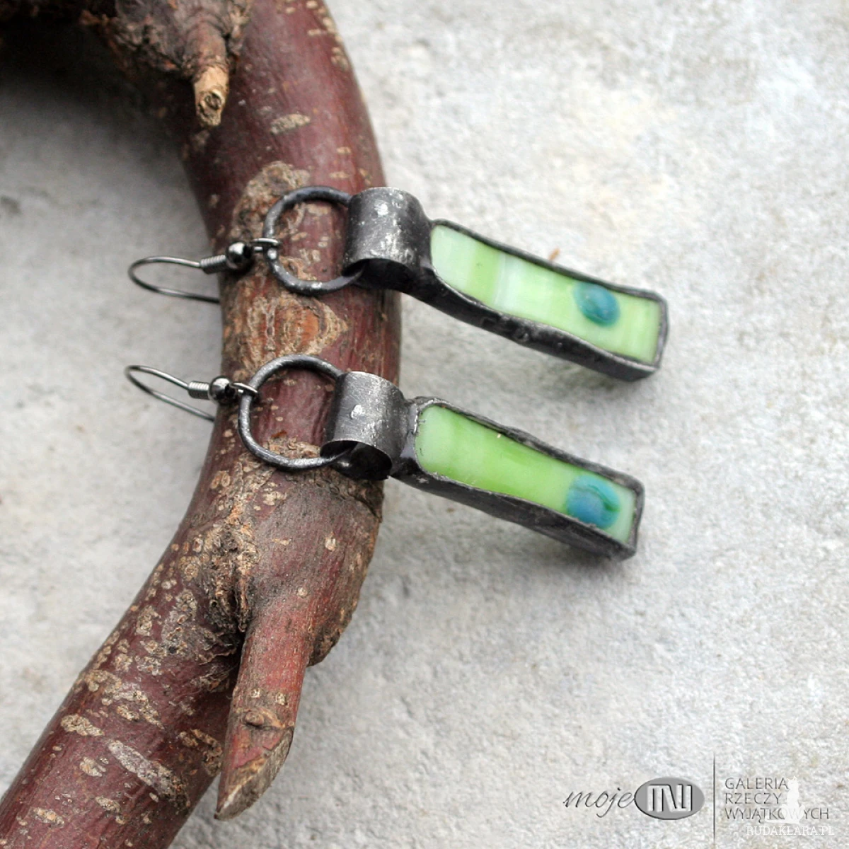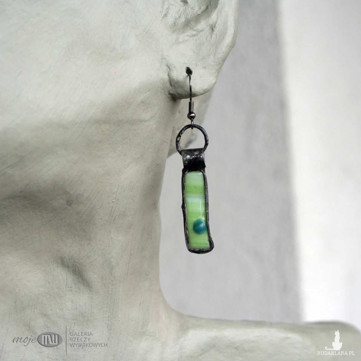 Kolczyki z zielonego szklanego, podłużnego paluszka, wytopionego przeze mnie metodą fusingu. Całość oprawiona w miedź - cynowaną, patynowaną i przecieraną.