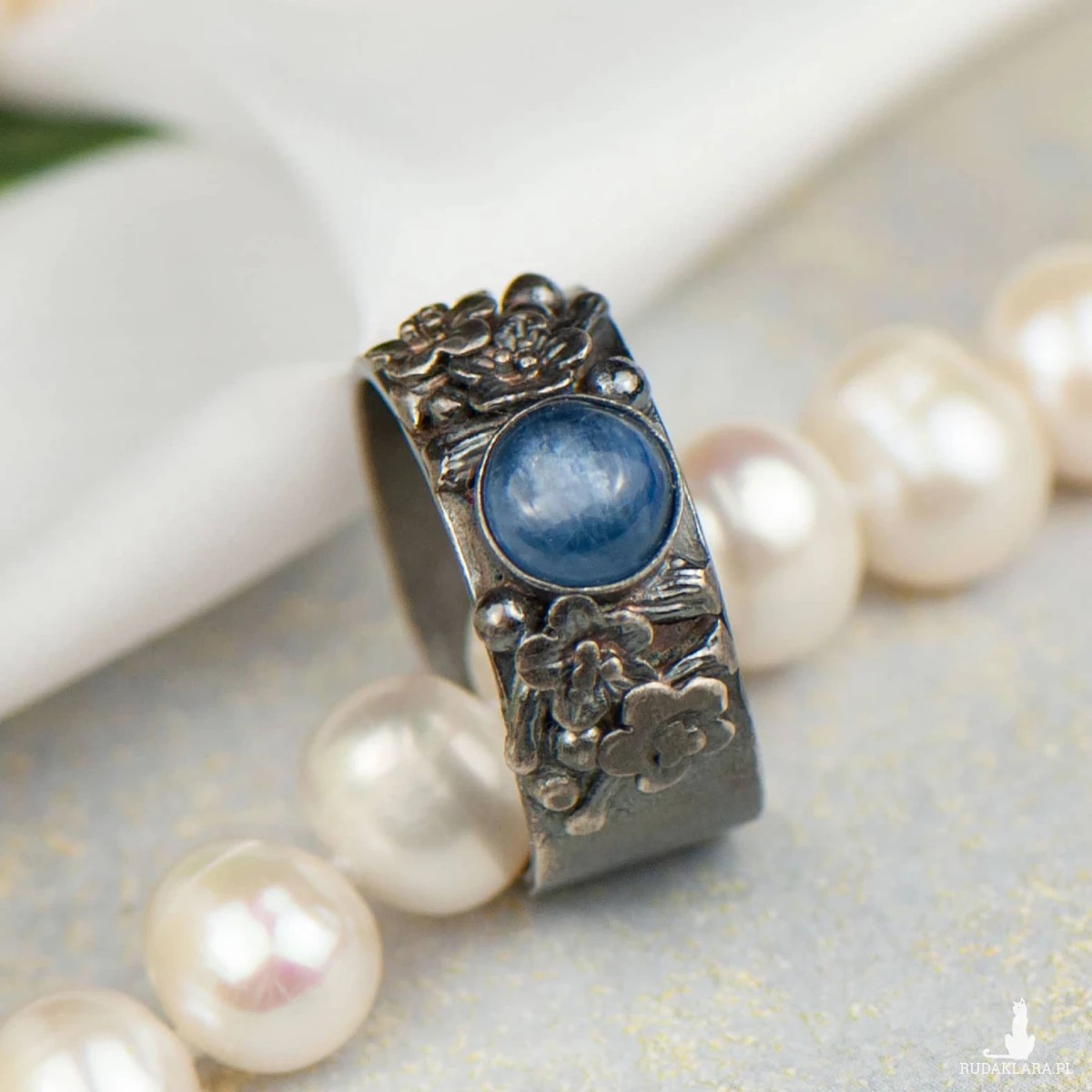 Odkryj wyjątkowy model srebrnej obrączki z okrągłym kianitem Artseko. Ręcznie wykonany pierścionek ze srebra został wykończony delikatnymi kwiatami, które kontrastują z surowym wyglądem kamienia. Kamień ma 6 milimetrów średnicy i osadzony jest na srebrnej obrączce o szerokości 9 milimetrów. Srebro próby 925 w celu uzyskania niepowtarzalnego efektu było czernione i miejscowo przecierane. Pierścionek będzie z pewnością trafionym prezentem dla osoby, która ceni sobie połączenie elegancji z naturą.