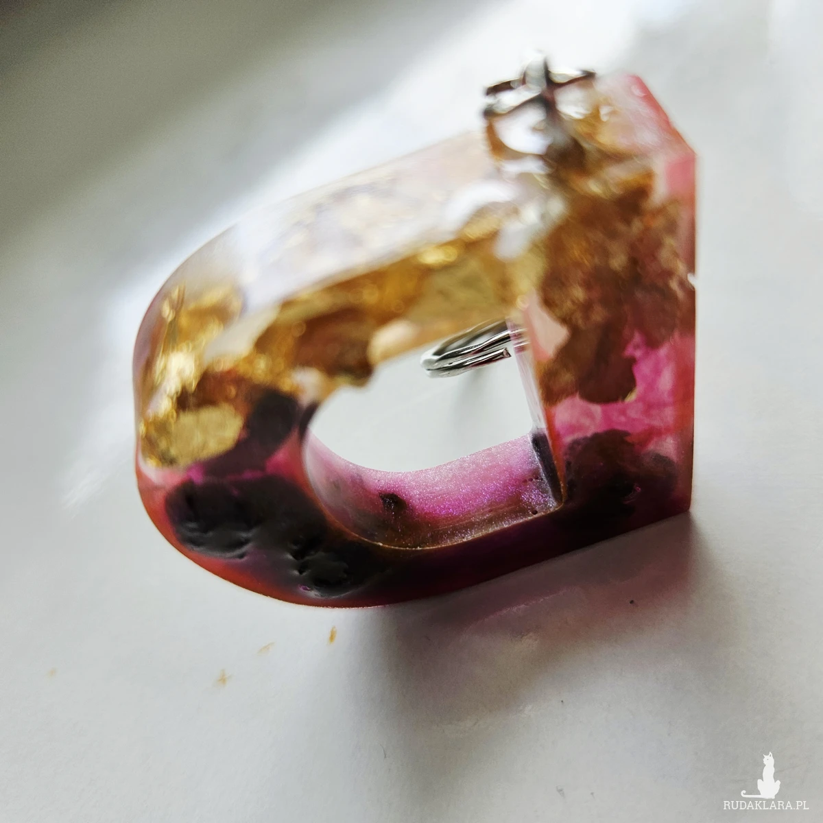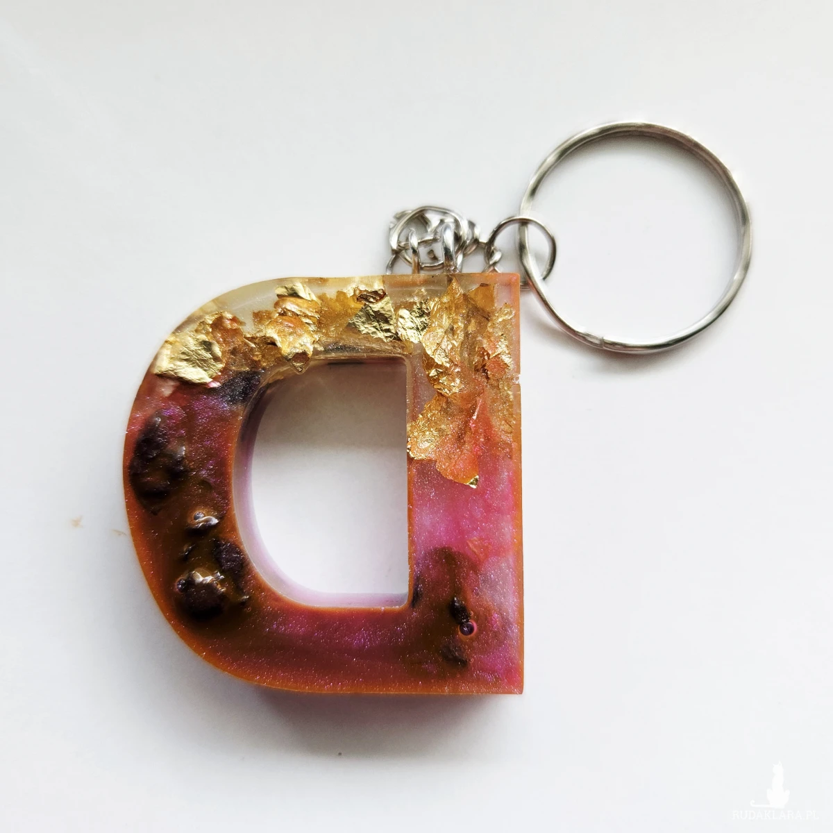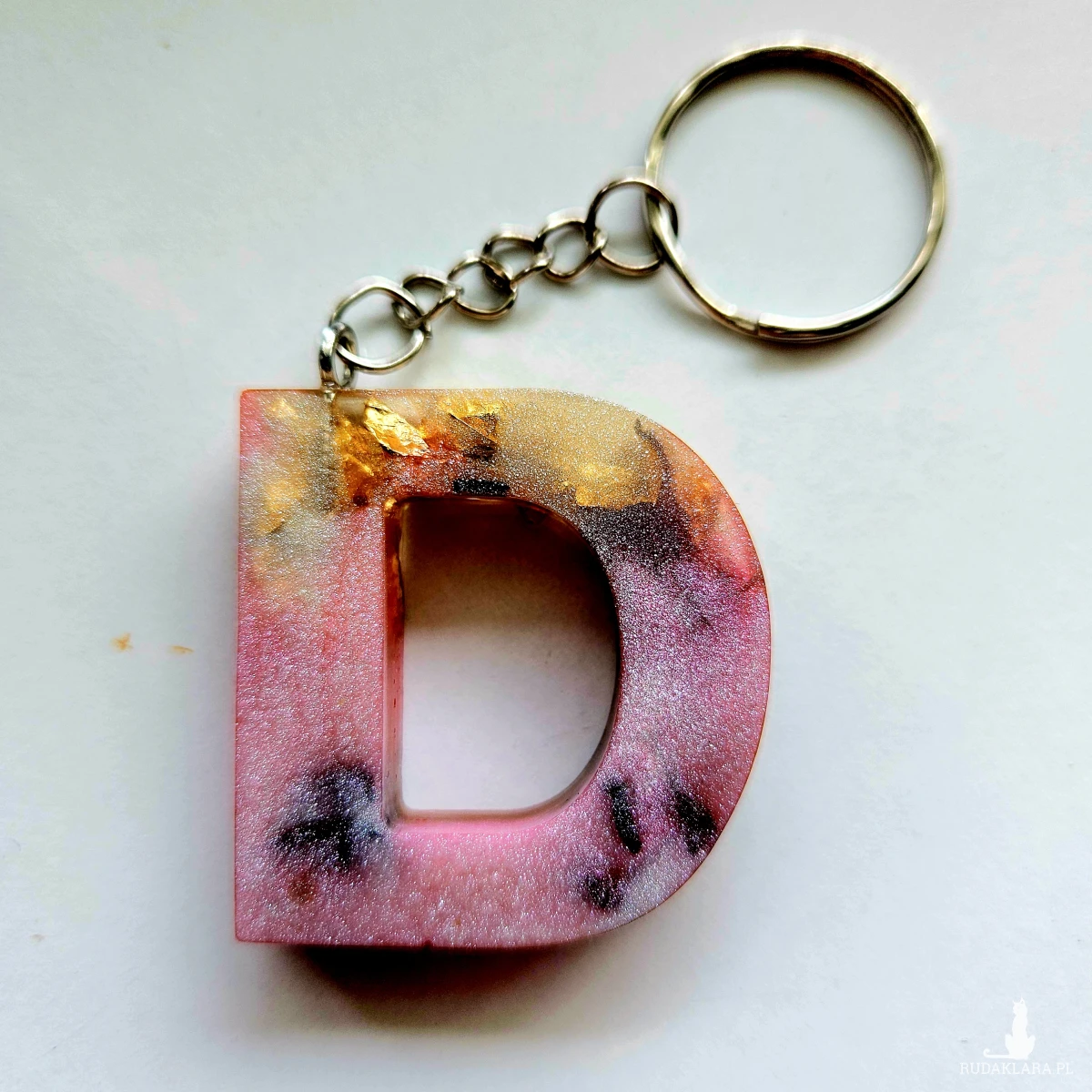 Brelok literka D z żywicy różowa z złotem I kwiatem
