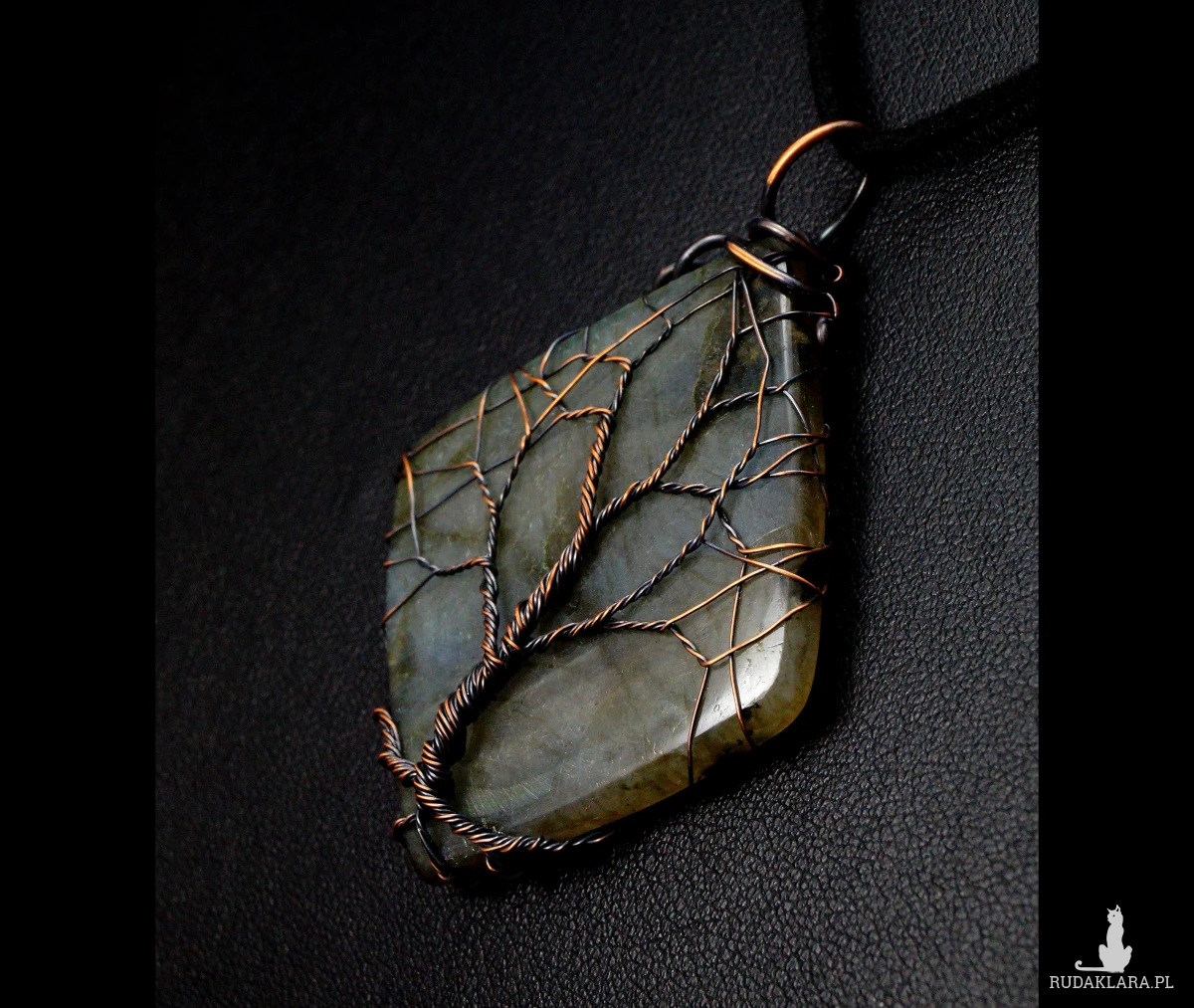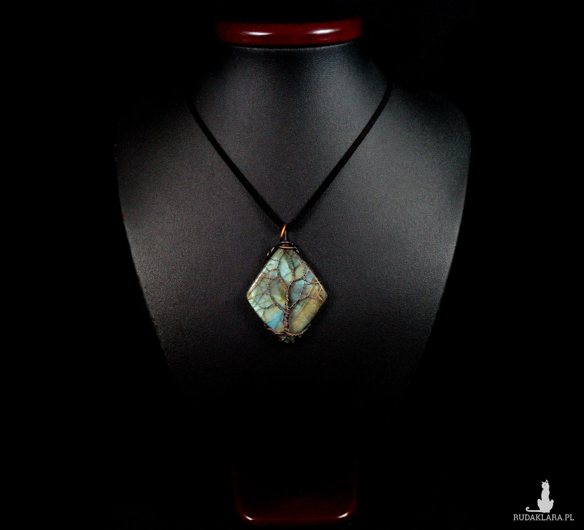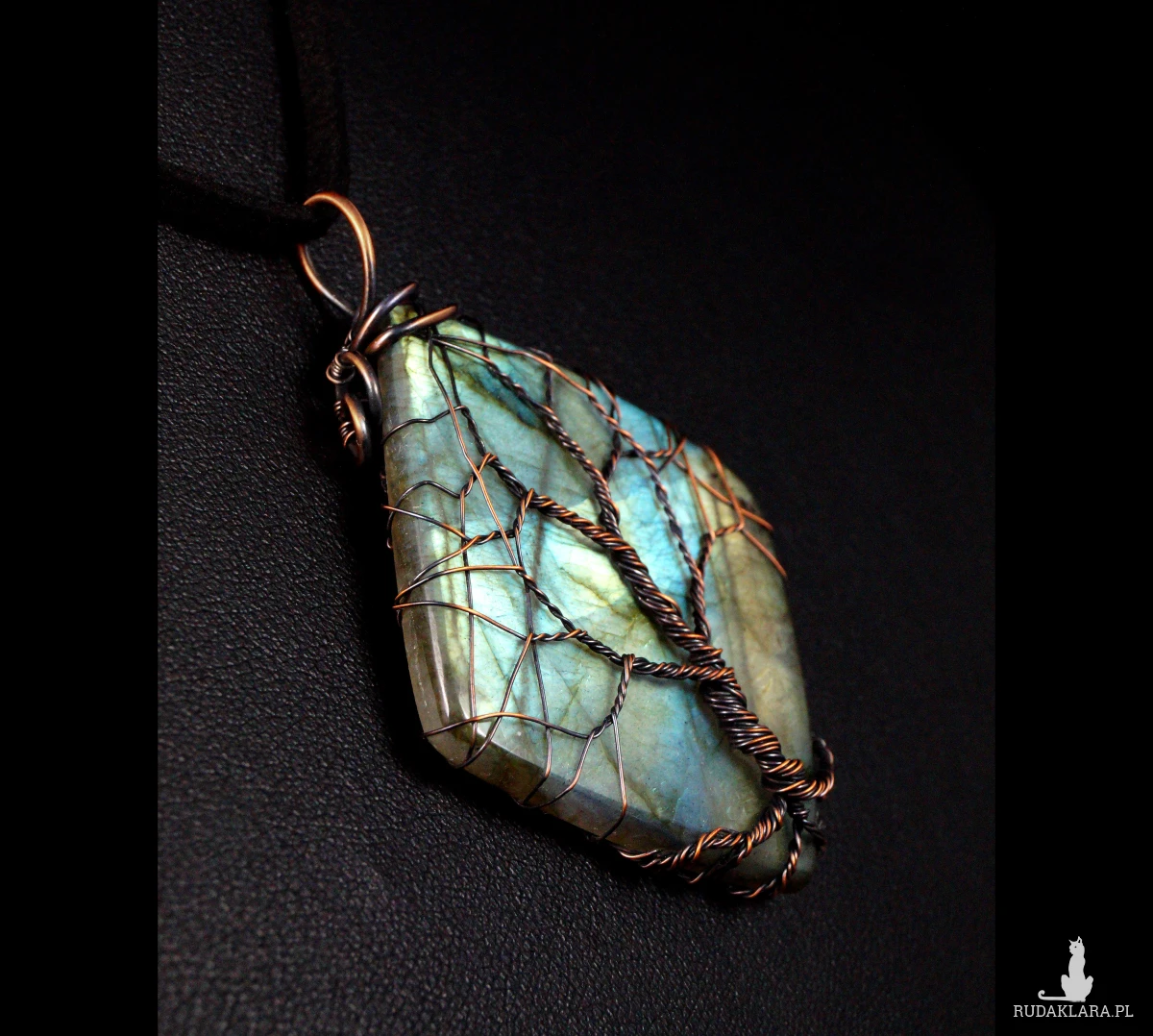 Bajeczny, misternie pleciony, wisior z zielono niebieskim kaboszonem labradorytu drzewko szczęścia. Wisior zaprojektowany i wykonany przeze mnie od podstaw bardzo pracochłonną i precyzyjną techniką wire-wrapping z patynowanej miedzi. Miedź polerowana i przecierana.