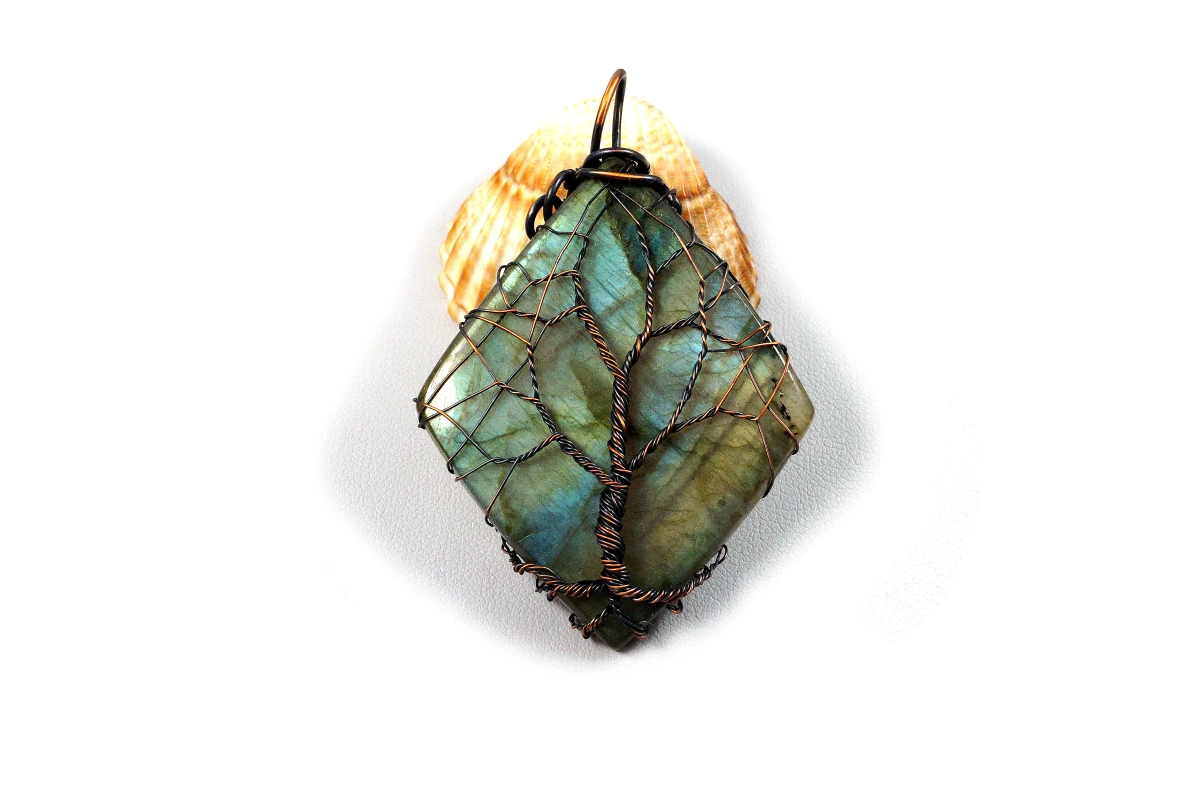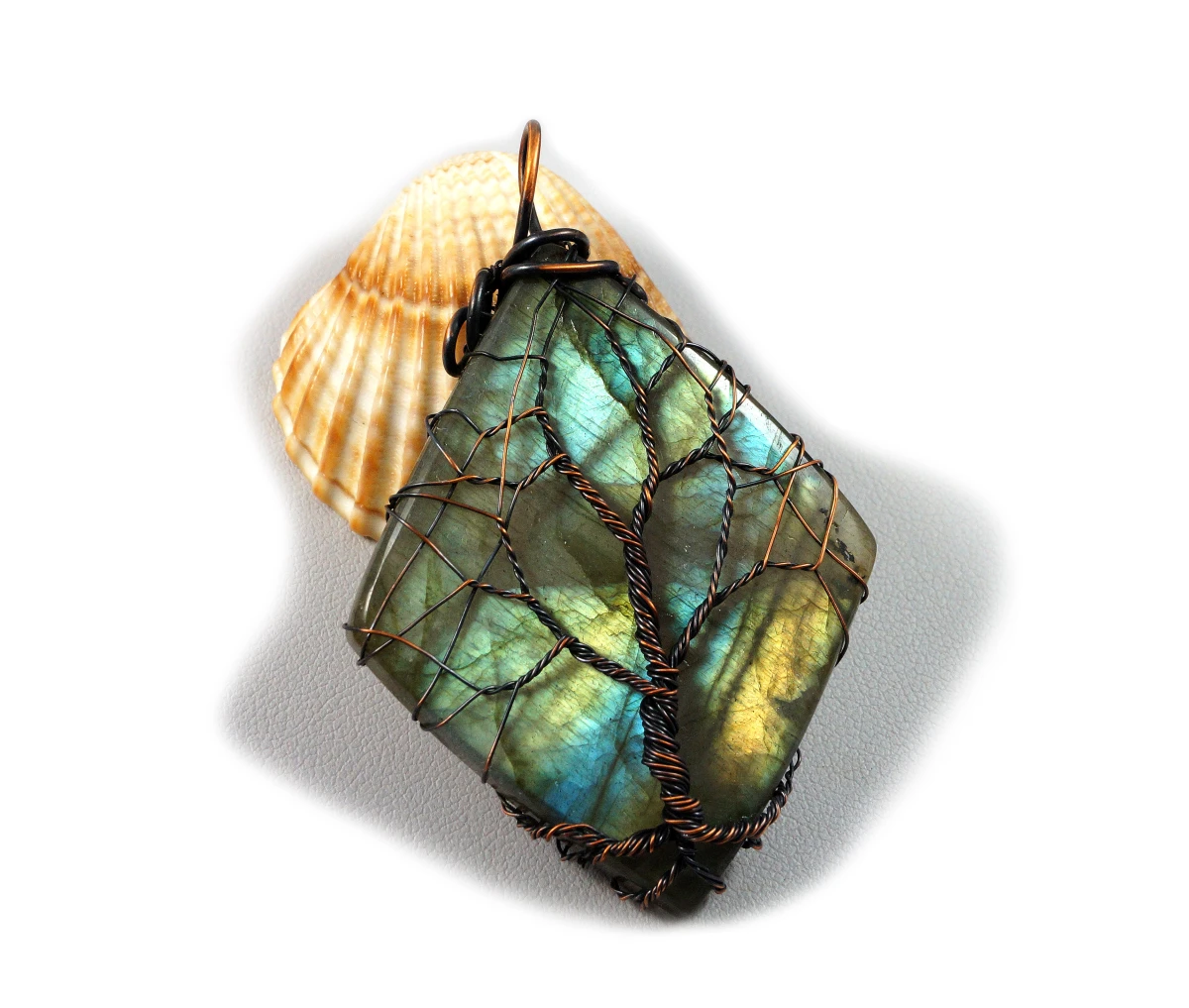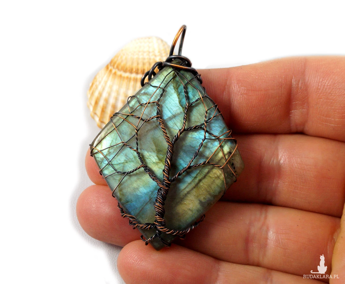 Bajeczny, misternie pleciony, wisior z zielono niebieskim kaboszonem labradorytu drzewko szczęścia. Wisior zaprojektowany i wykonany przeze mnie od podstaw bardzo pracochłonną i precyzyjną techniką wire-wrapping z patynowanej miedzi. Miedź polerowana i przecierana.