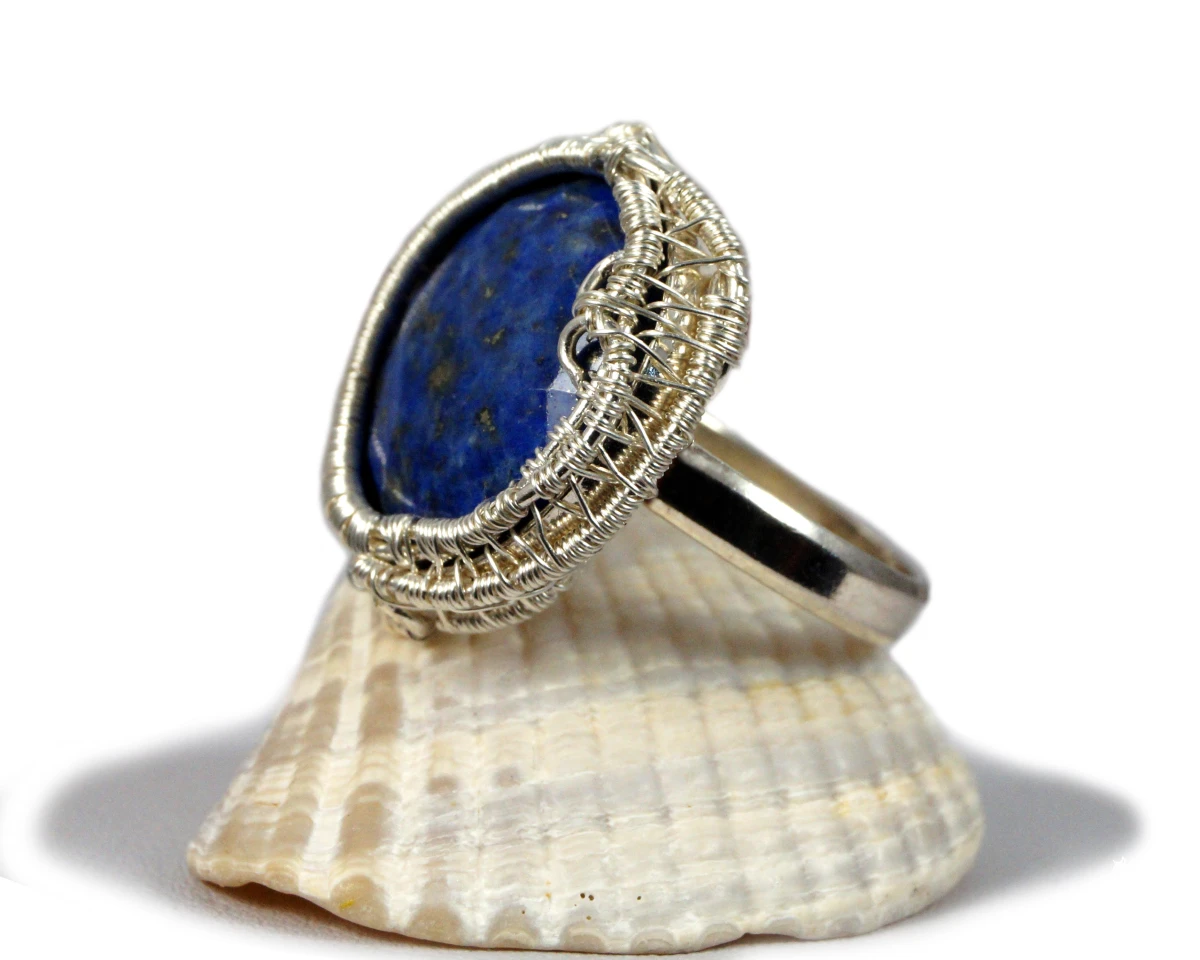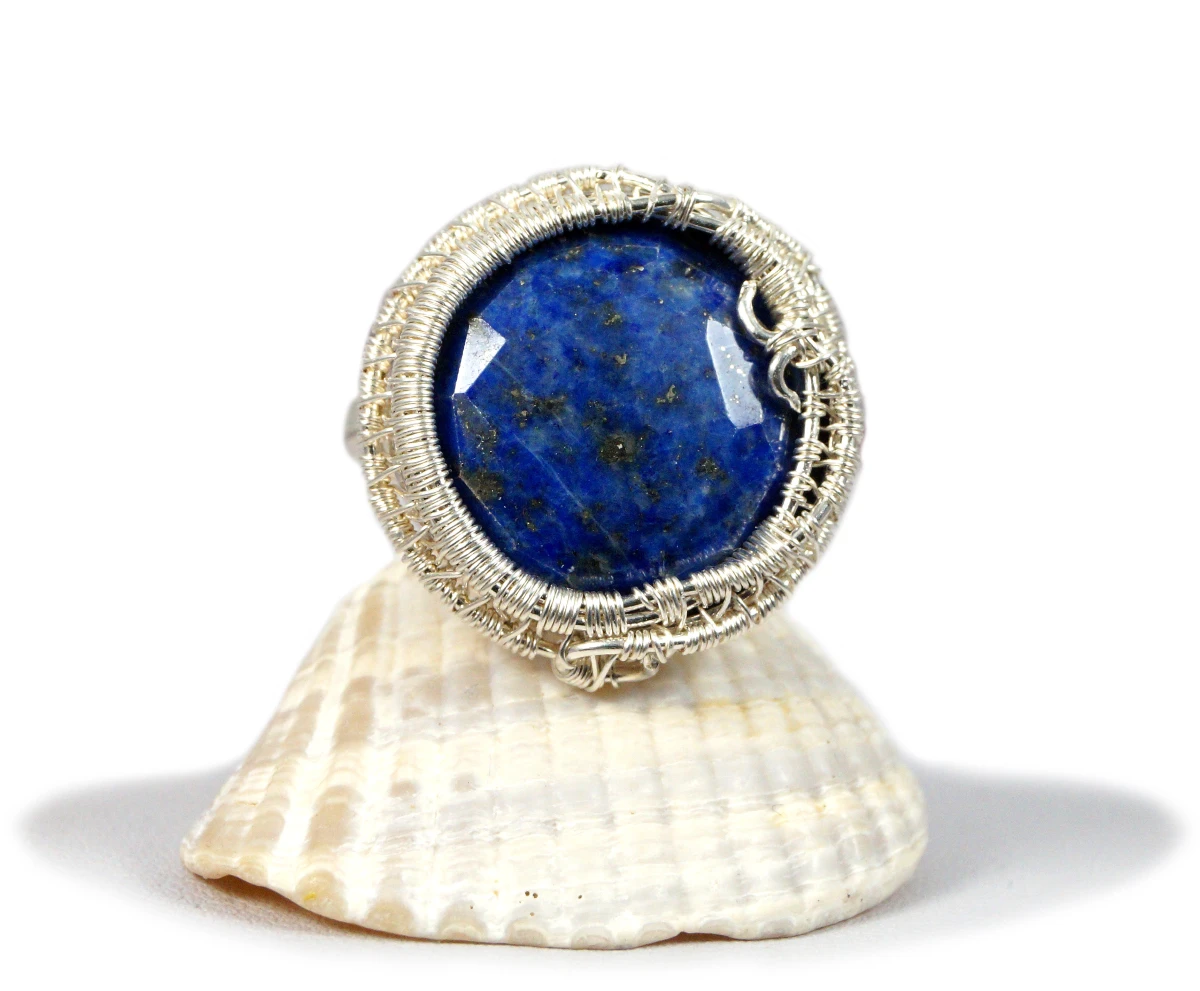 Misternie wykonany pierścionek z fasetowanym kaboszonem lapis lazuli w niebiesko złotym kolorze.