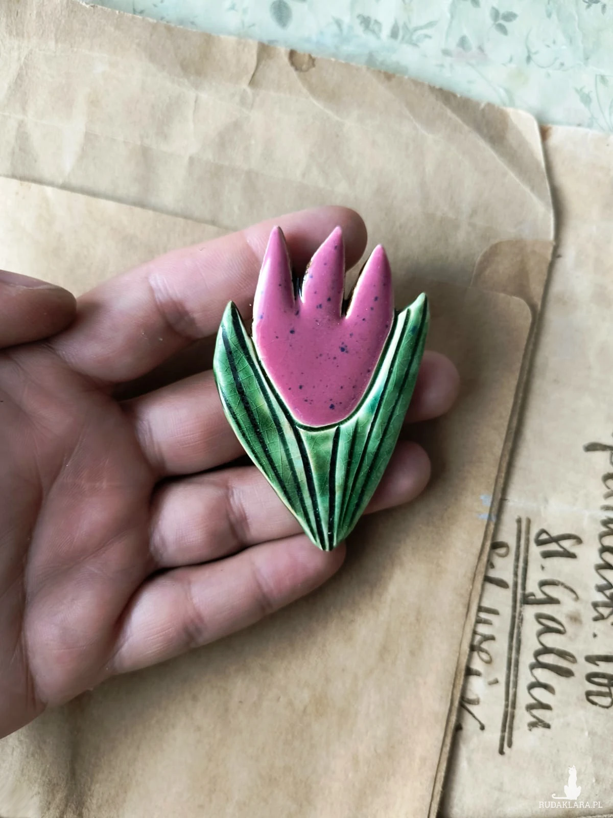 Broszka ceramiczna w postaci tulipana o wymiarach ok 5 cm x 6,5 cm, wykonana z gliny szamotowej wypalona na biskwit, a następnie szkliwiona w temp ok 1260 stopni C. polecam serdecznie.