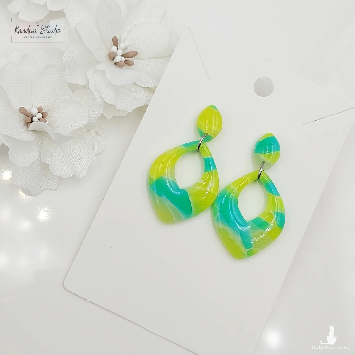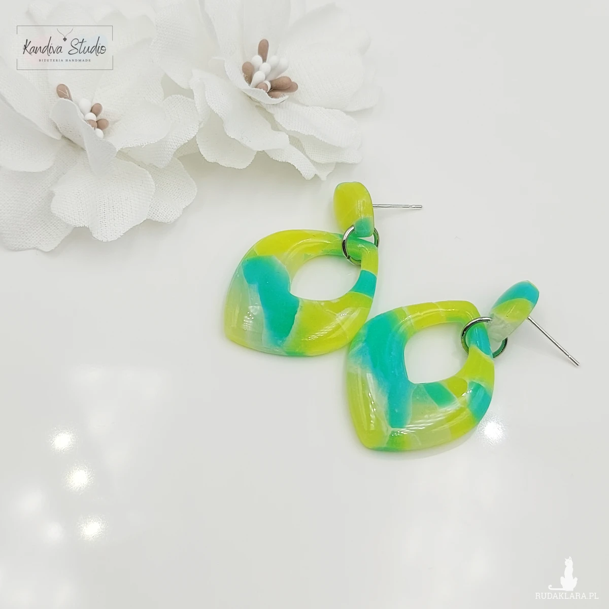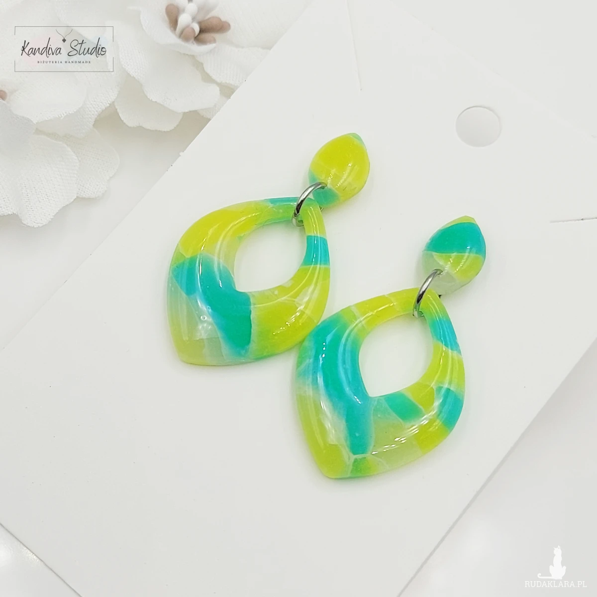 Lekkie kolczyki z glinki polimerowej w kolorach: żółty i morska zieleń.