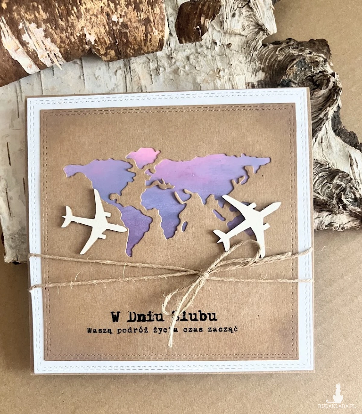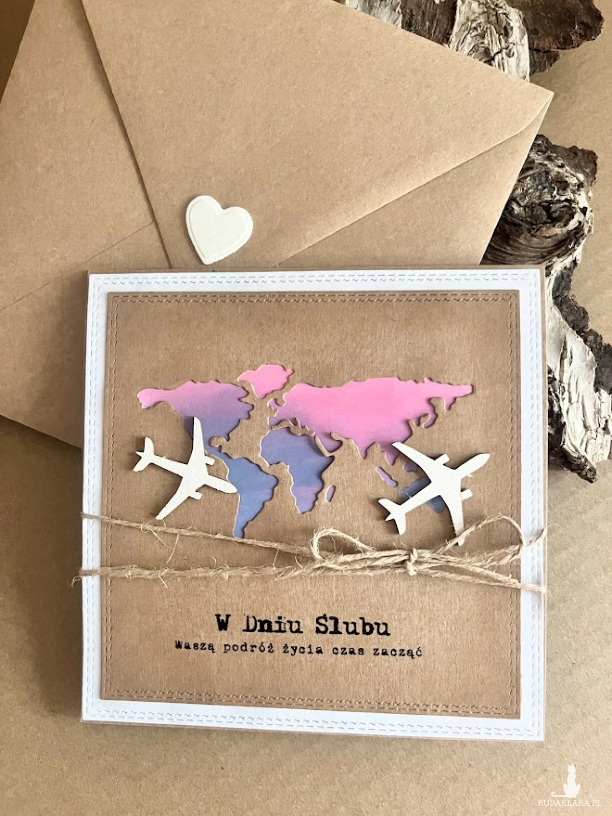 Kartka z okazji Ślubu dla Młodej Pary , która kocha podróże i wybiera się w szczęśliwą podróż przez wspólne życie z urokliwymi samolotami.. Komplet: koperta i kartka stworzona na bazie papieru scrapowego kraftowego,który przełamuje dodatek w kolorze złamanej bieli. Kartka ma wymiary 14 x 14, koperta ma wymiary 15,5 x 15,5. Całość obwiązana sznurkiem z tagiem – biletem .W środku kartki znajduje się miejsce z gotowymi życzeniami do własnoręcznego podpisu oraz umieszczono kieszonkę na małe co nieco lub kupon lotto. W tej postaci produkt dostępny od ręki .Pozdrawiam