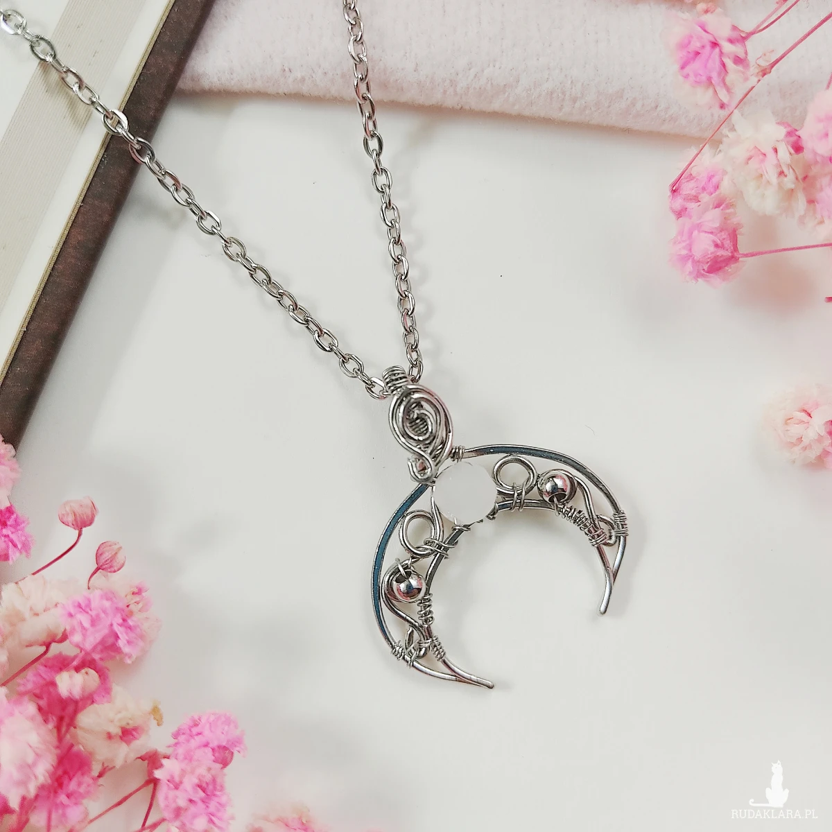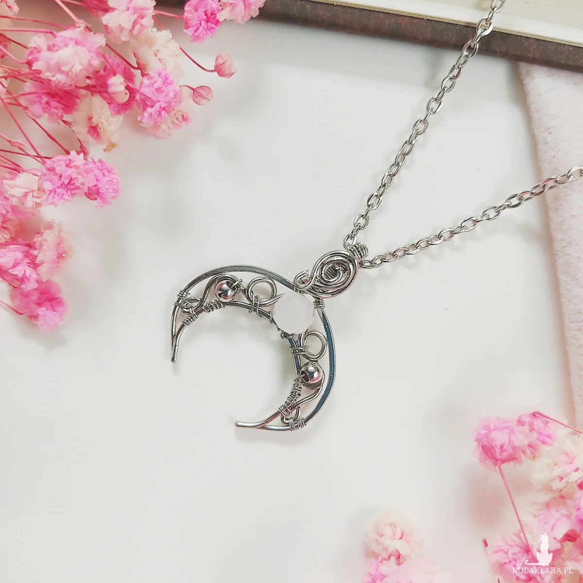 Naszyjnik Lunula Kamień Księżycowy ręcznie robiony. Wykonany techniką wire wrapping z drutów ze stali chirurgicznej.