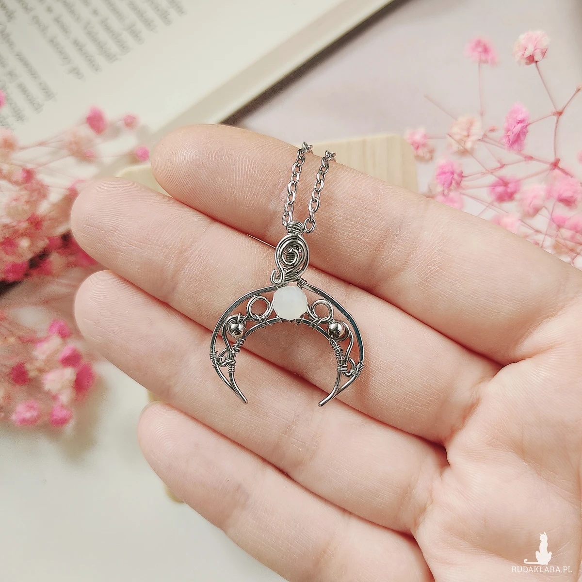 Unikalny naszyjnik w kształcie lunuli z naturalnym kamieniem księżycowym, wykonany ręcznie metodą wire wrapping z trwałej i hipoalergicznej stali chirurgicznej. Symbol lunuli, od wieków kojarzony z kobiecą energią, płodnością i ochroną, w połączeniu z subtelnym blaskiem kamienia księżycowego tworzy wyjątkową biżuterię pełną symboliki.